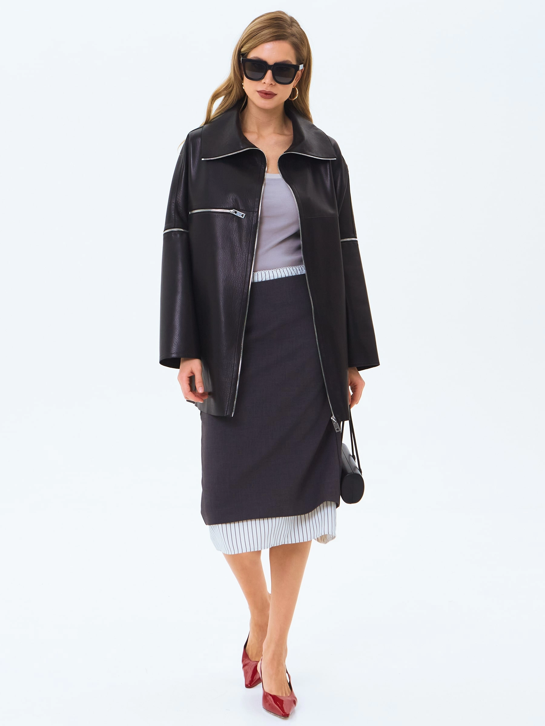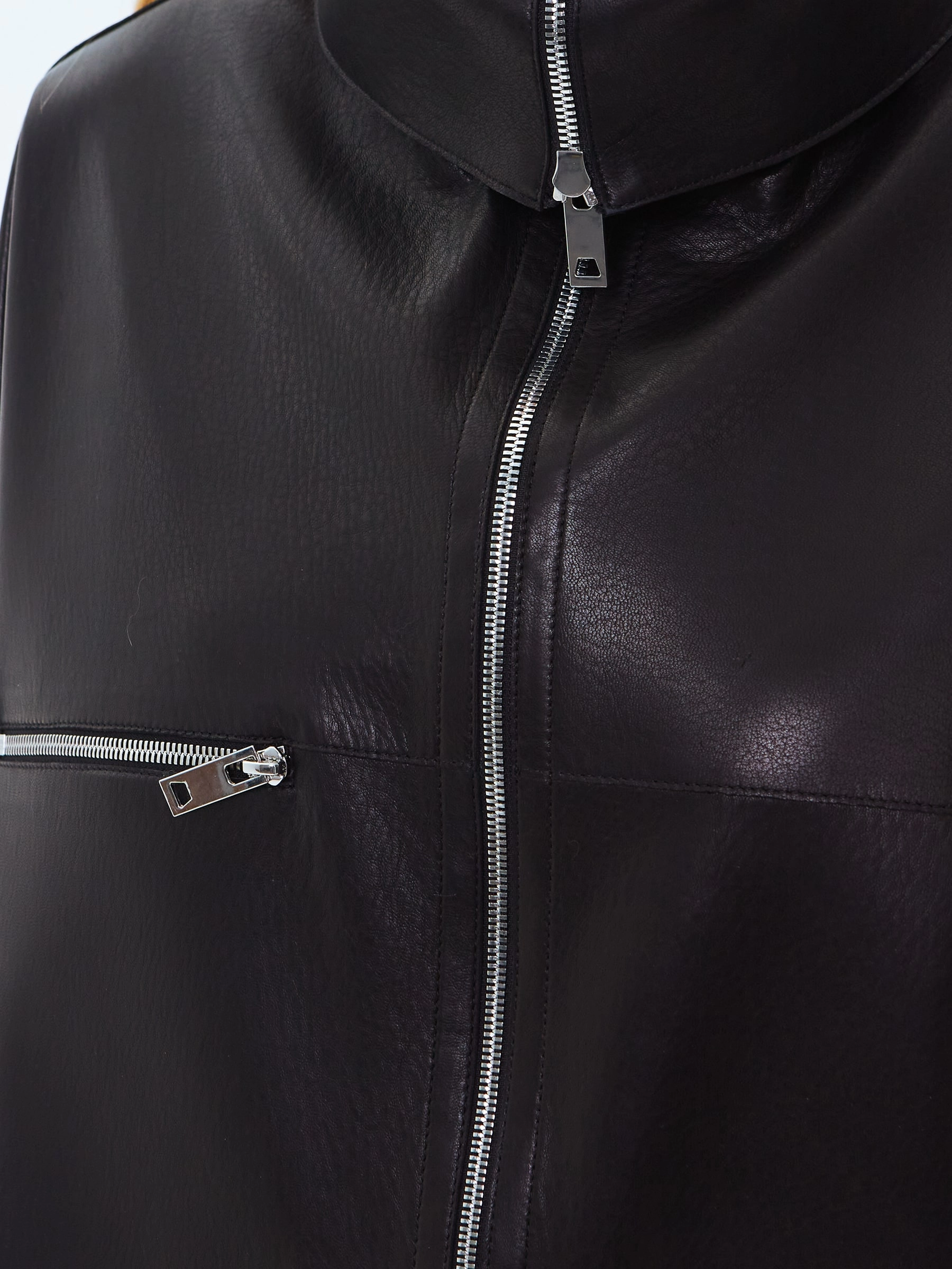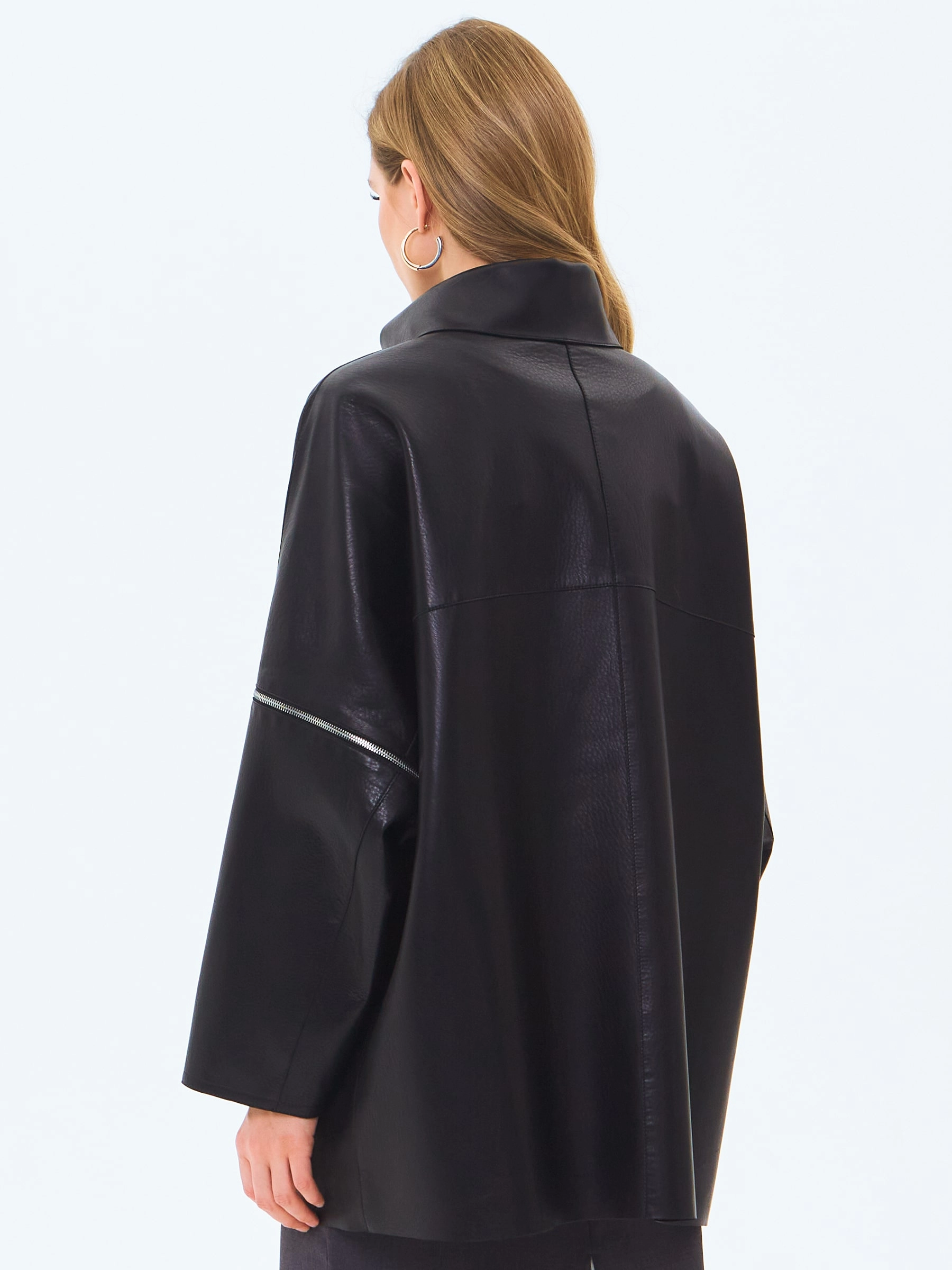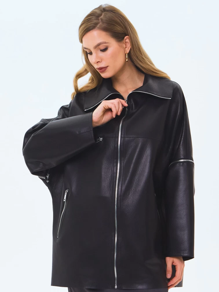 Эта модель может послужить не только как куртка, но и как отличным жакетом. Изделие выполнили из натуральной кожи премиум класс. Свободный крой. Широкий рукав-трансформер. Отложной воротник может легко изменить форму в виде стойки. Куртку-жакет дополнили удобными карманами застегивающиеся крупными молниями.