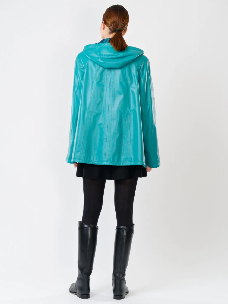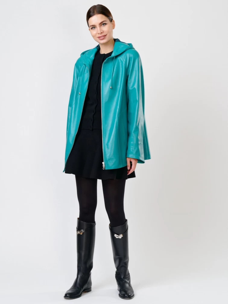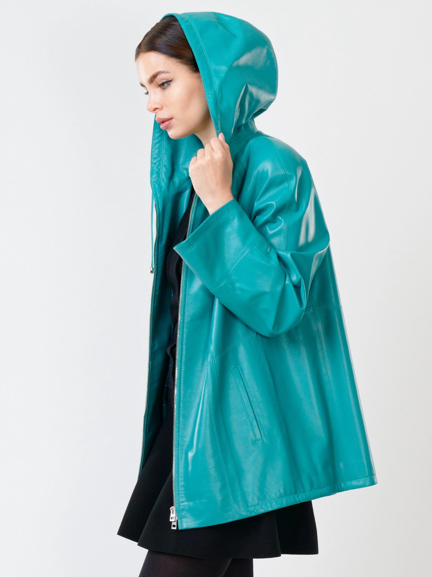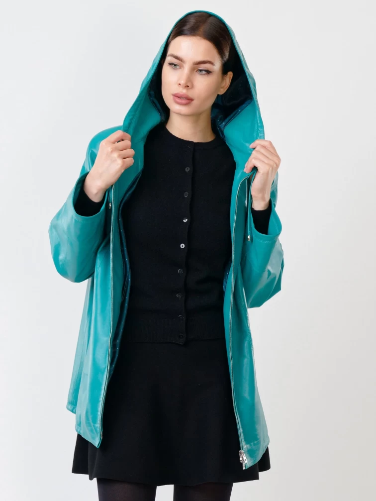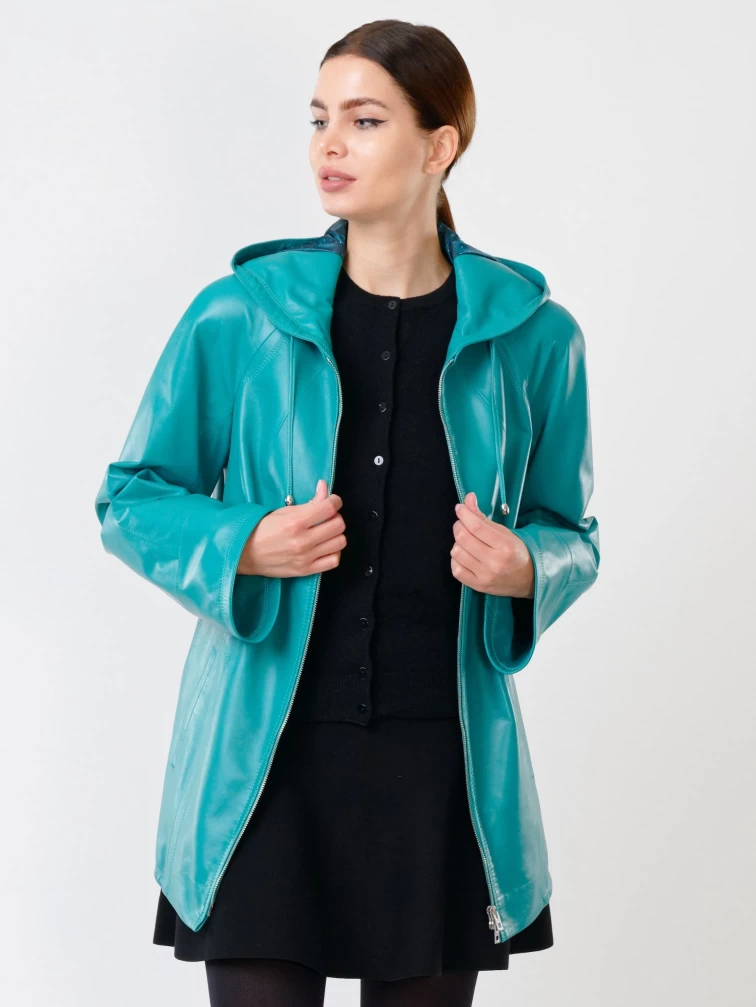 Товар кожаная женская куртка оверсайз с капюшоном 383, бирюзовая, размер 52, артикул 90740 выполнен из натуральной кожи с застежкой молния. Рассчитан на сезон: демисезон. Длина изделия 74 см, силуэт трапеция.
