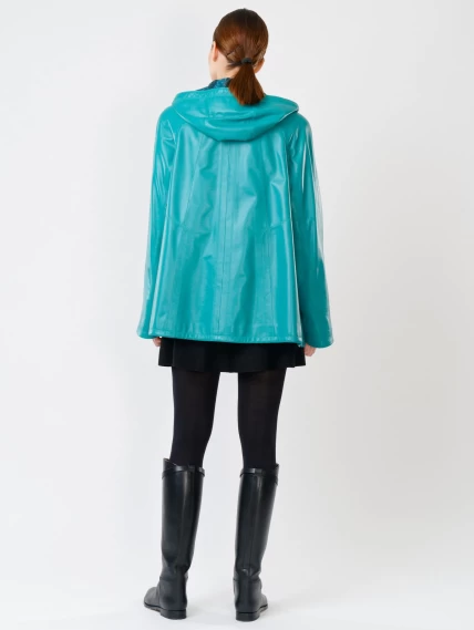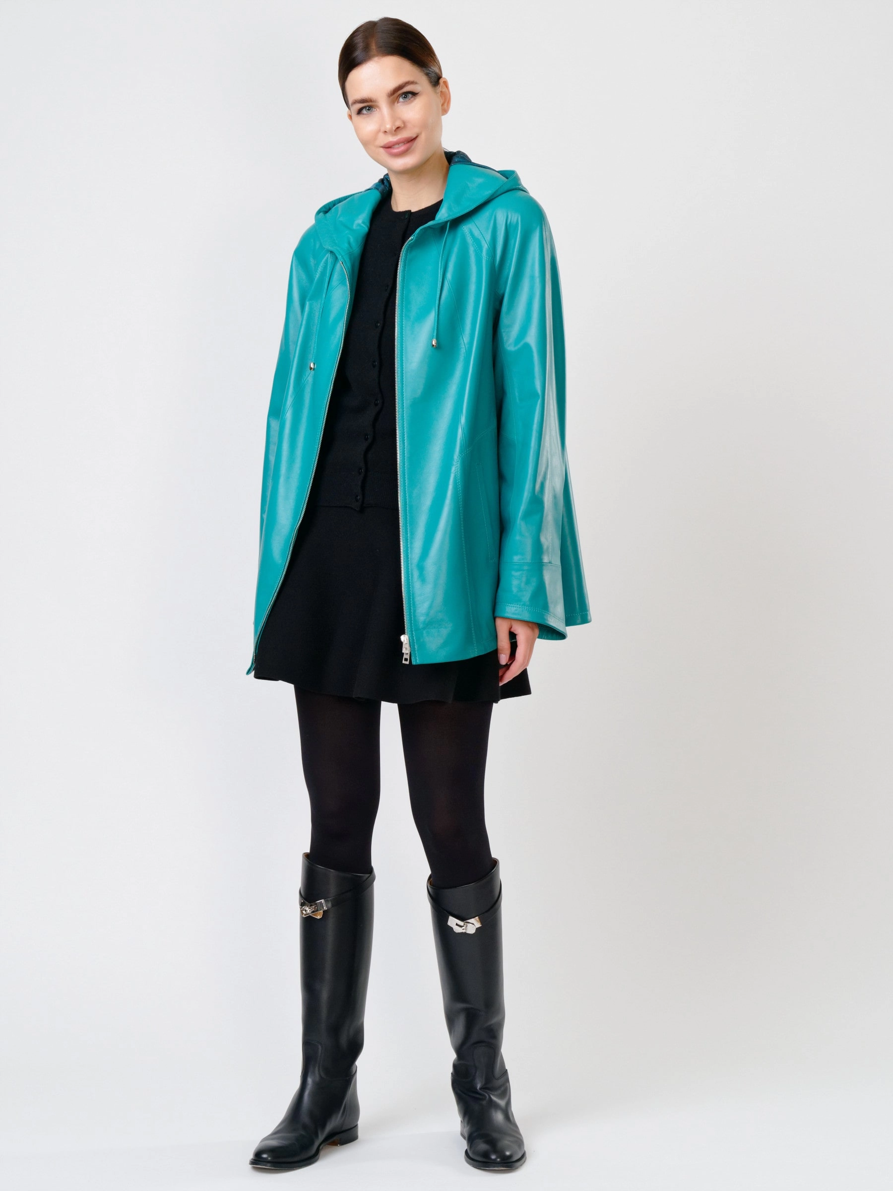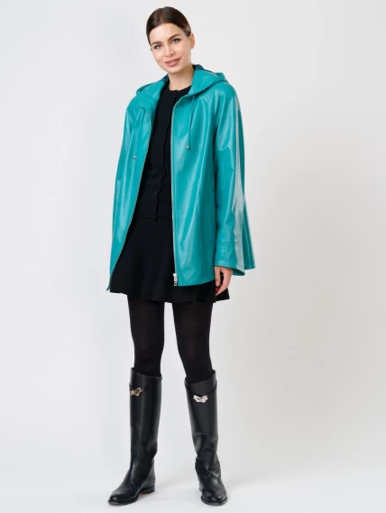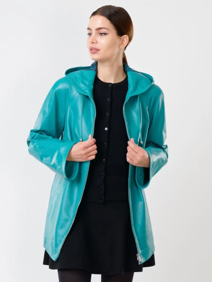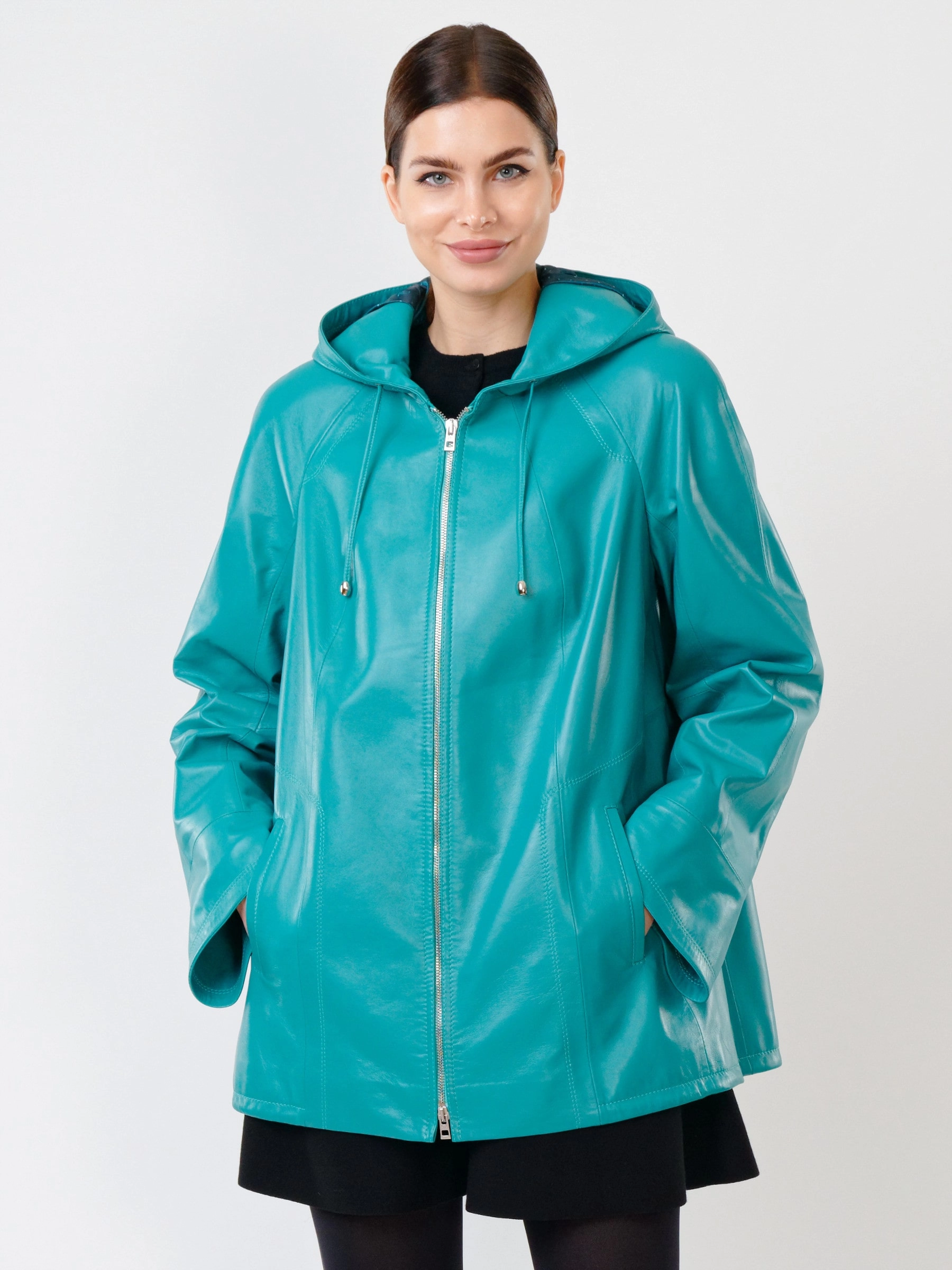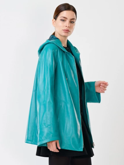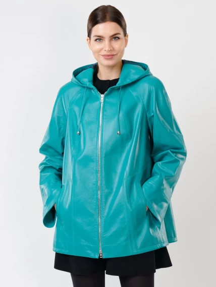 Кожаная женская куртка оверсайз с капюшоном 383, бирюзовая, размер 52, артикул 90740