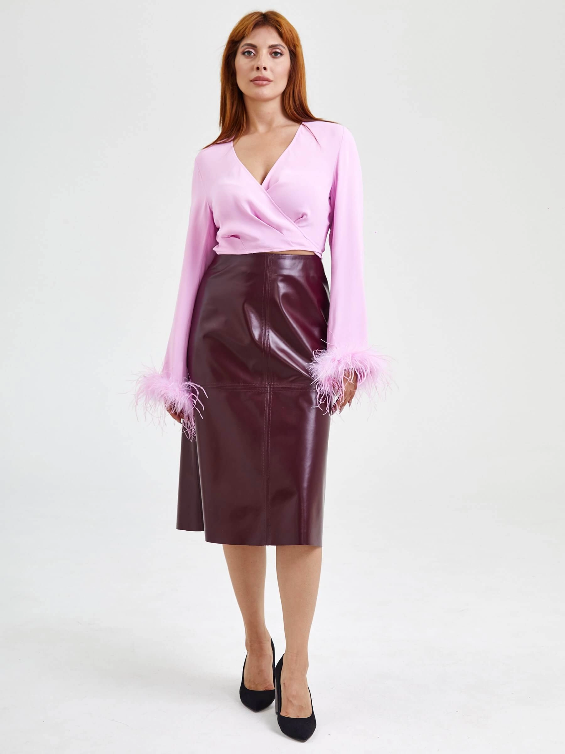 Кожаная юбка миди 09, бордовая, размер 44, артикул 85570