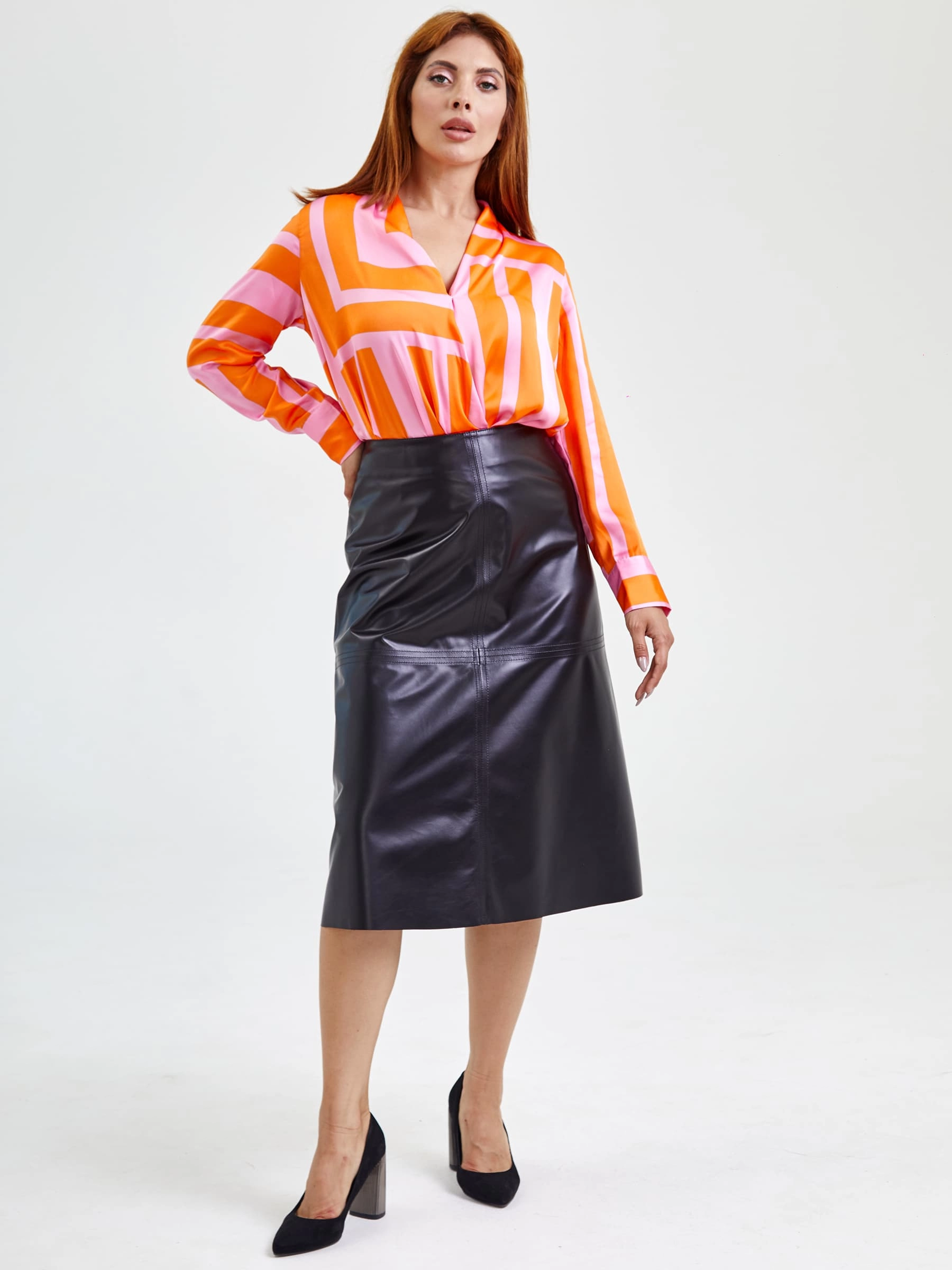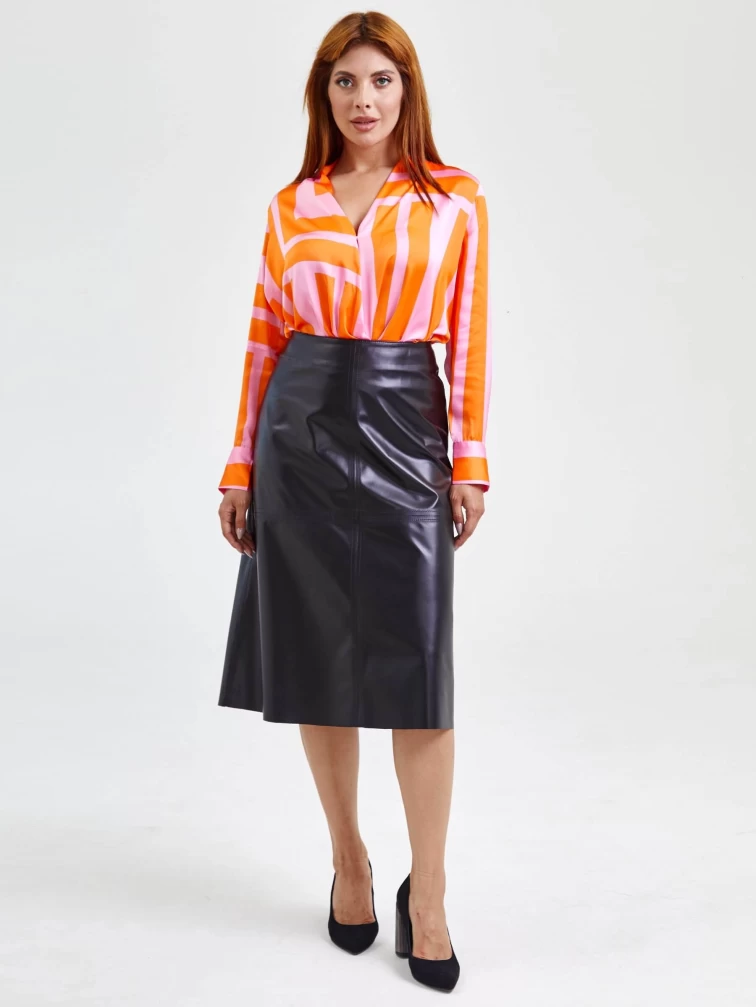 Юбка-миди из натуральной чёрной кожи воплощает эталон элегантности и итальянское качество. Глубокий насыщенный чёрный цвет с благородным матовым блеском подчёркивает премиальную фактуру кожи, которая идеально облегает фигуру. Расклешённый крой А-силуэта создаёт женственный силуэт — длина 76 см обеспечивает идеальный баланс, прикрывая колени и открывая щиколотки. Удлинённая линия пояса мягко корректирует талию, а боковая молния сохраняет чистоту линий. Сочетайте с белоснежной блузой для офиса, с объёмным свитером для города или с атласным топом для вечера — эта чёрная кожаная юбка станет универсальной основой гардероба на все сезоны, подчёркивая ваш безупречный вкус и статус.