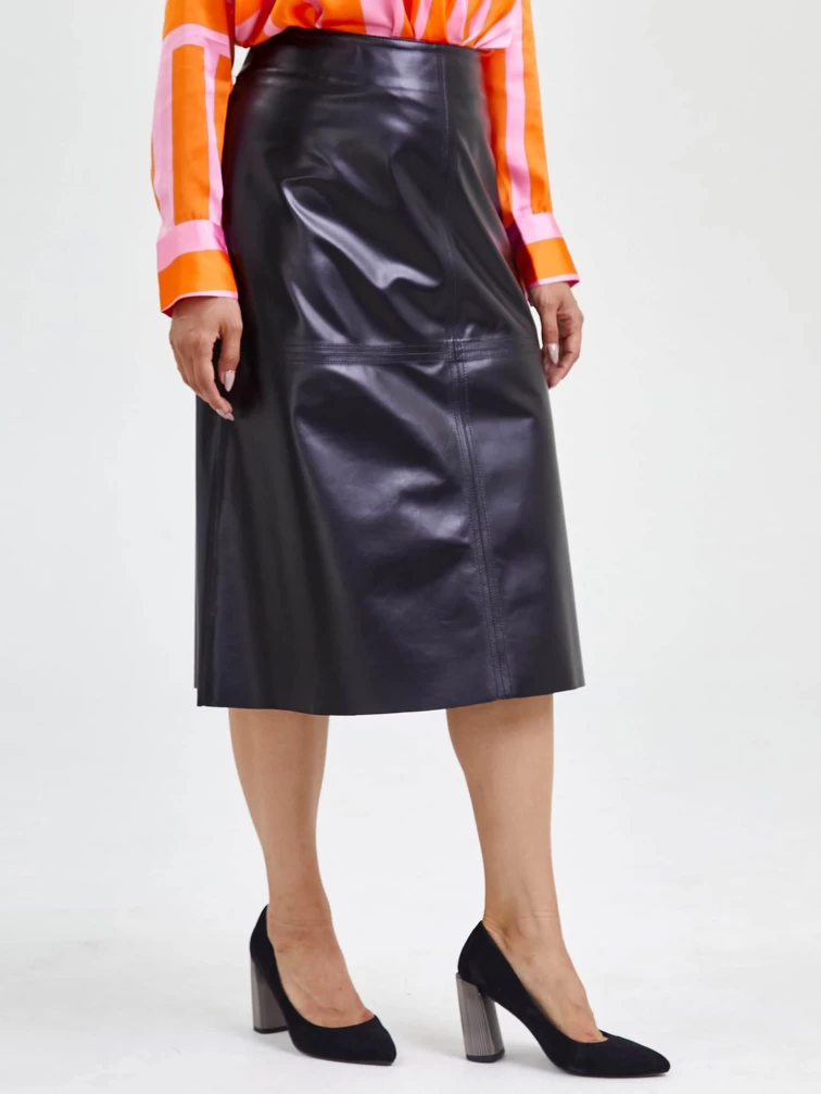 Кожаная юбка миди 09, черная, размер 46, артикул 85560