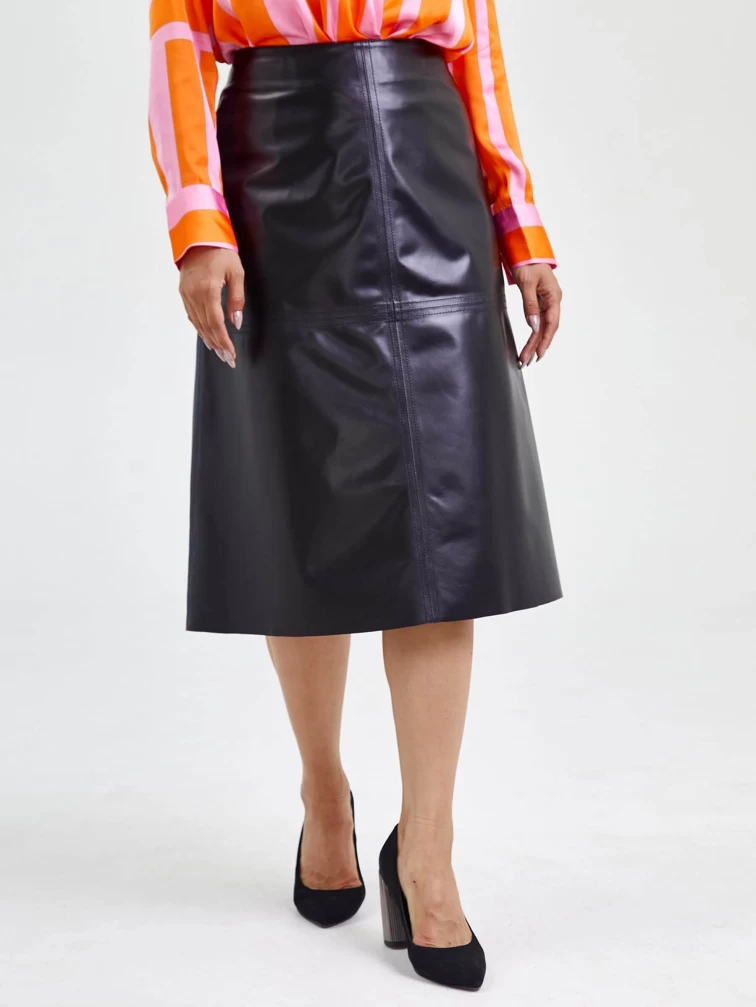 Товар кожаная юбка миди 09, черная, размер 46, артикул 85560 выполнен из натуральной кожи с застежкой молния. Рассчитан на сезон: демисезон. Длина изделия 76 см, силуэт расклешенный.