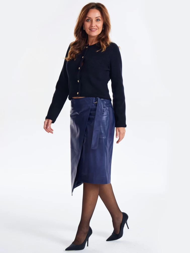 Товар кожаная юбка миди с запахом 07, синяя, размер 48, артикул 86372 выполнен из натуральной кожи с застежкой молния. Рассчитан на сезон: демисезон. Длина изделия 65 см, силуэт прямой.