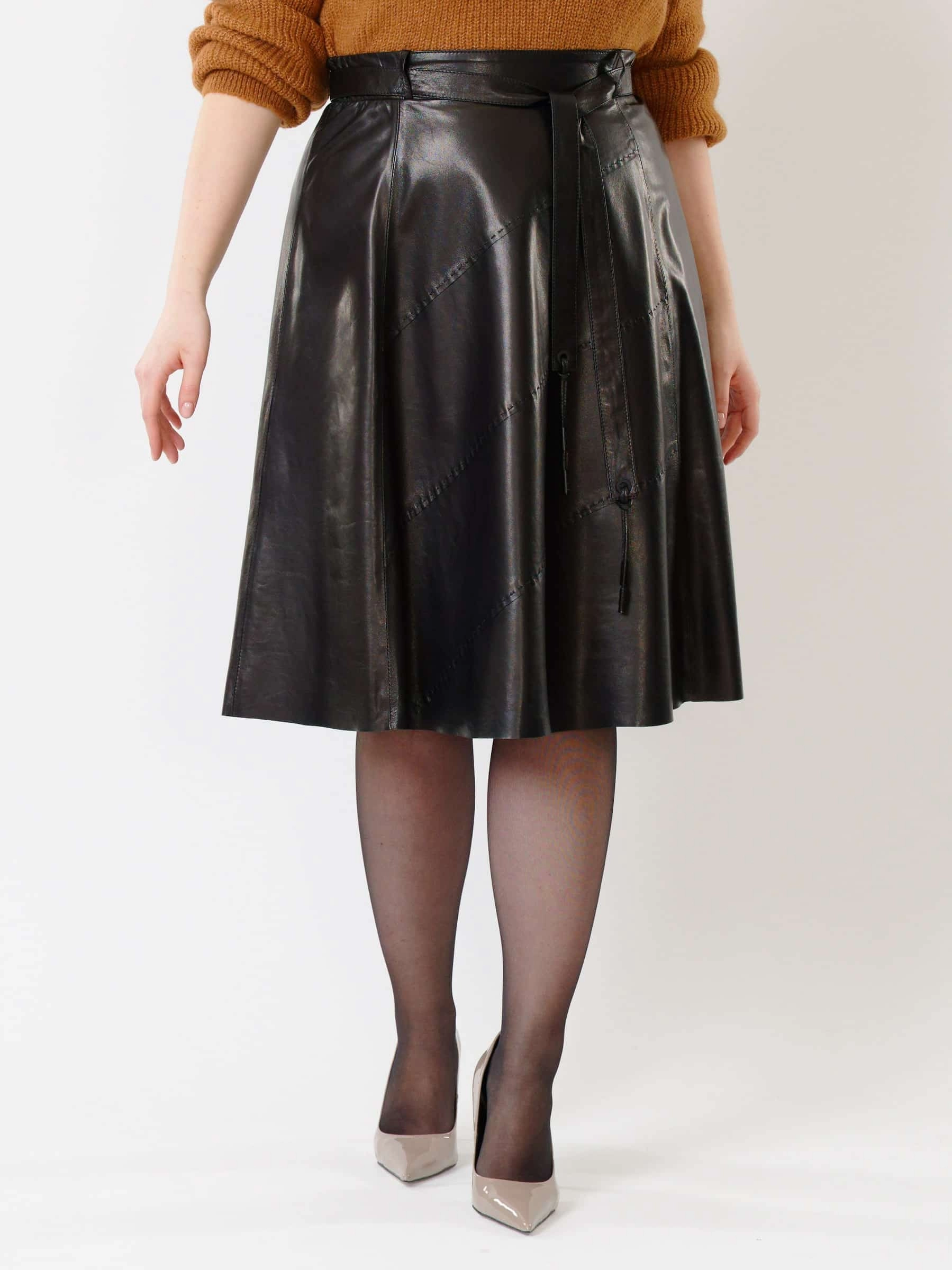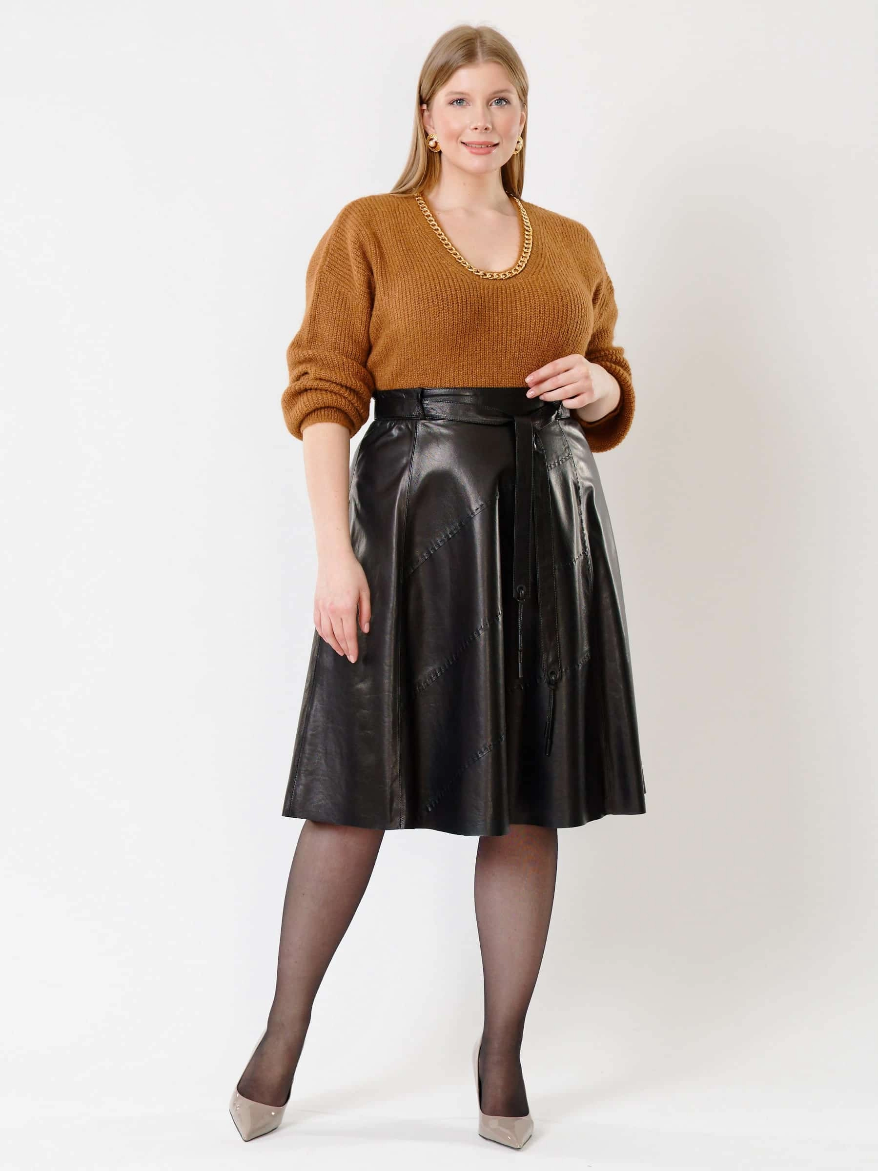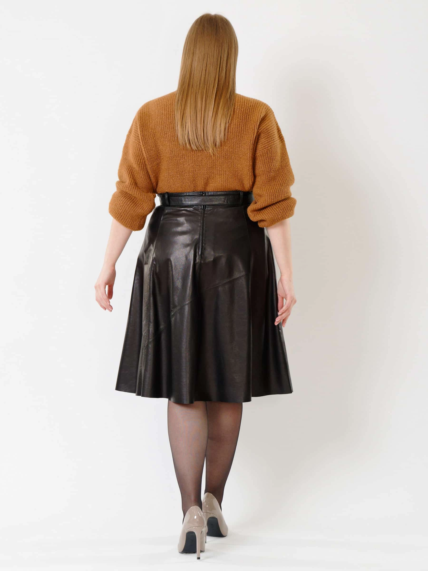 Облегающая расклешённая юбка из натуральной мягкой кожи с благородным блеском сочетает комфорт и долговечность. Летящий крой визуально стройнит фигуру, добавляя образу лёгкость и динамику, а эксклюзивная отделка ручной строчкой подчёркивает премиальное качество. Длинный пояс служит стильным акцентом, а потайная застёжка-молния сзади обеспечивает идеальную посадку и чистоту линий. Универсальная модель легко впишется в любой гардероб - от офиса до вечернего выхода.