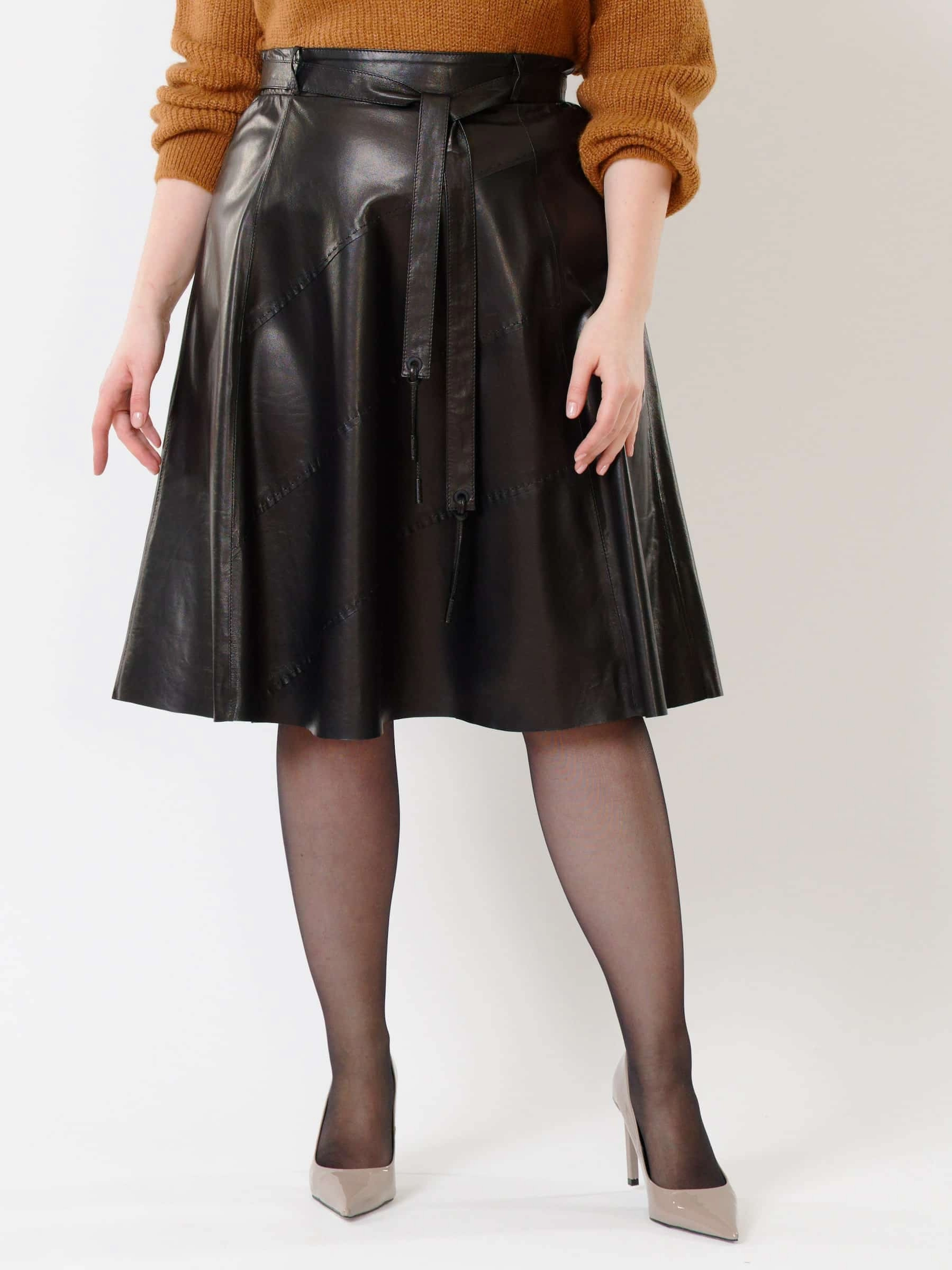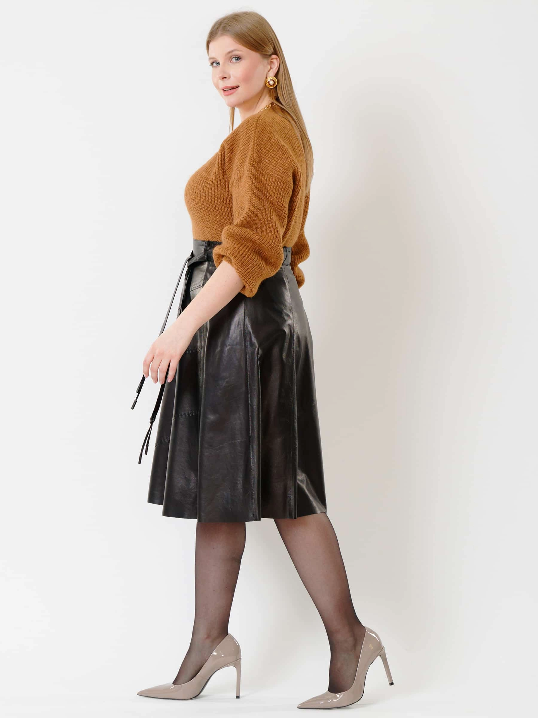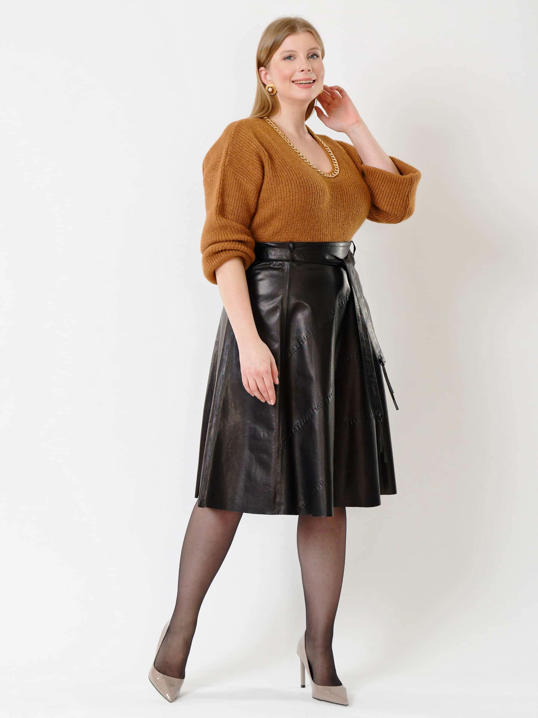 Облегающая расклешённая юбка из натуральной мягкой кожи с благородным блеском сочетает комфорт и долговечность. Летящий крой визуально стройнит фигуру, добавляя образу лёгкость и динамику, а эксклюзивная отделка ручной строчкой подчёркивает премиальное качество. Длинный пояс служит стильным акцентом, а потайная застёжка-молния сзади обеспечивает идеальную посадку и чистоту линий. Универсальная модель легко впишется в любой гардероб - от офиса до вечернего выхода.