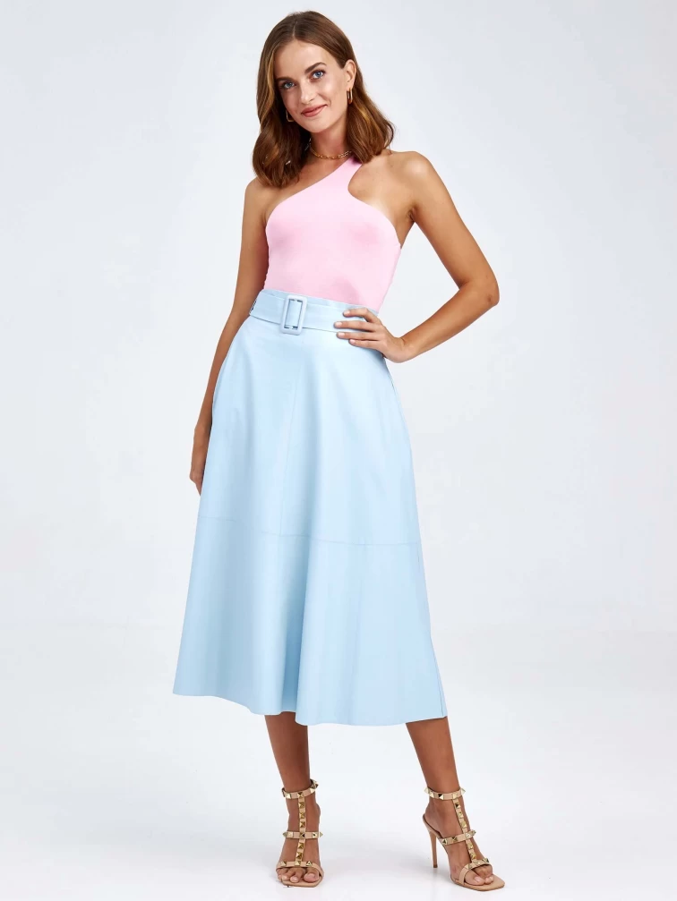 Товар женские кожаная юбка из экокожи 4820757, голубая, размер 48, артикул 85770 выполнен из экокожи с застежкой молния. Рассчитан на сезон: демисезон. Длина изделия 75-90 см, силуэт расклешенный.