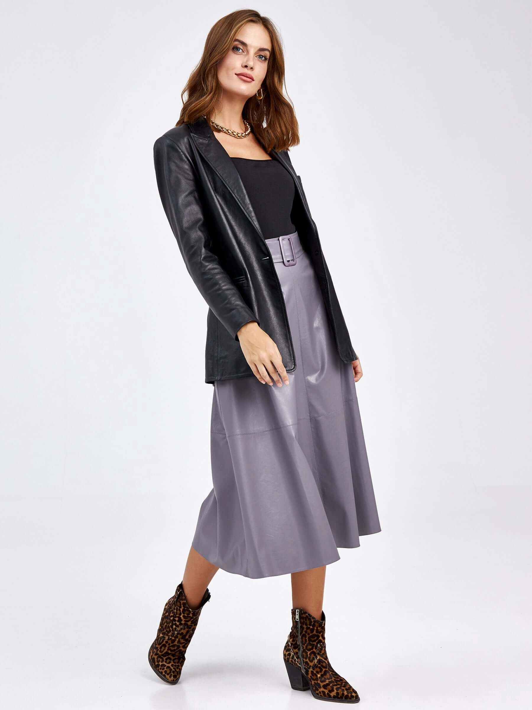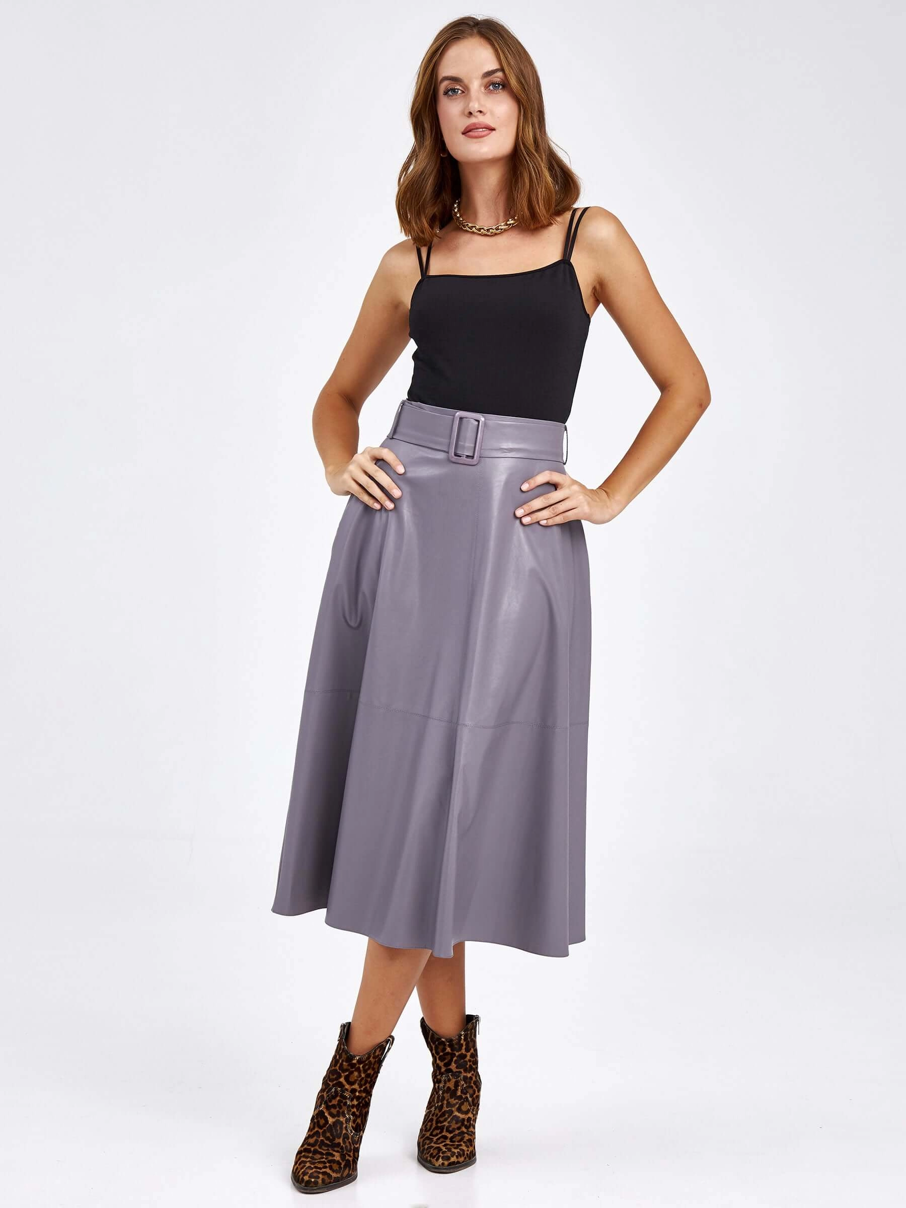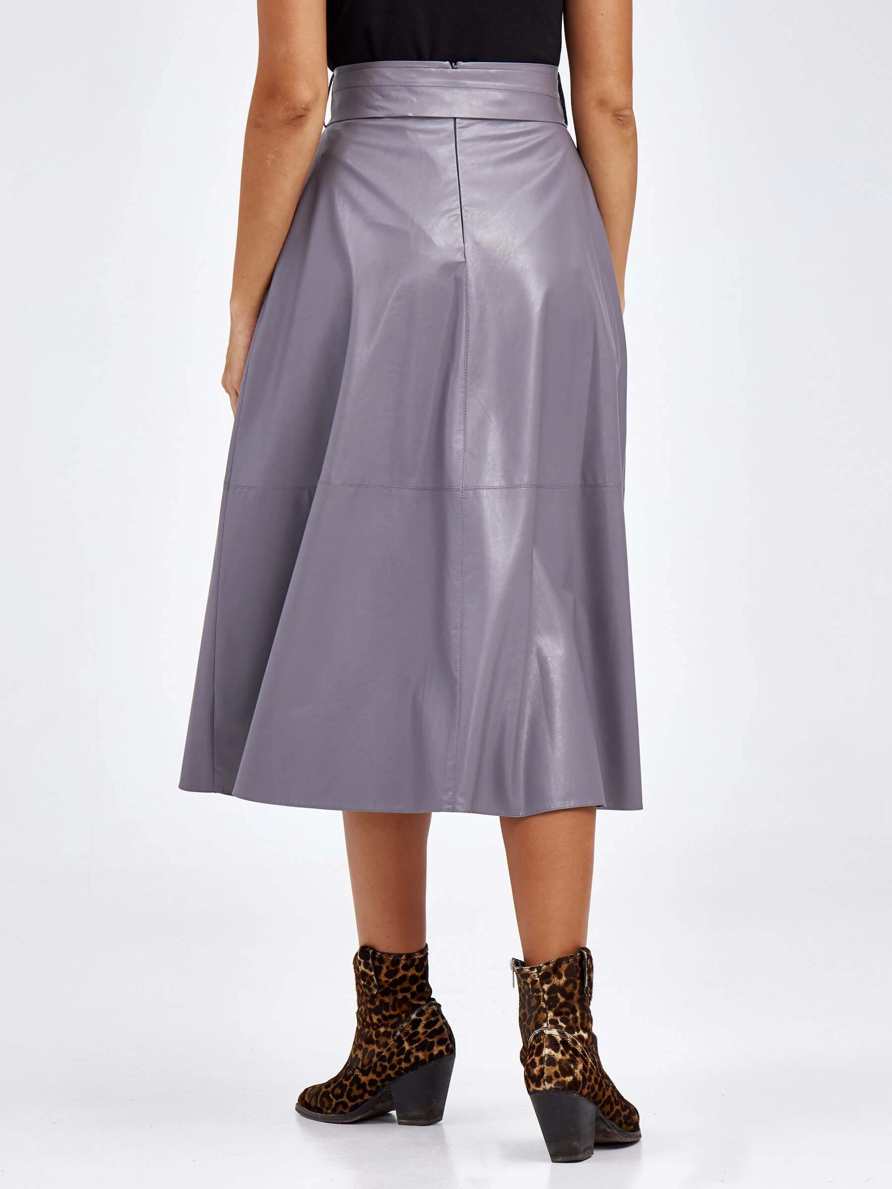 Товар женские кожаная юбка из экокожи 4820761, серая, размер 44, артикул 85810 выполнен из экокожи с застежкой молния. Рассчитан на сезон: демисезон. Длина изделия 75-90 см, силуэт расклешенный.