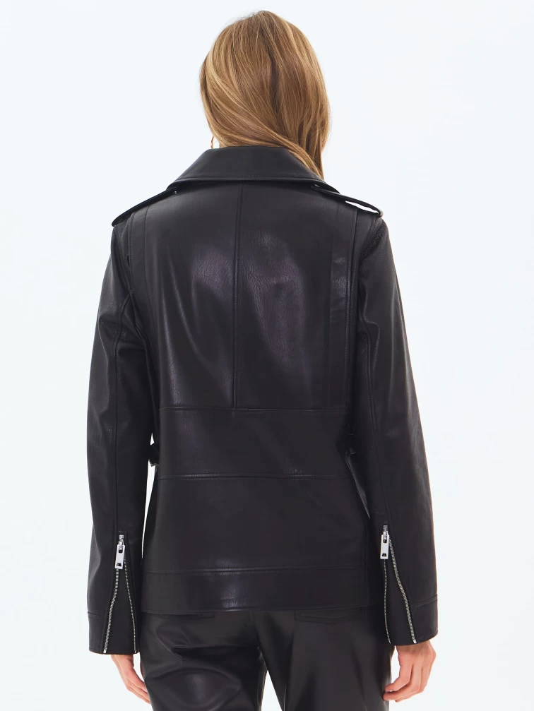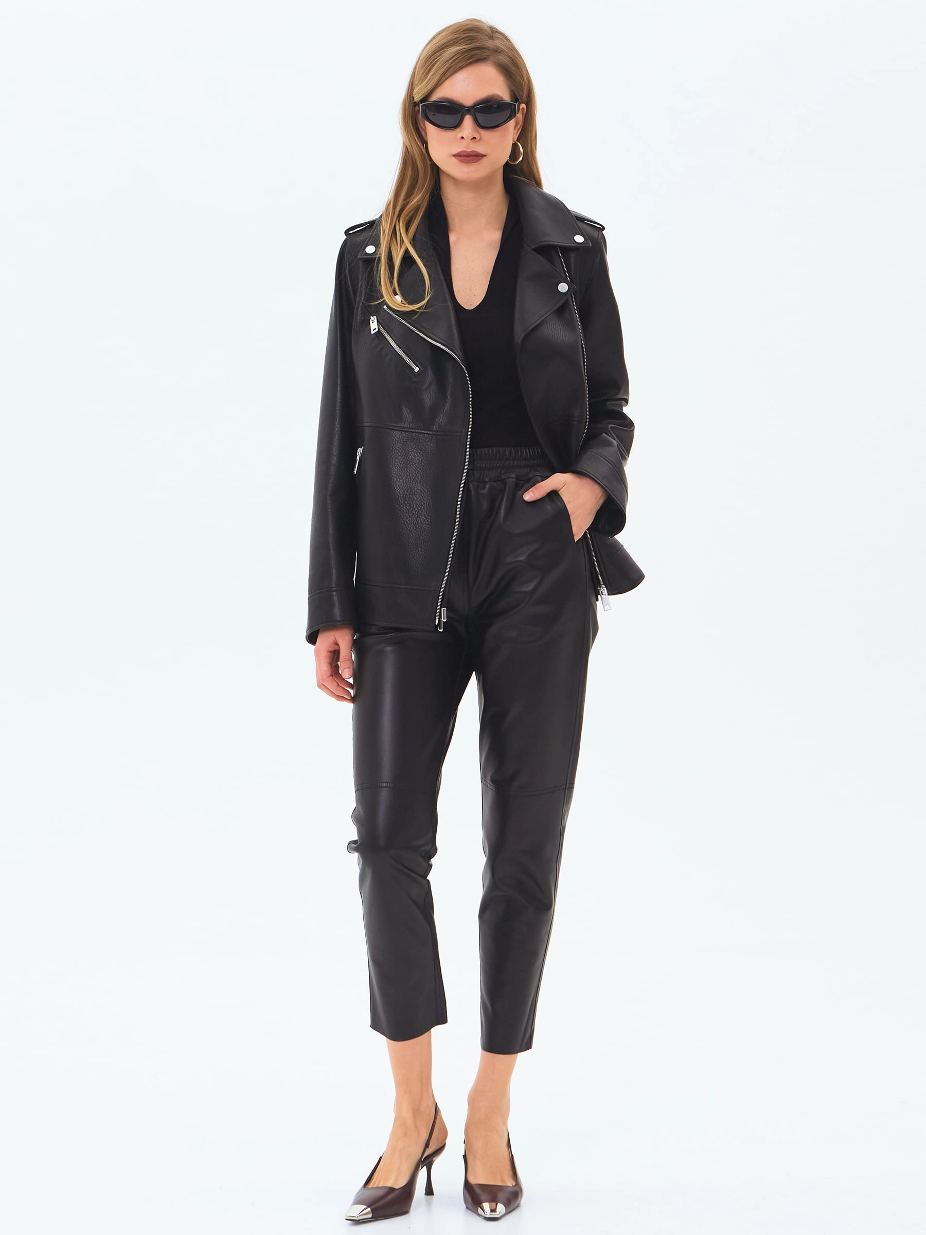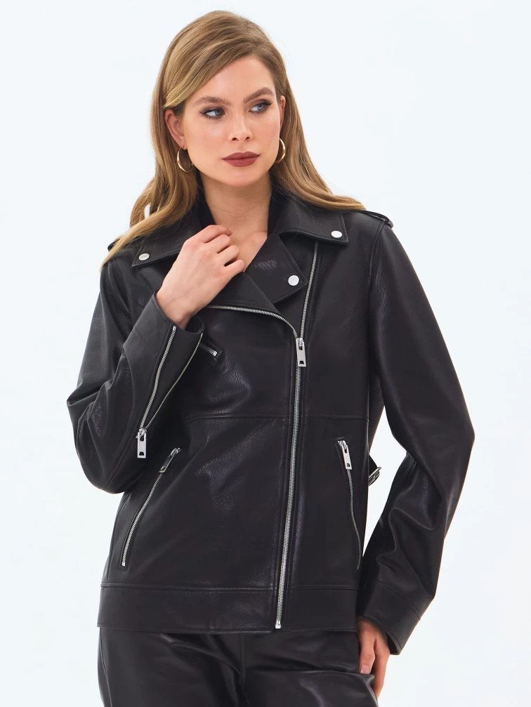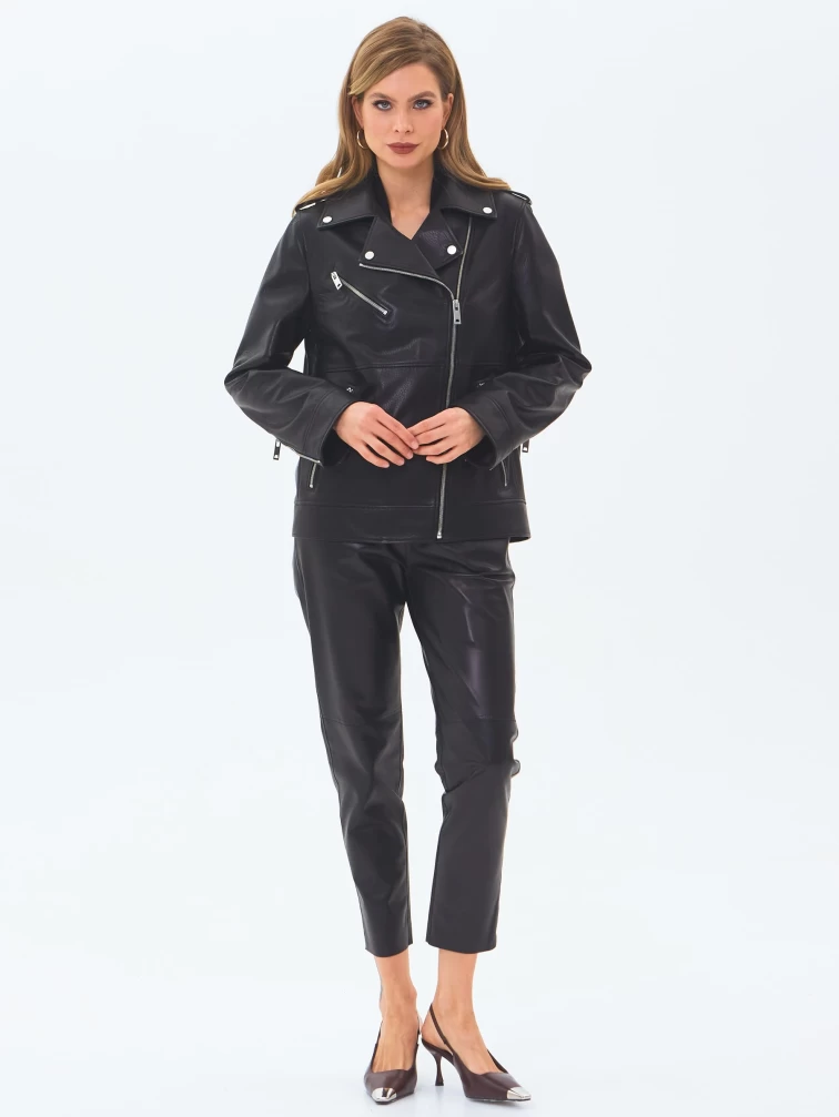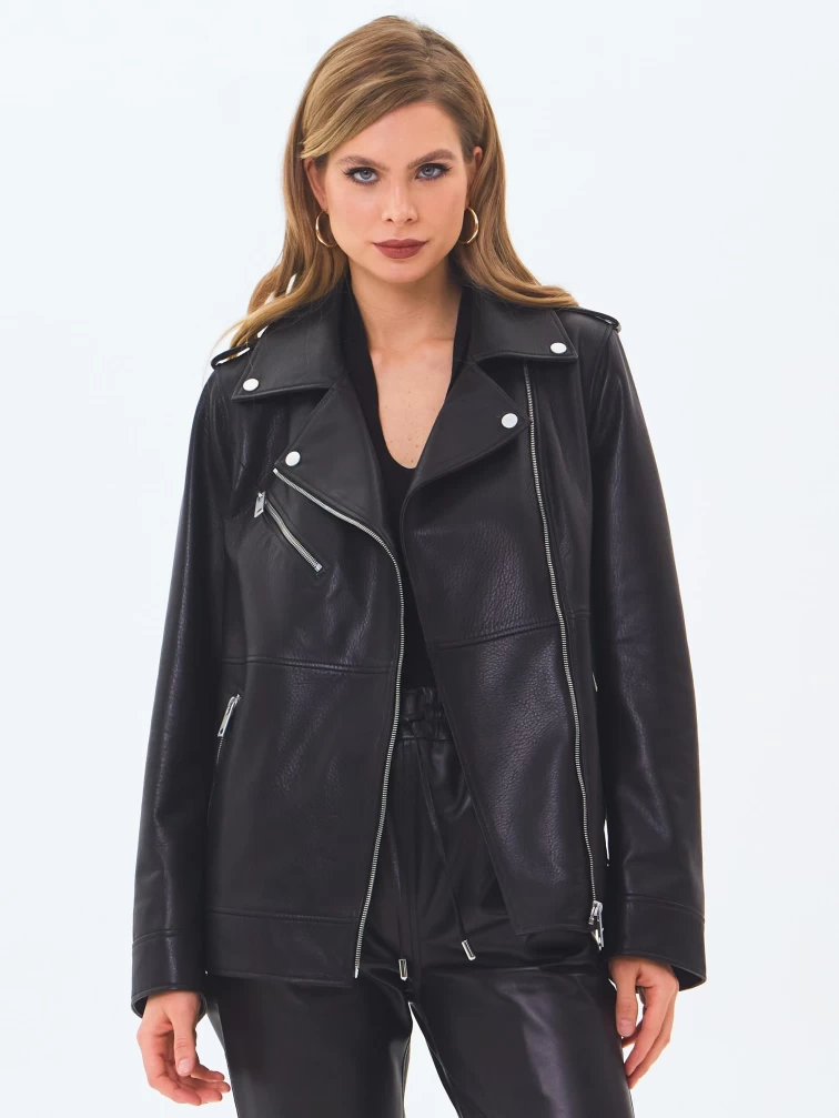 Удлиненную косуху выполнили из мелкозернистой кожи премиум класса. Куртку прямого кроя с втачными рукавами дополнили погонами. Прорезные карманы и манжеты застегиваются крупными молниями. Великолепная посадка по фигуре и свободе движений.