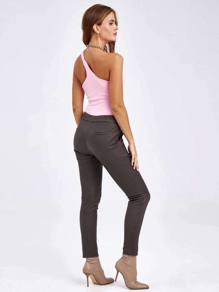 Стильные, зауженные брюки стрейч- выполнены из гладкой натуральной кожи. Средняя посадка, полная длина. Широкий пояс на резинке дополняет фиксирующий шнурок. Брюки невероятно комфортные, легкие и просто красивые. Идеально подходят на любой рост. Занимайтесь в них спортом, гуляйте на природе, ходите на вечеринки!