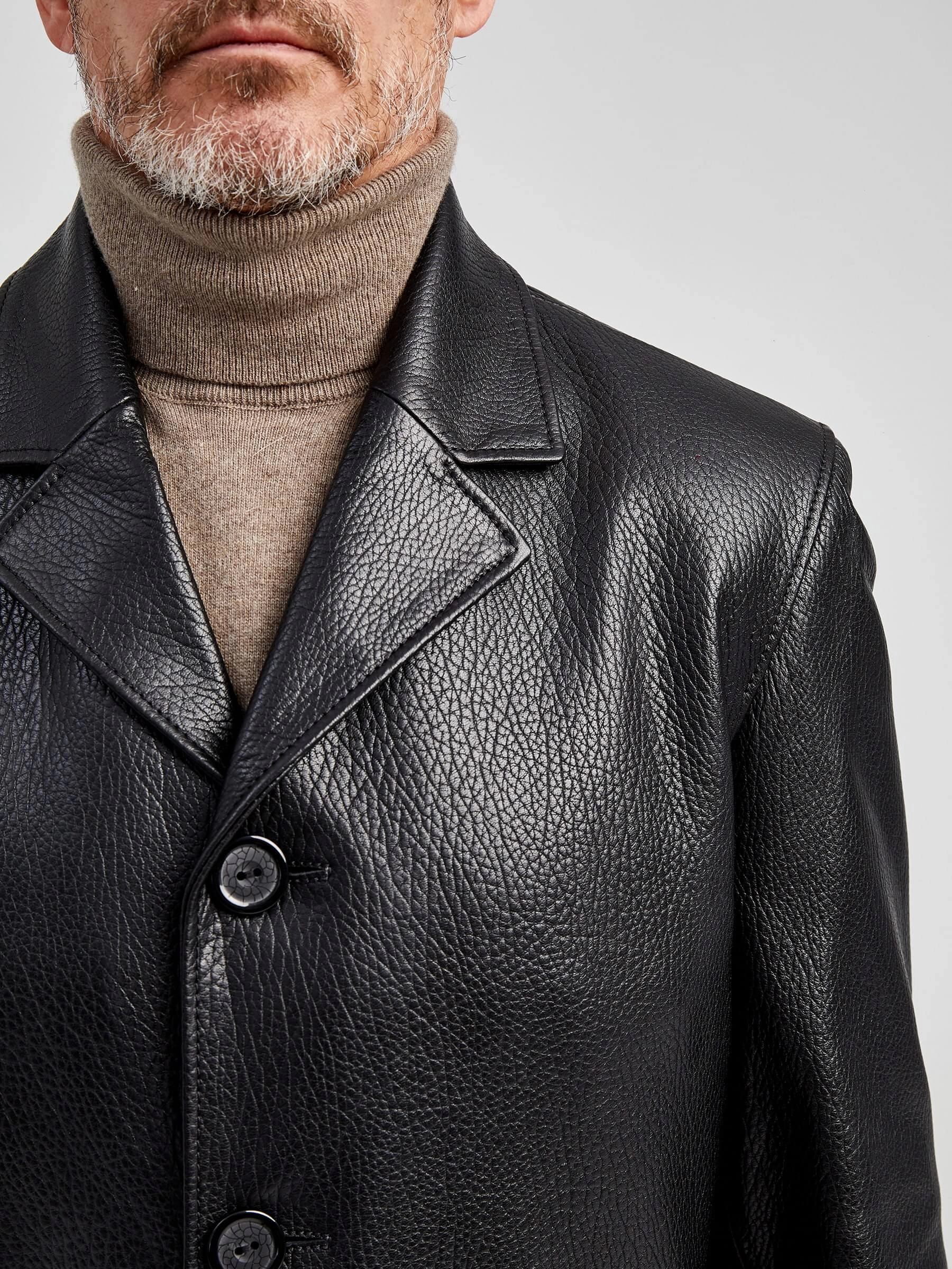 Мужской пиджак в современном исполнении. Черная кожа особой выделки. Прекрасное сочетание как с джинсами, так и с классическим костюмом. Модель комфортно садится по фигуре поверх пиджака. Прямой силуэт. Английский воротник. Рукав втачной двухшовный. Ширина рукавов и специальное построение плечевого пояса, обеспечивают комфортную посадку на любой тип фигур. Широкий усиленный подборт предотвращает деформацию. Эргономичные усиленные листочки наружных карманов. Предусмотрены внутренние застёгивающиеся карманы для документов. Особая обработка петель под пуговицы предотвращает их изнашивание.