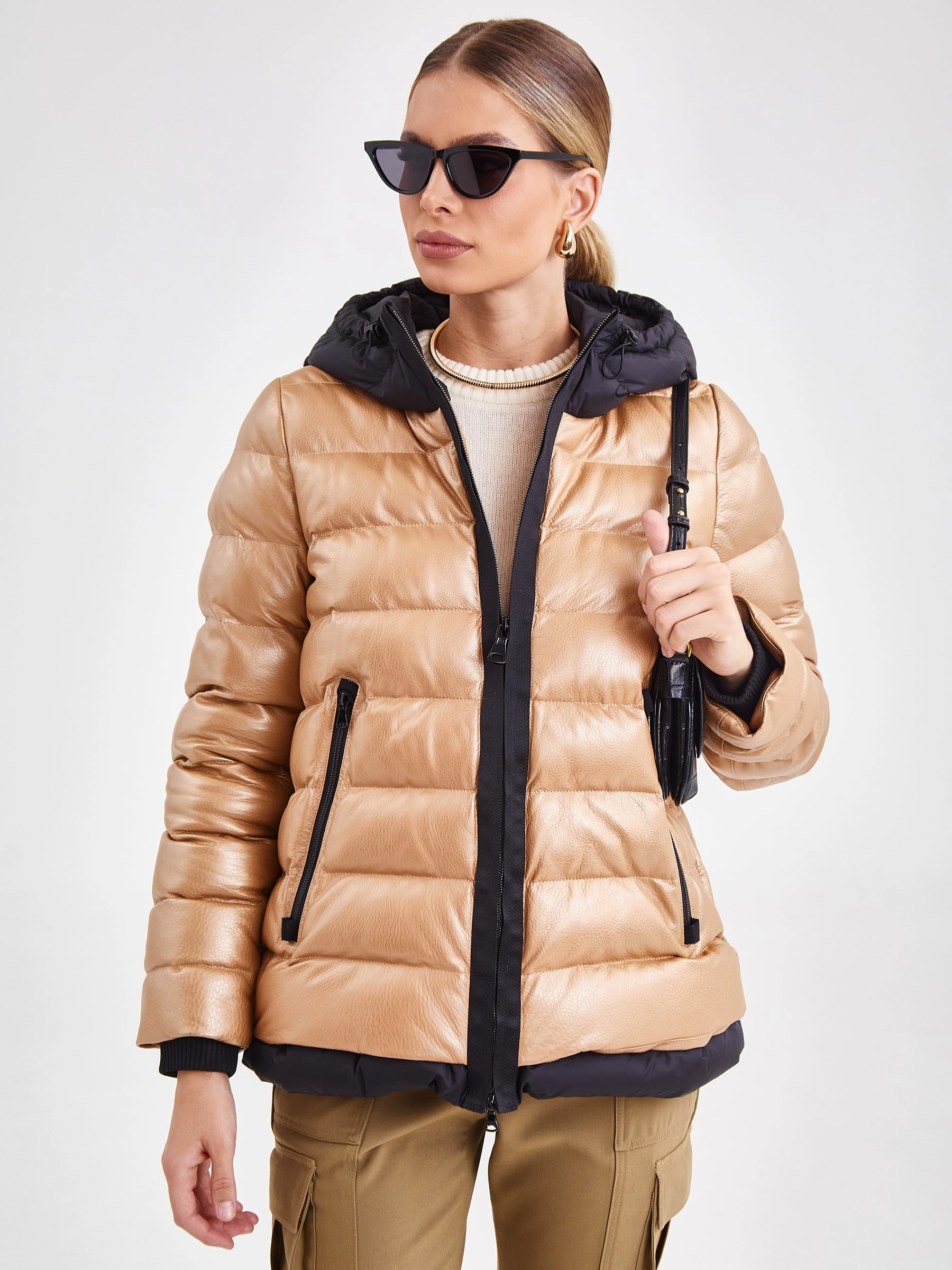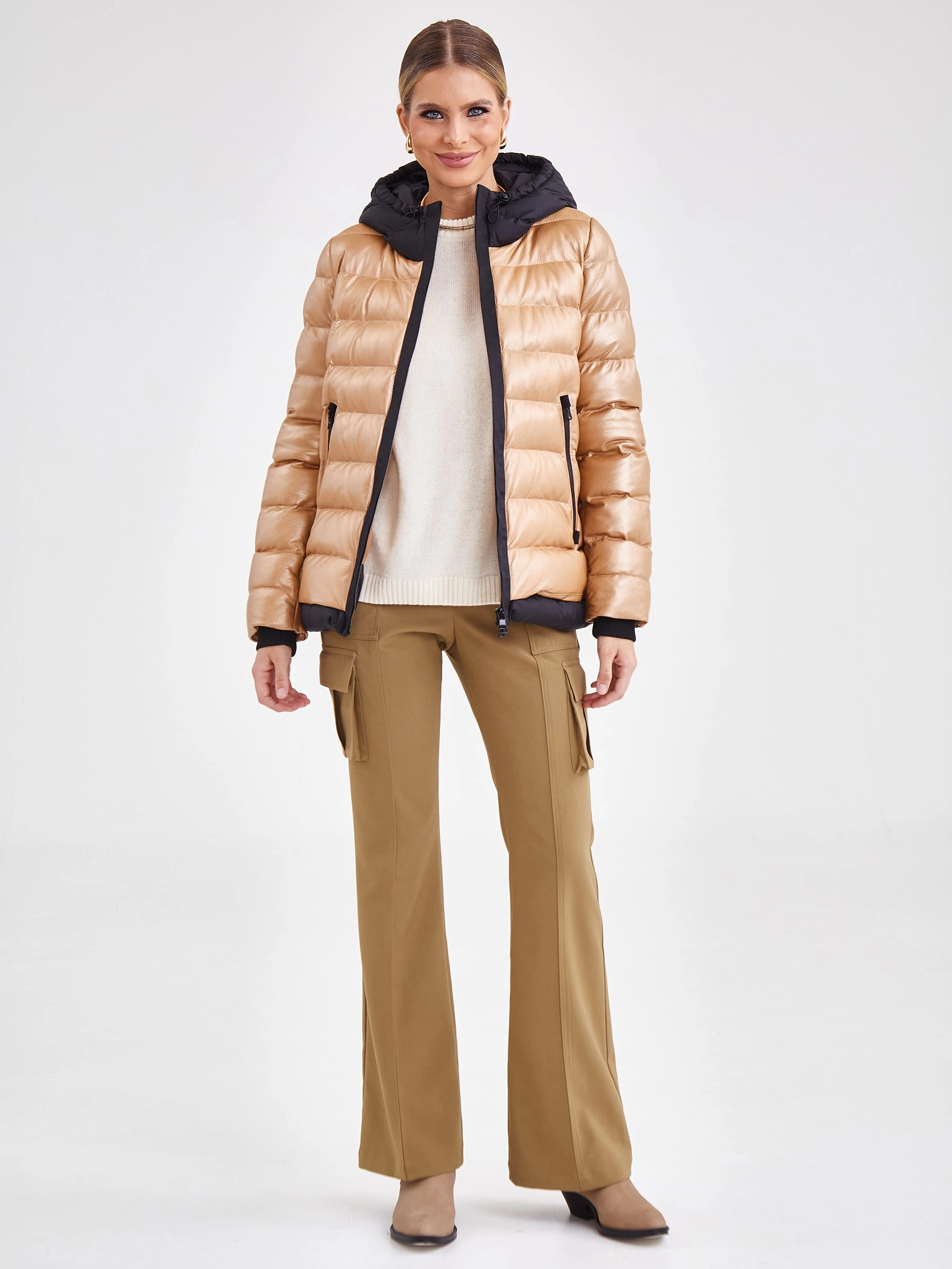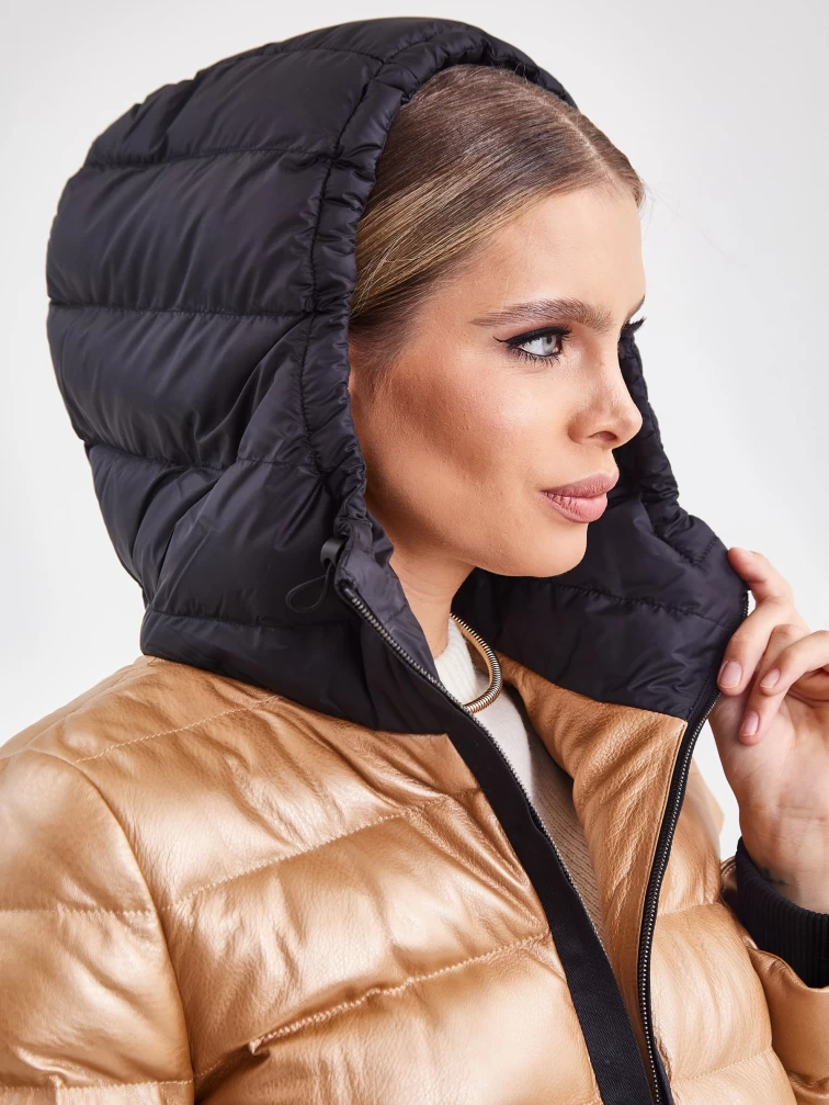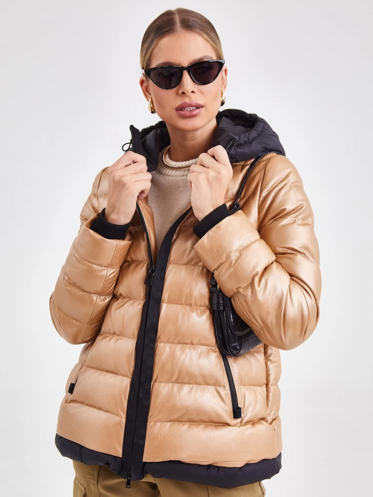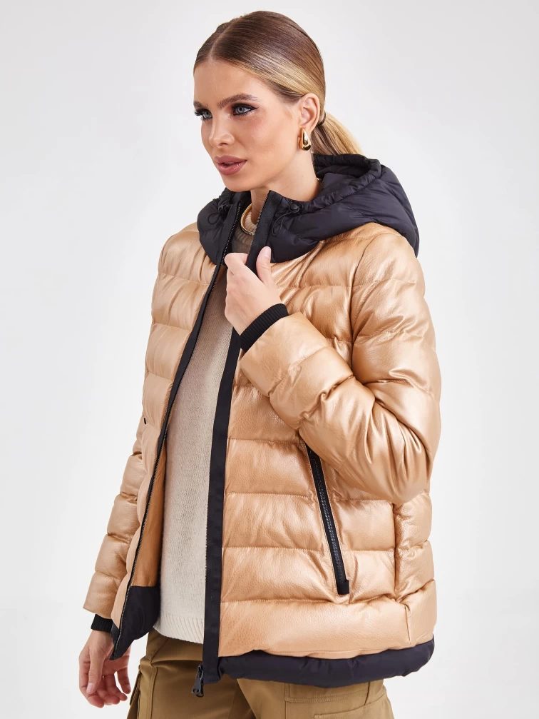 Короткий женский кожаный пуховик с капюшоном премиум класса 3028, бежевый, размер 44, артикул 25370