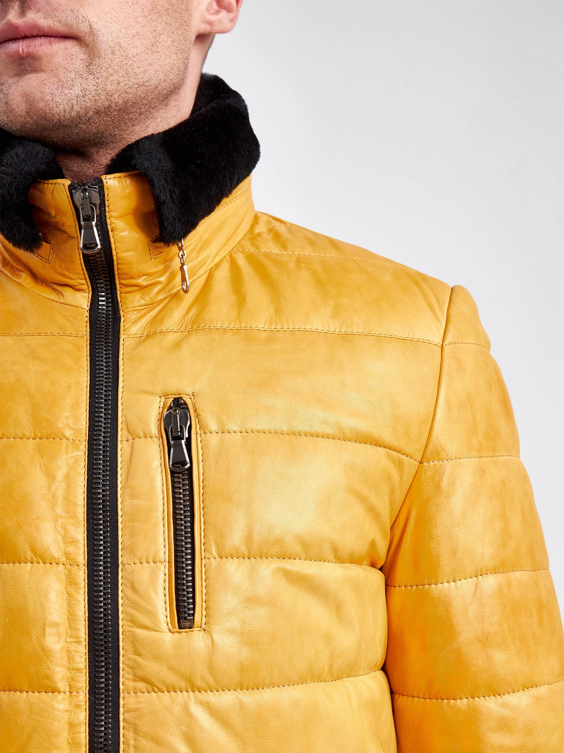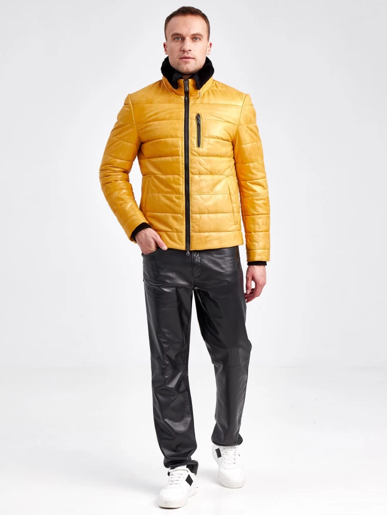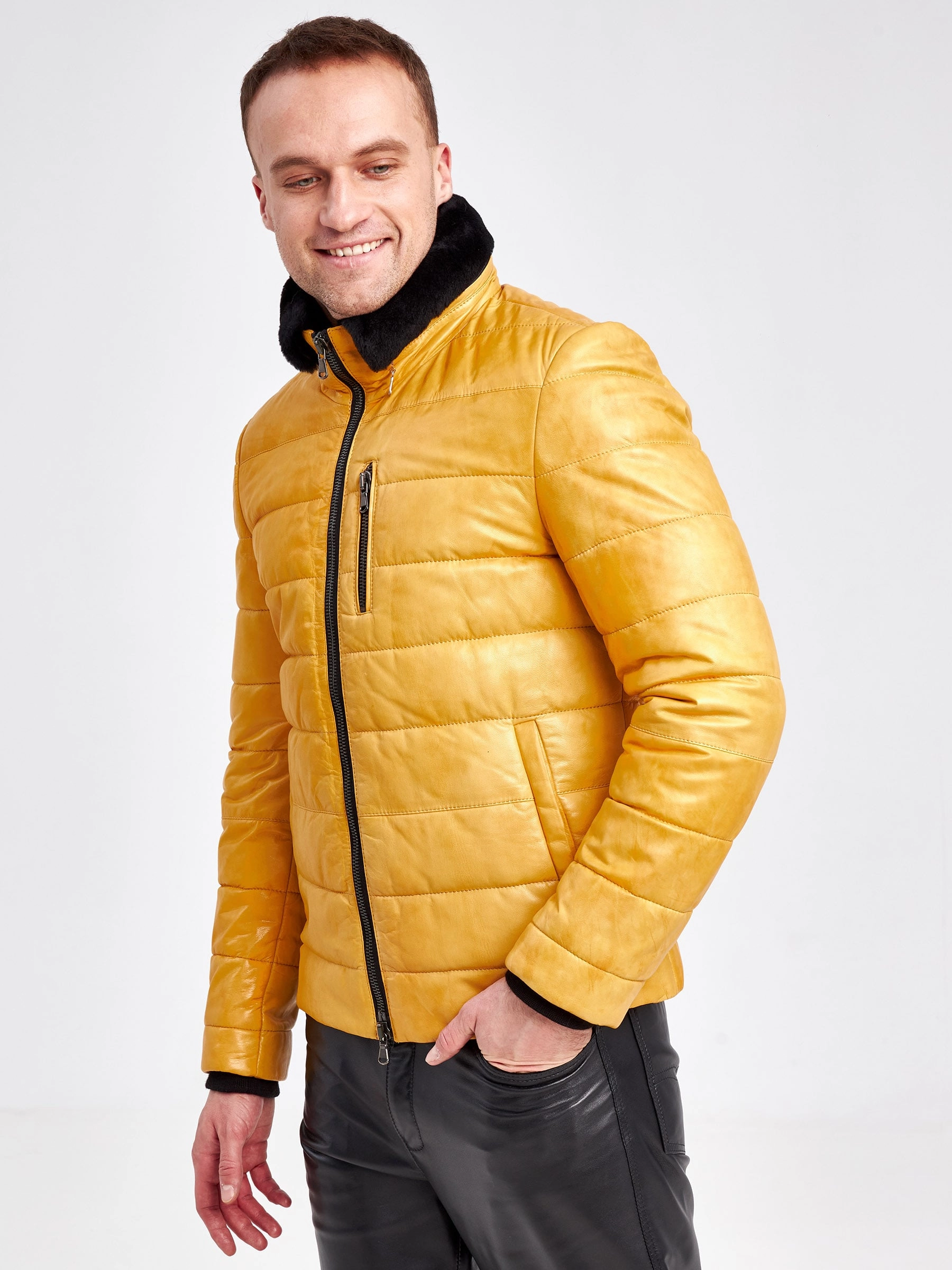 Товар зимний короткий кожаный пуховик для мужчин 40132, желтый, размер 48 , артикул 23110 выполнен из натуральной кожи с застежкой молния. Рассчитан на сезон: осень-зима. Длина изделия 69 см, силуэт полуприлегающий.