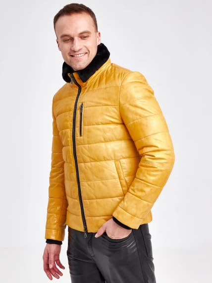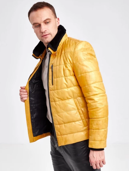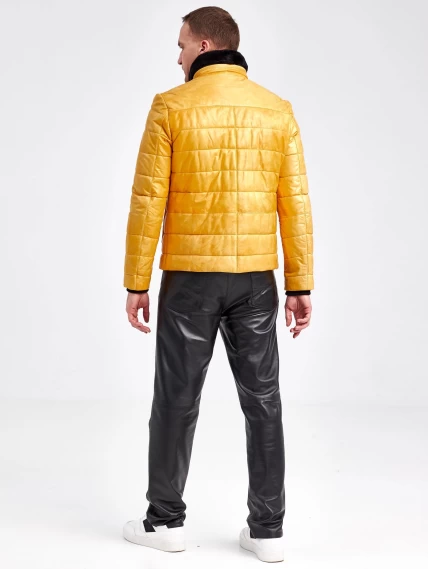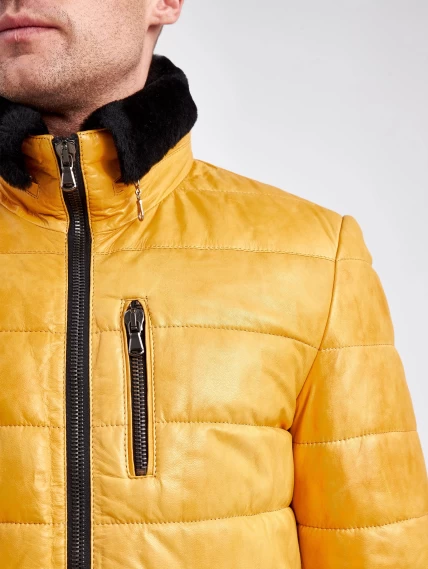 Зимний короткий кожаный пуховик для мужчин 40132, желтый, размер 48 , артикул 23110