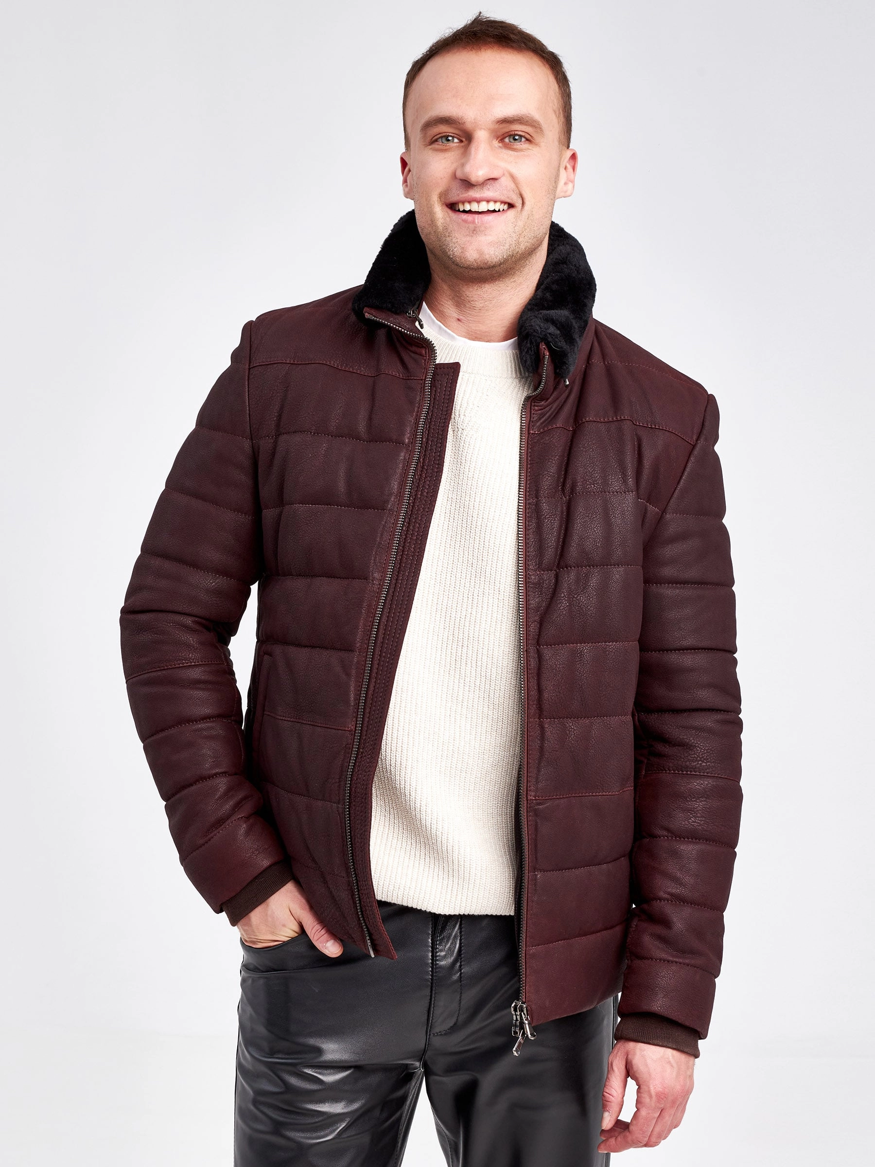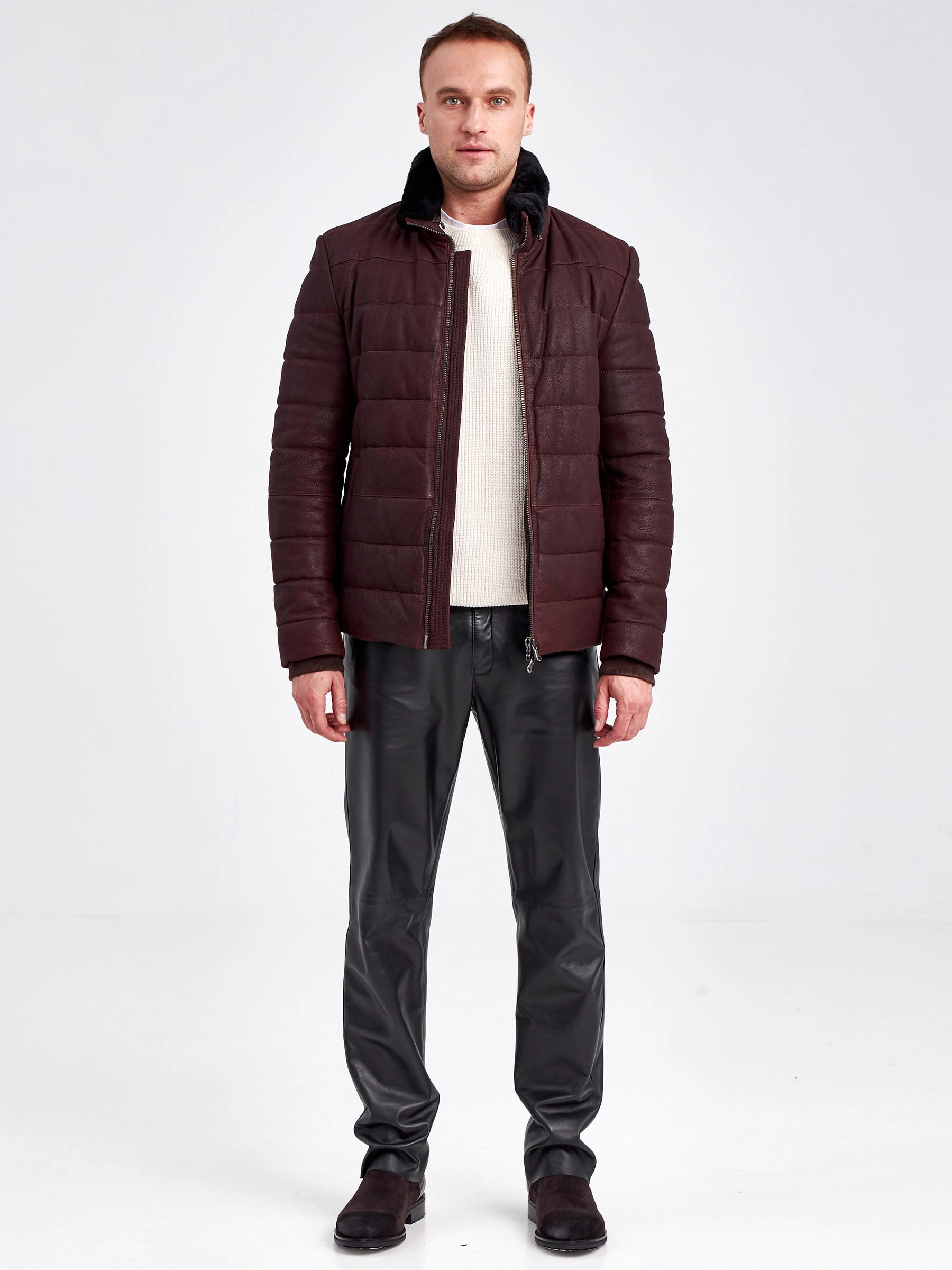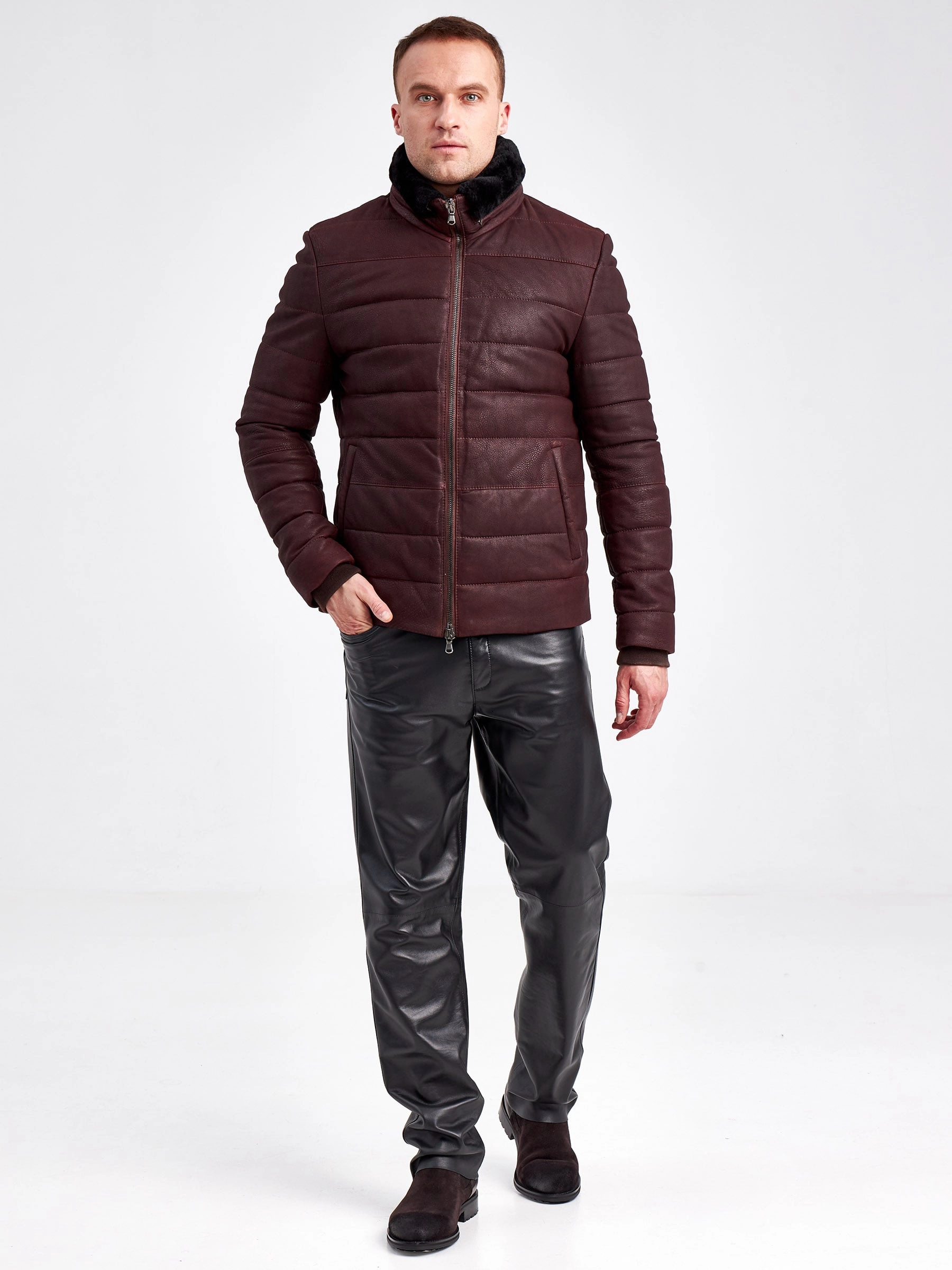 Кожаный пуховик зимний мужской 4678, короткий, бордовый, размер 50, артикул 23120