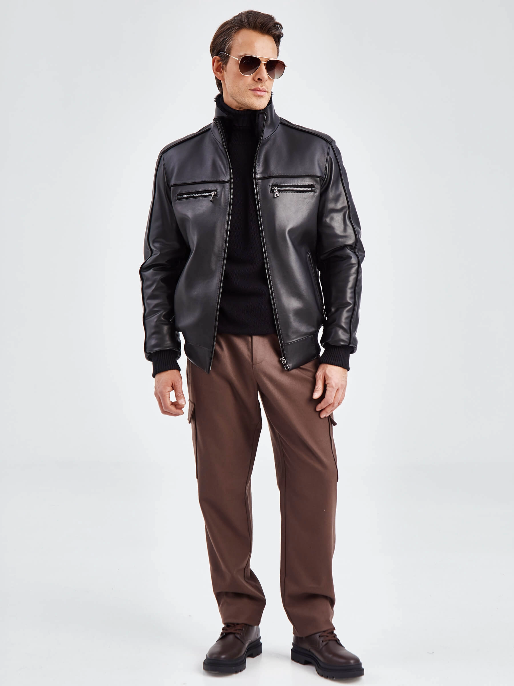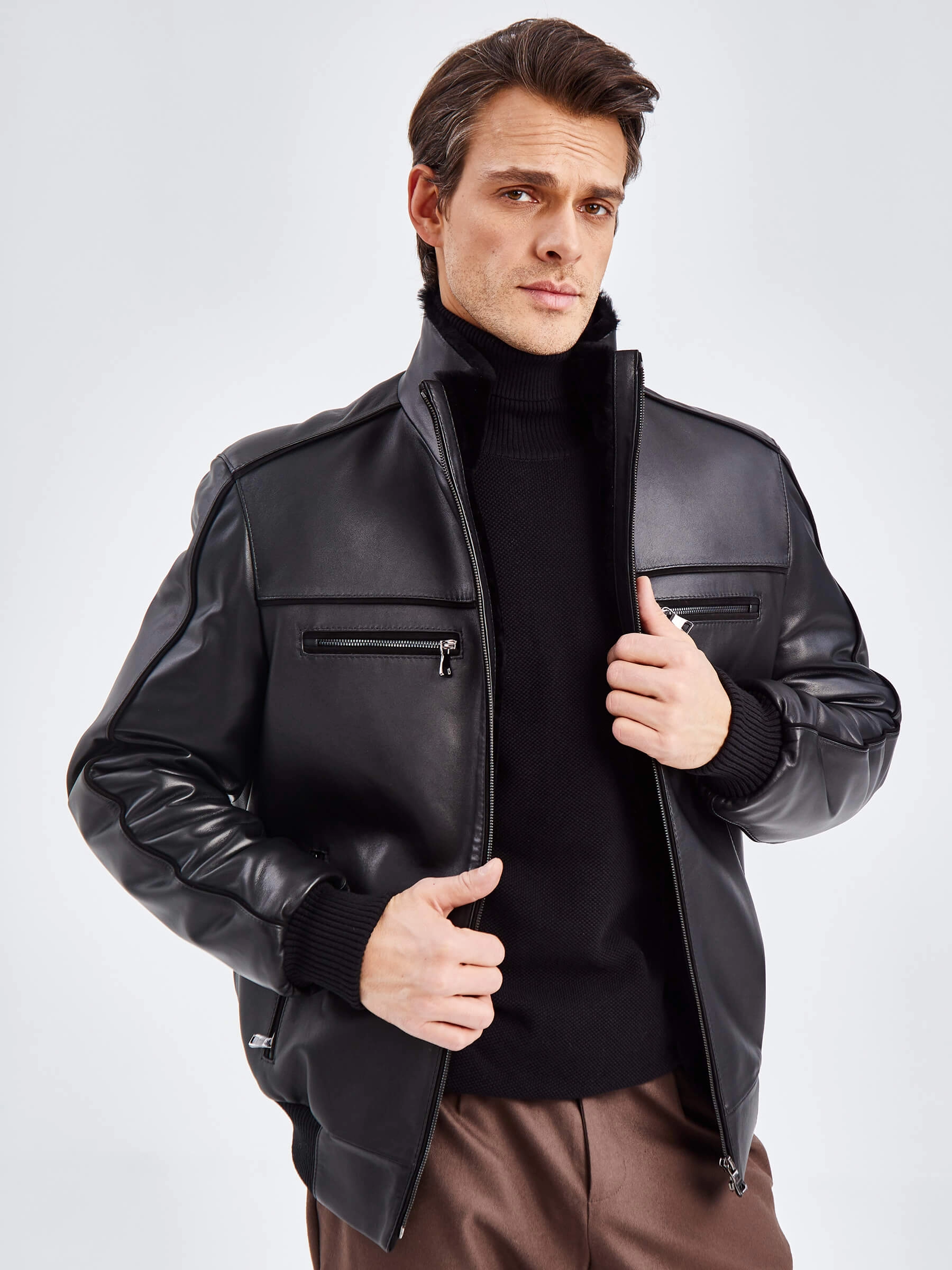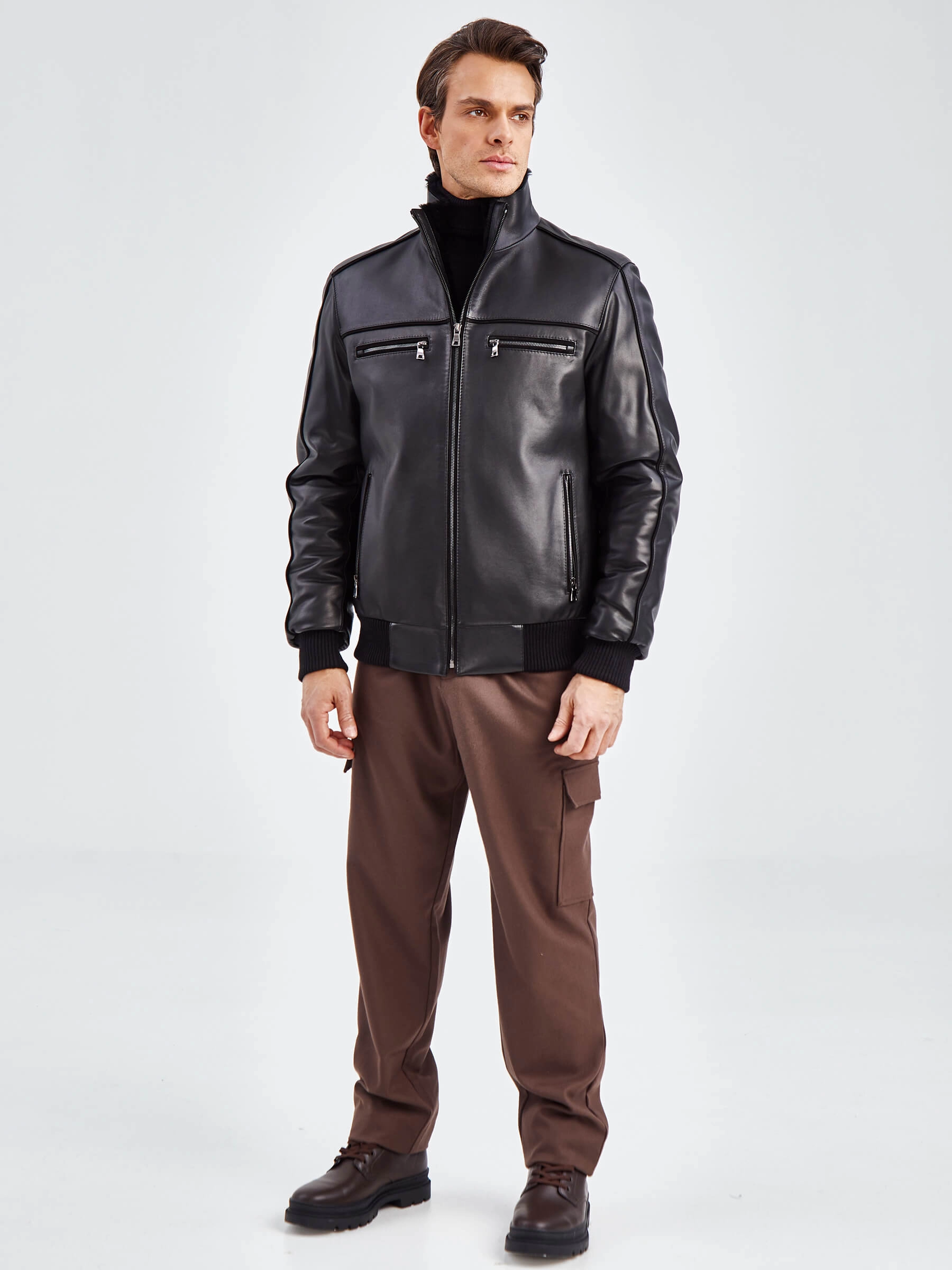 Кожаная дубленка с меховой подкладкой из овчины. Утеплитель в рукавах - синтепон. Воротник-стойка. Застёжка-молния до верха воротника. Боковые карманы на молниях. Нагрудные карманы на молниях. Удобные внутренние карманы для документов. Напульсники рукавов и низ модели из трикотажной резинки. Комфортная посадка по фигуре. Куртка очень удобна за рулём.
