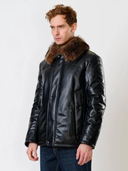 Мужской кожаный пуховик с воротником меха енота премиум класса Джастин, черный, размер 48, артикул 40230