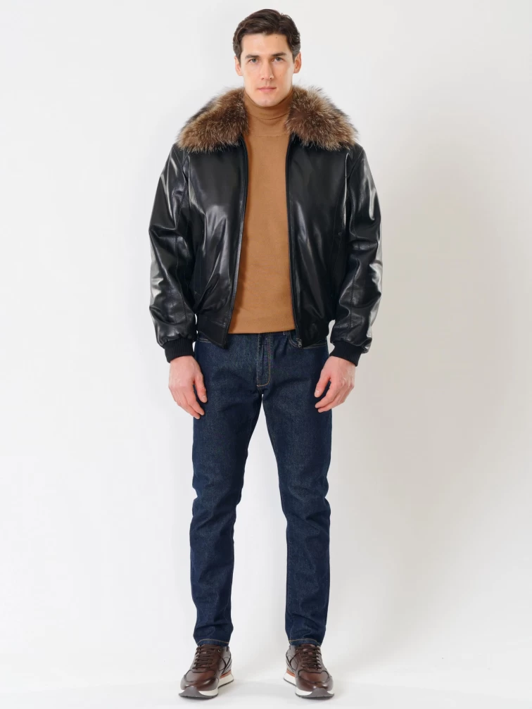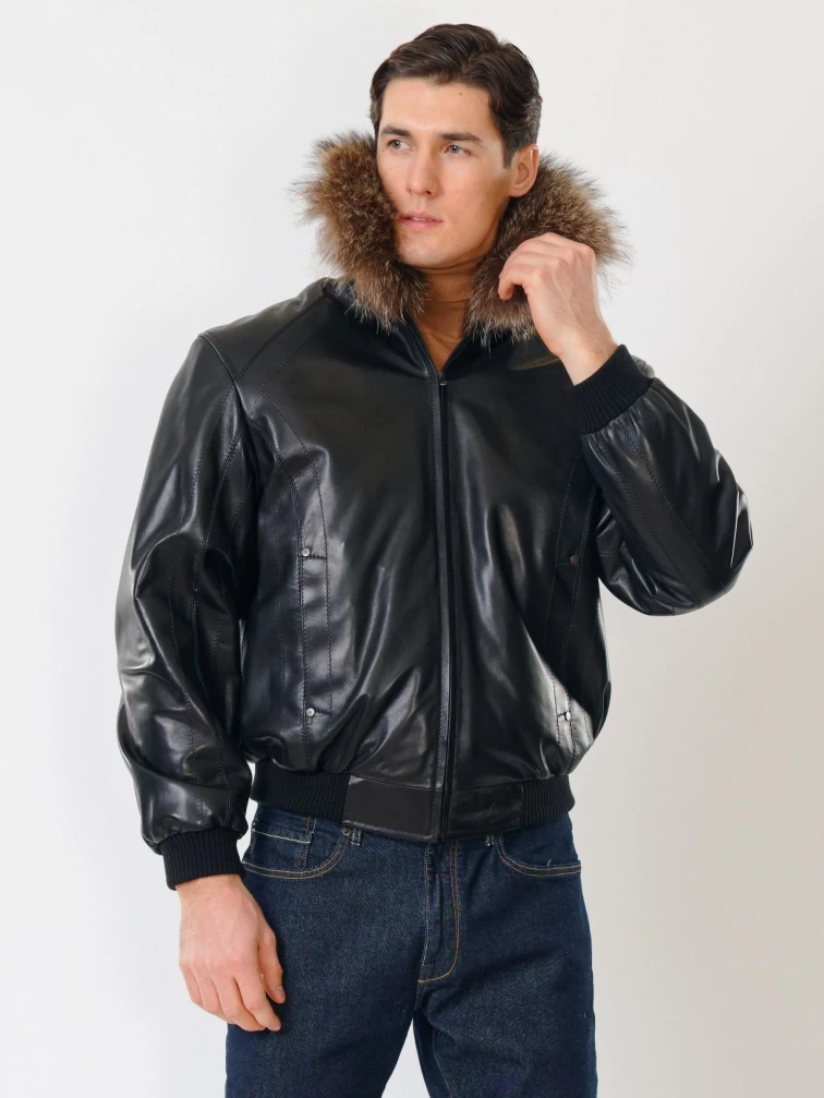 Мужская утепленная кожаная куртка бомбер на резинке с енотовым воротником Мауро-зима, черная, размер 64, артикул 40320