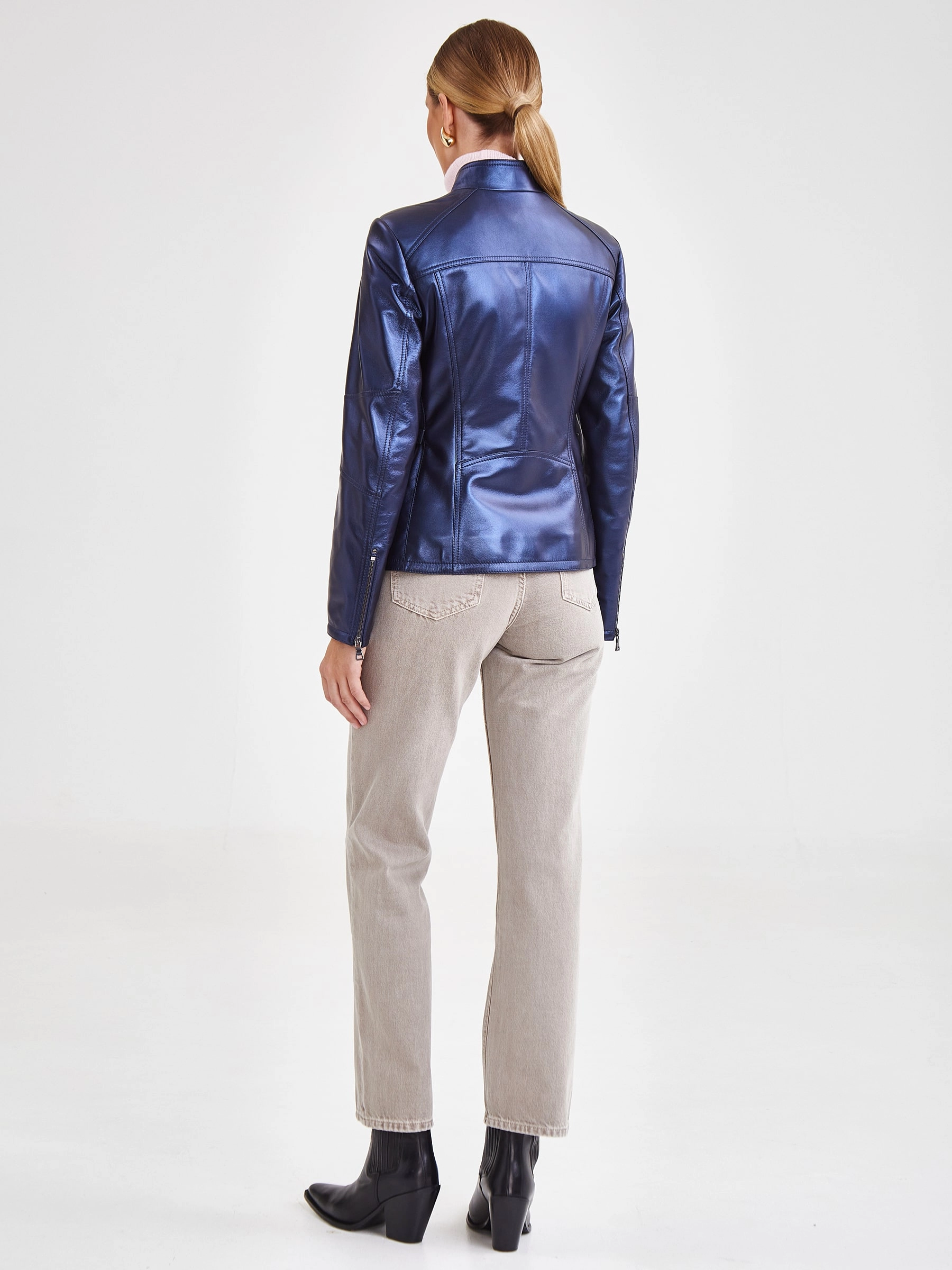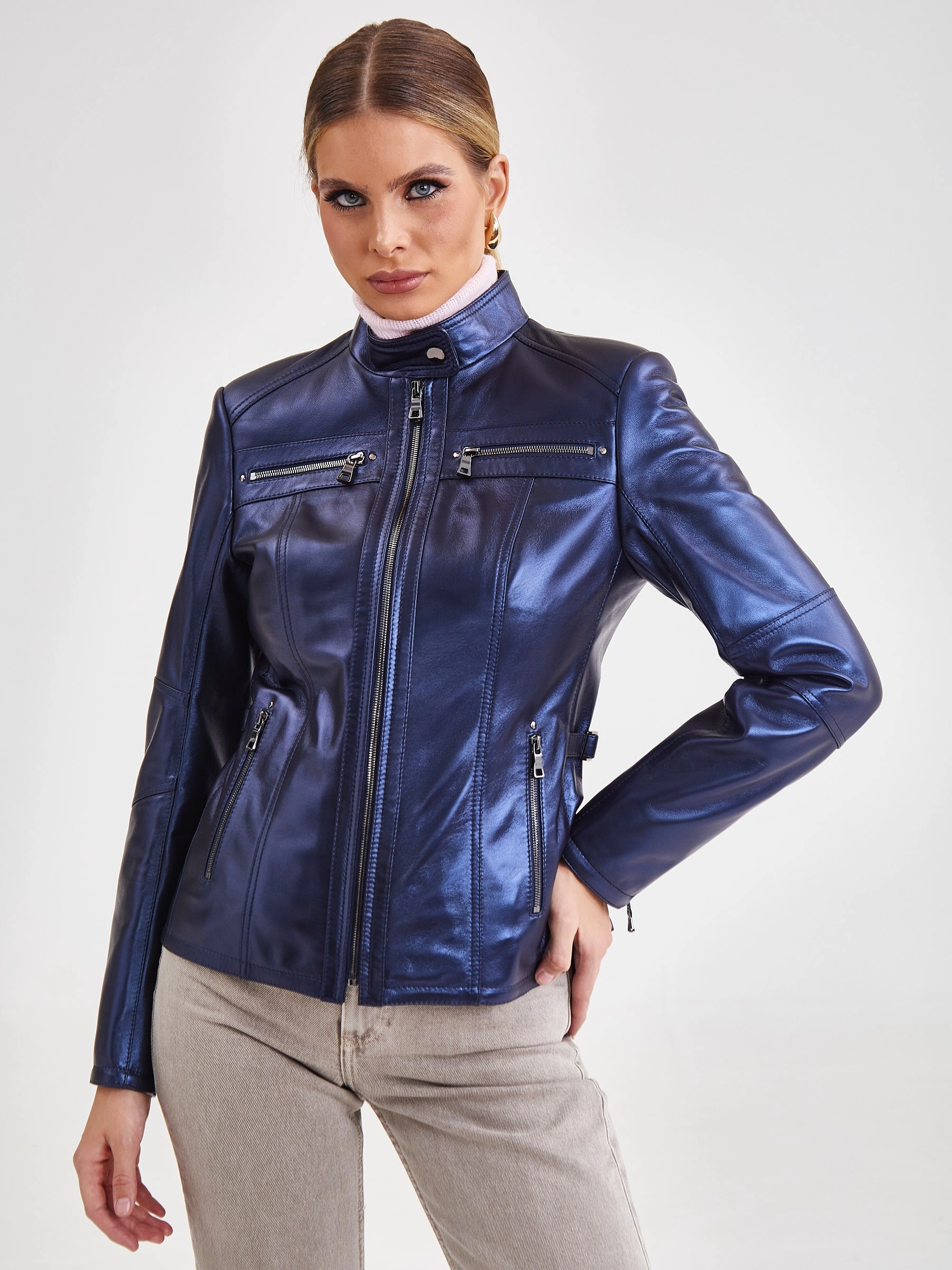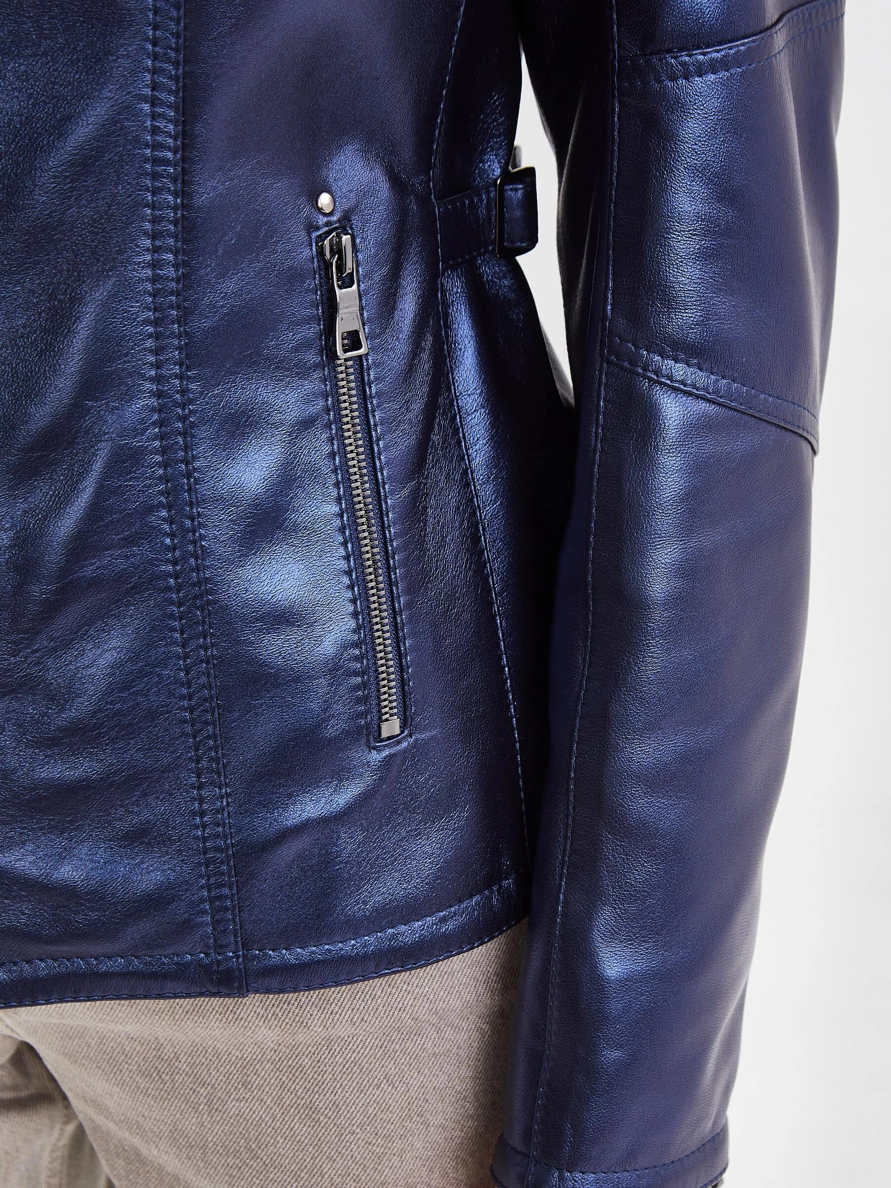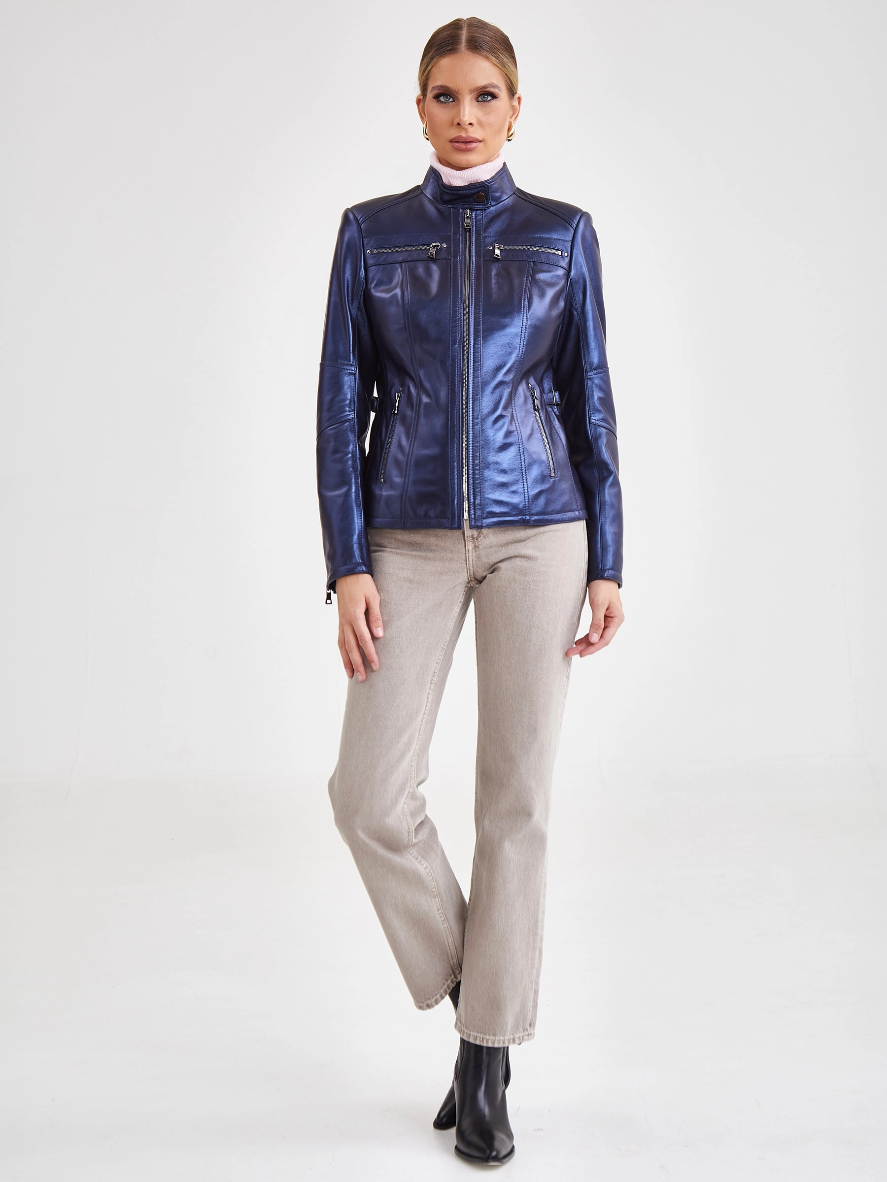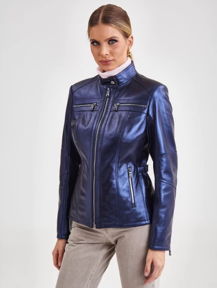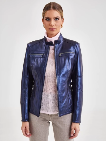 Кожаная утепленная женская куртка 301ш, синий перламутр, размер 46, артикул 23680