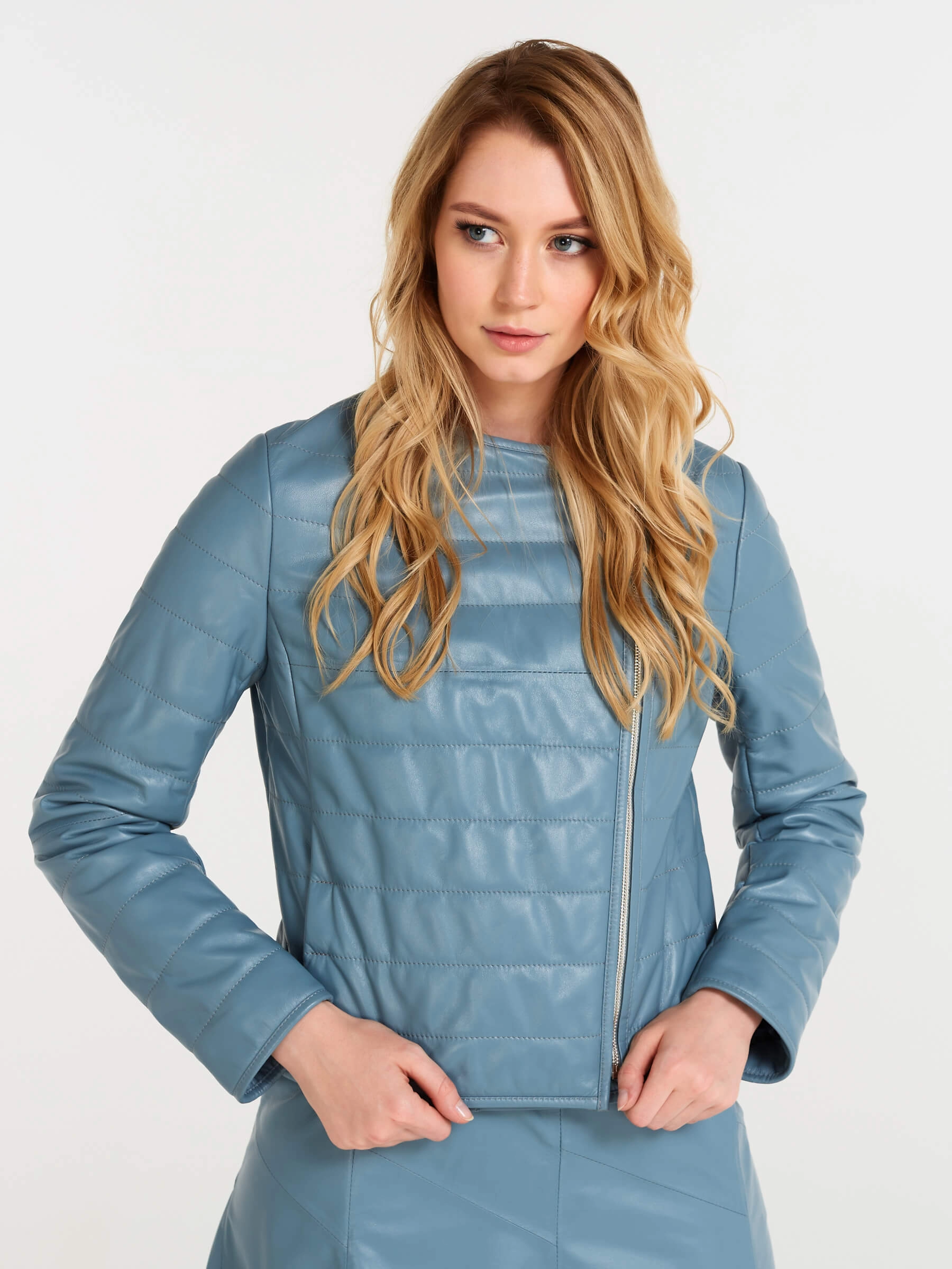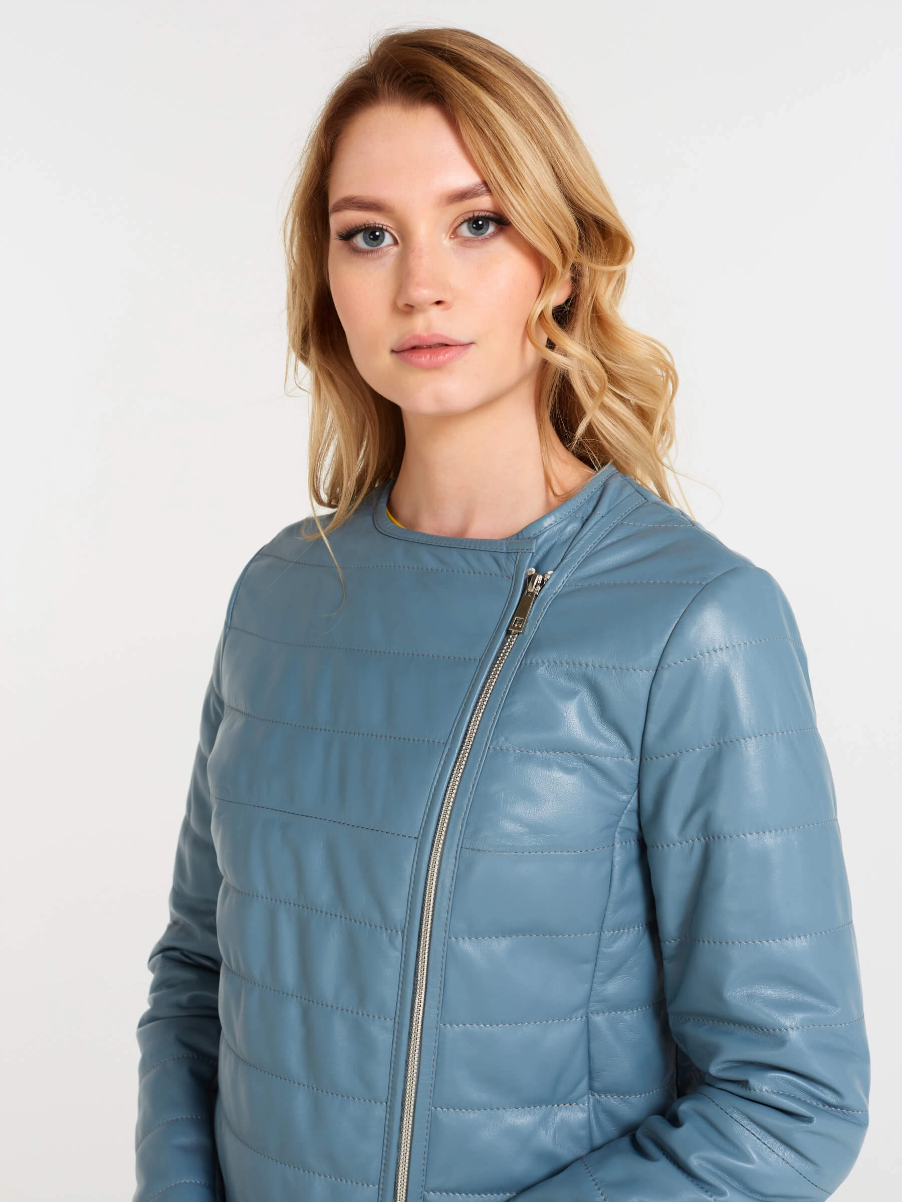Товар утепленная кожаная женская косуха без воротника 306, голубая, размер 46, артикул 23610 выполнен из натуральной кожи с застежкой молния. Рассчитан на сезон: демисезон. Длина изделия 53 см, силуэт полуприлегающий.