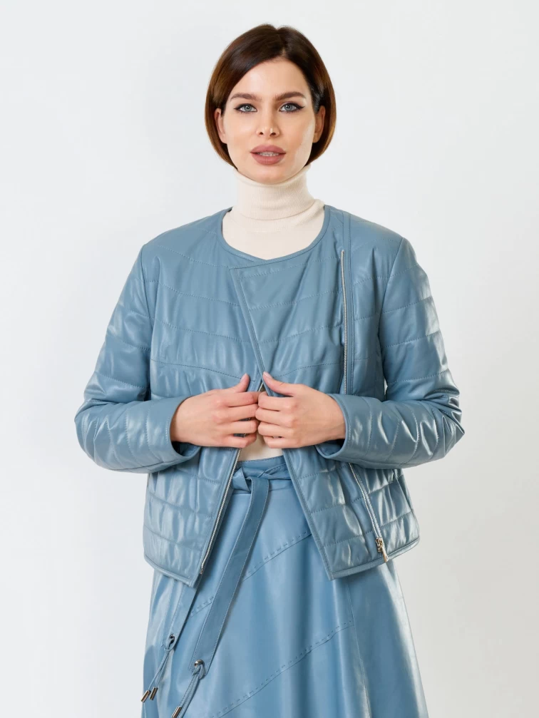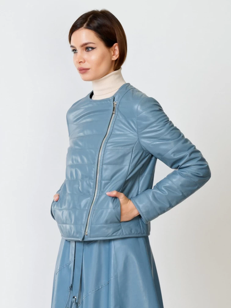 Утепленная кожаная женская косуха без воротника 306, голубая, размер 46, артикул 91031