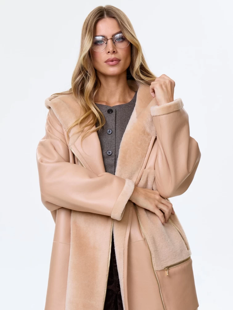 Товар молодежное полупальто из натуральной овчины для женщин с капюшоном премиум класса 2056, бежевое, размер 48, артикул 64350 выполнен из овчина "мерино" с застежкой молния. Рассчитан на сезон: осень-зима. Длина изделия 81 см, силуэт свободный.