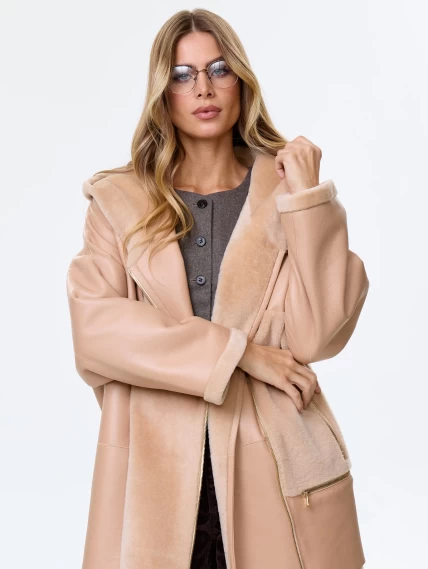 Молодежное полупальто из натуральной овчины для женщин с капюшоном премиум класса 2056, бежевое, размер 48, артикул 64350