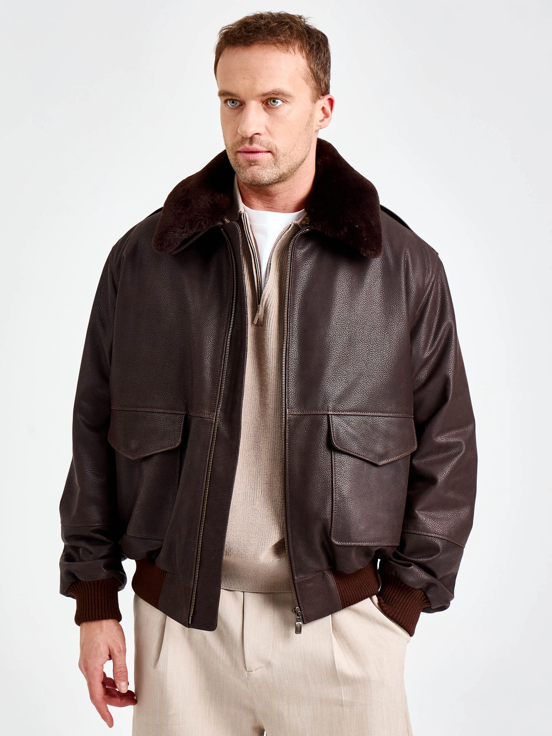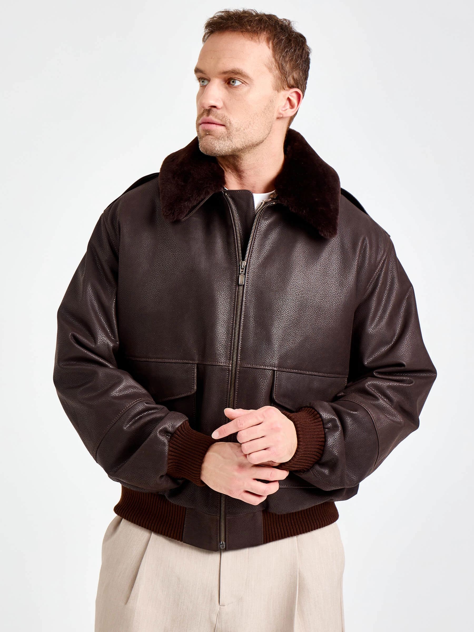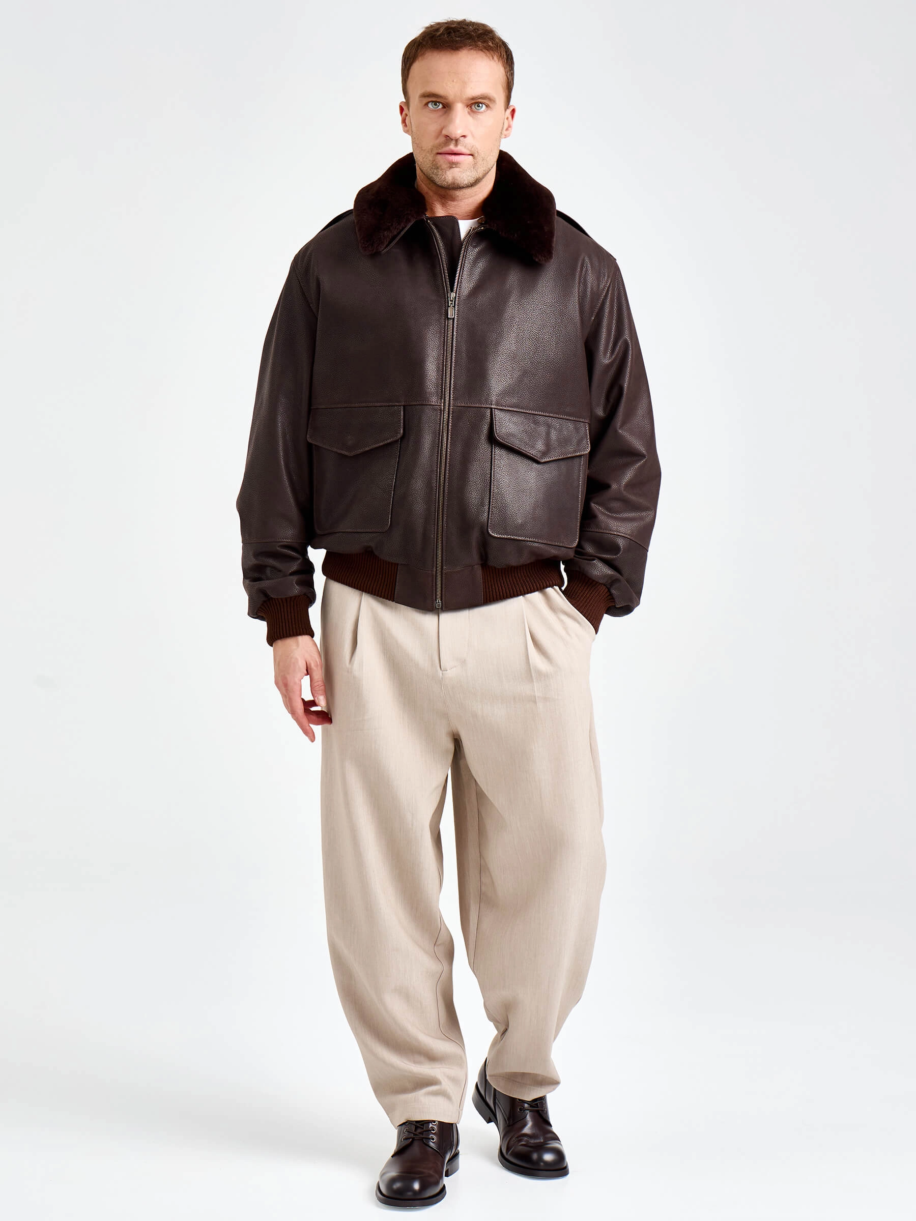 Куртку-пилот с большими накладными карманами закрывающиеся клапанами выполнили из коричневой кожи премиум класса. Свободный крой модели не сковывает движения. За комфорт отвечают плотные трикотажные манжеты и пояс. Изделие дополнили съемной подкладкой и встречной молнией. Густой шелковистый мех овчины подчеркнул отложной воротник.