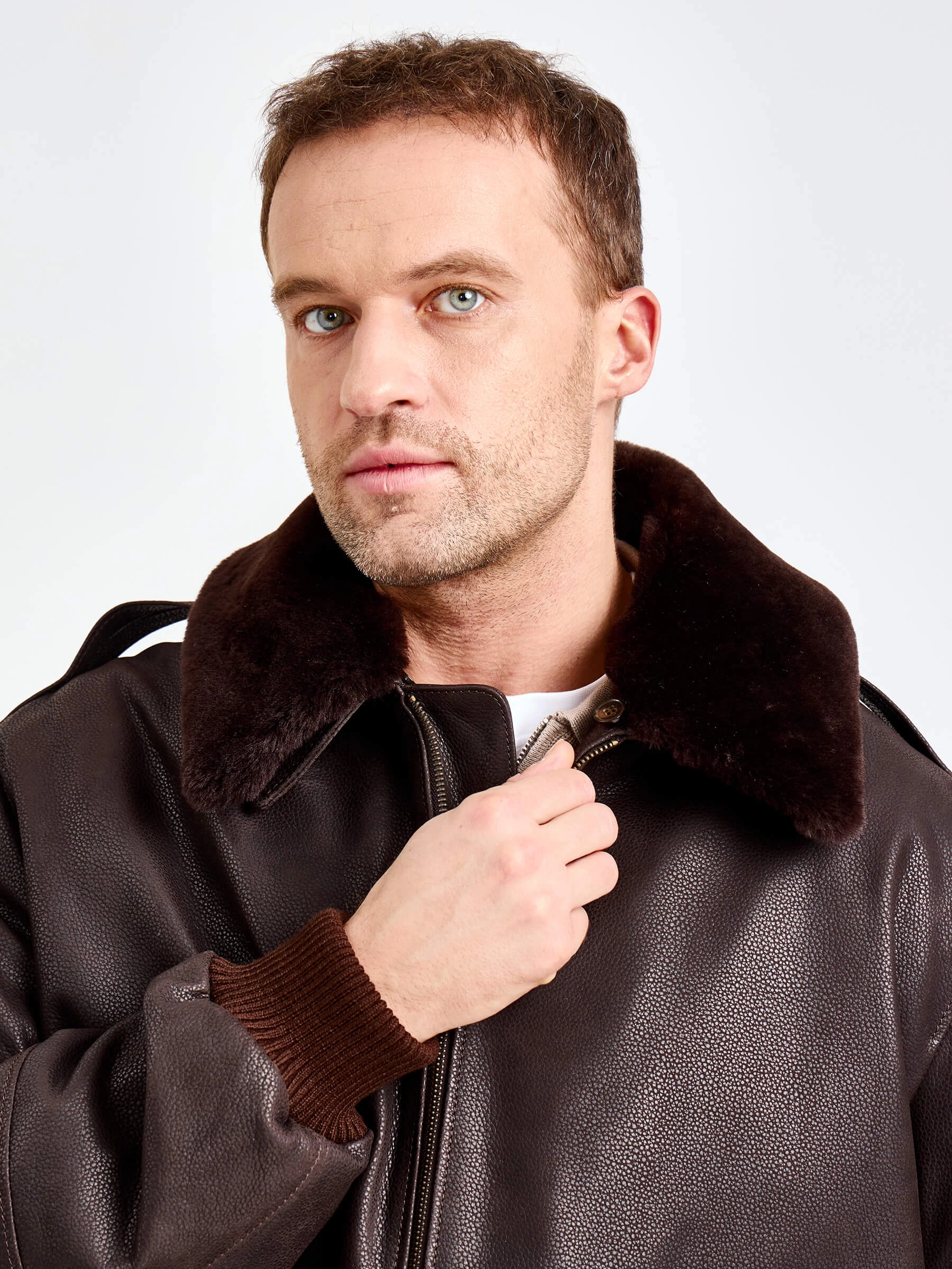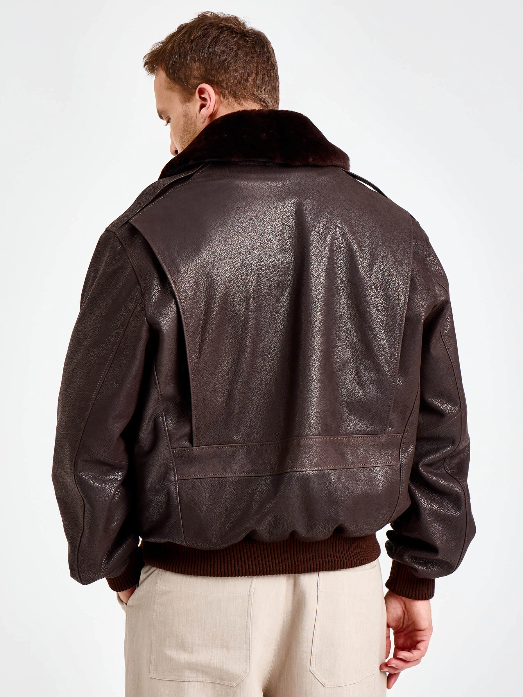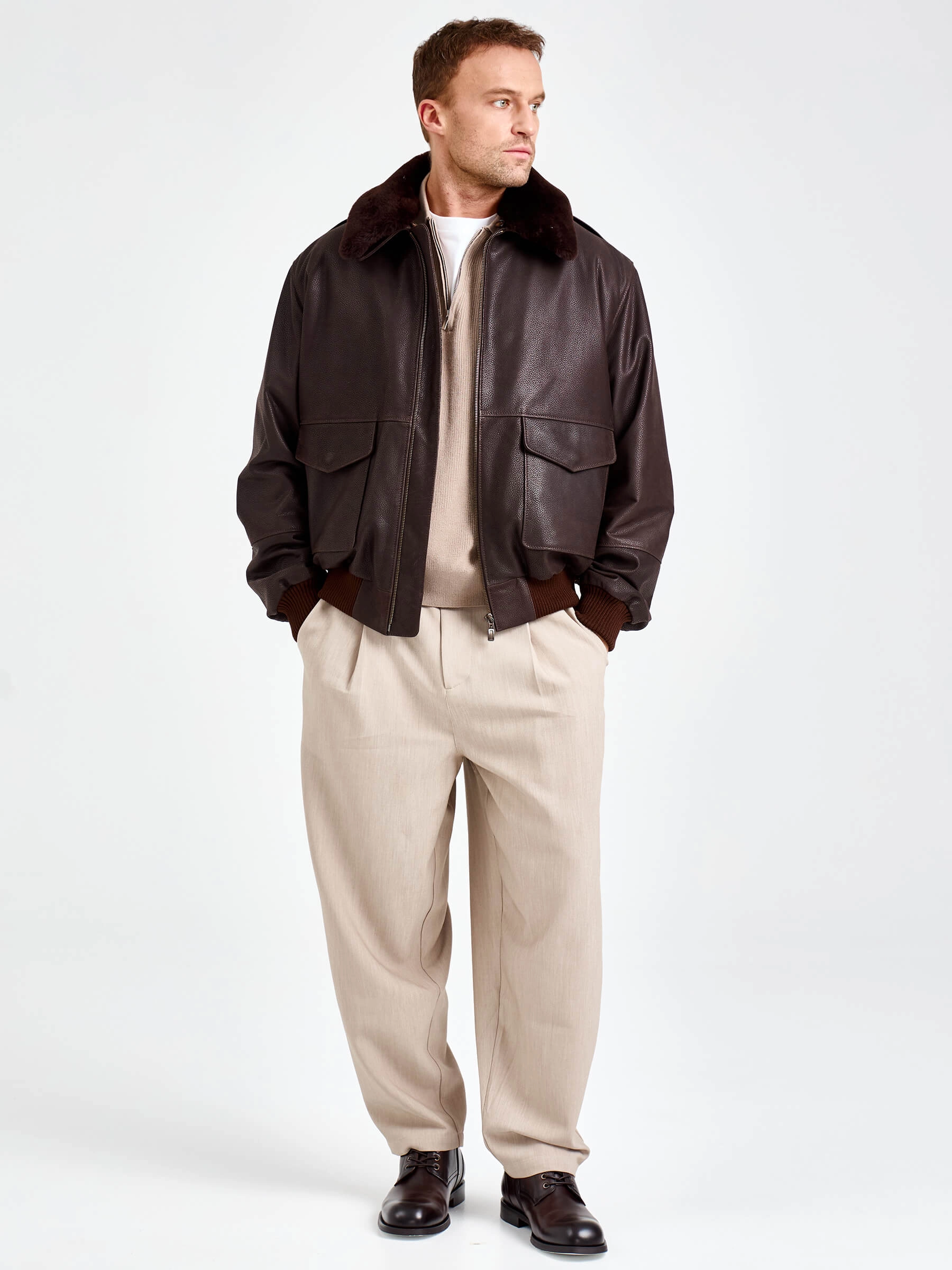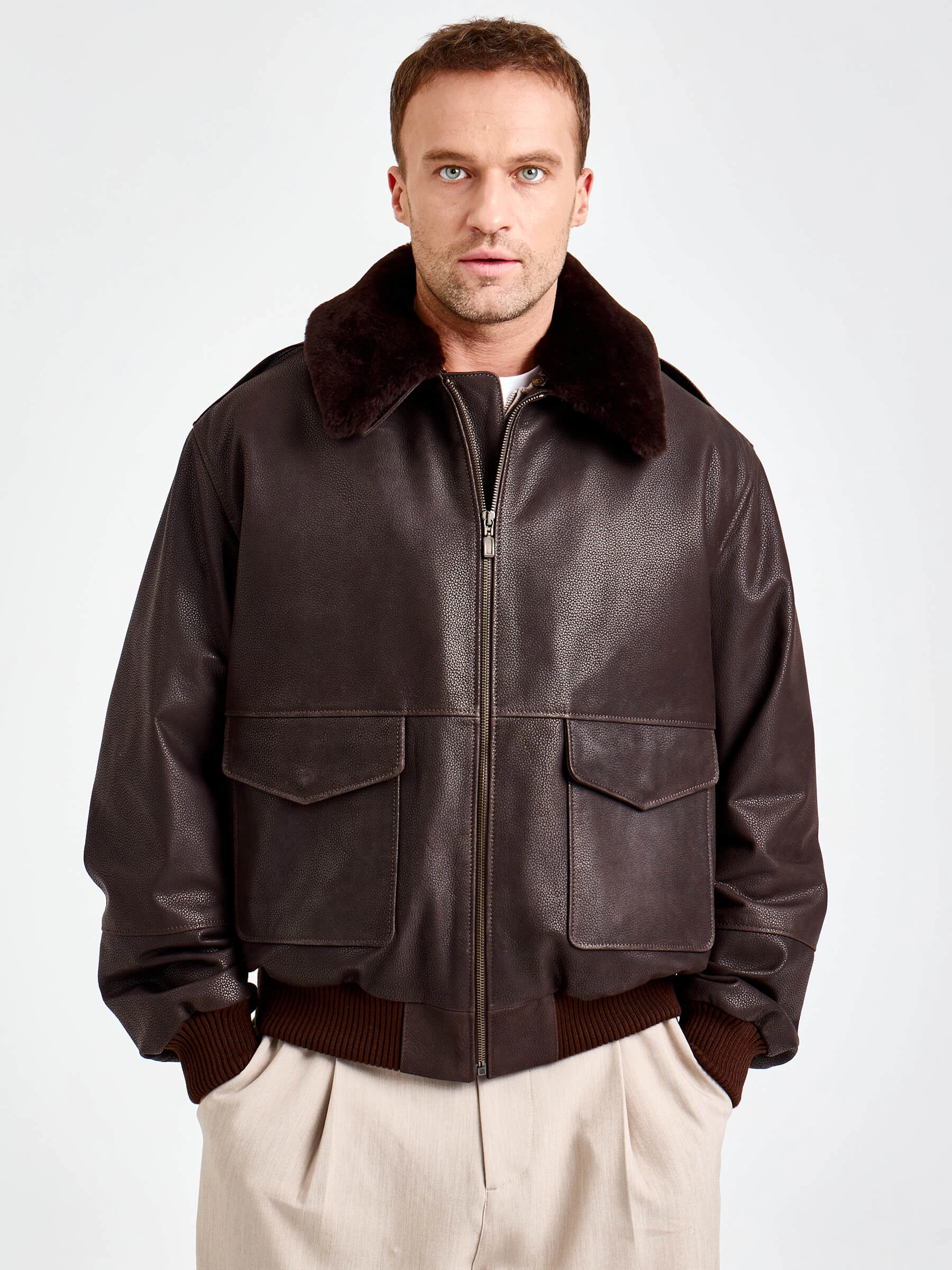 Куртку-пилот с большими накладными карманами закрывающиеся клапанами выполнили из коричневой кожи премиум класса. Свободный крой модели не сковывает движения. За комфорт отвечают плотные трикотажные манжеты и пояс. Изделие дополнили съемной подкладкой и встречной молнией. Густой шелковистый мех овчины подчеркнул отложной воротник.
