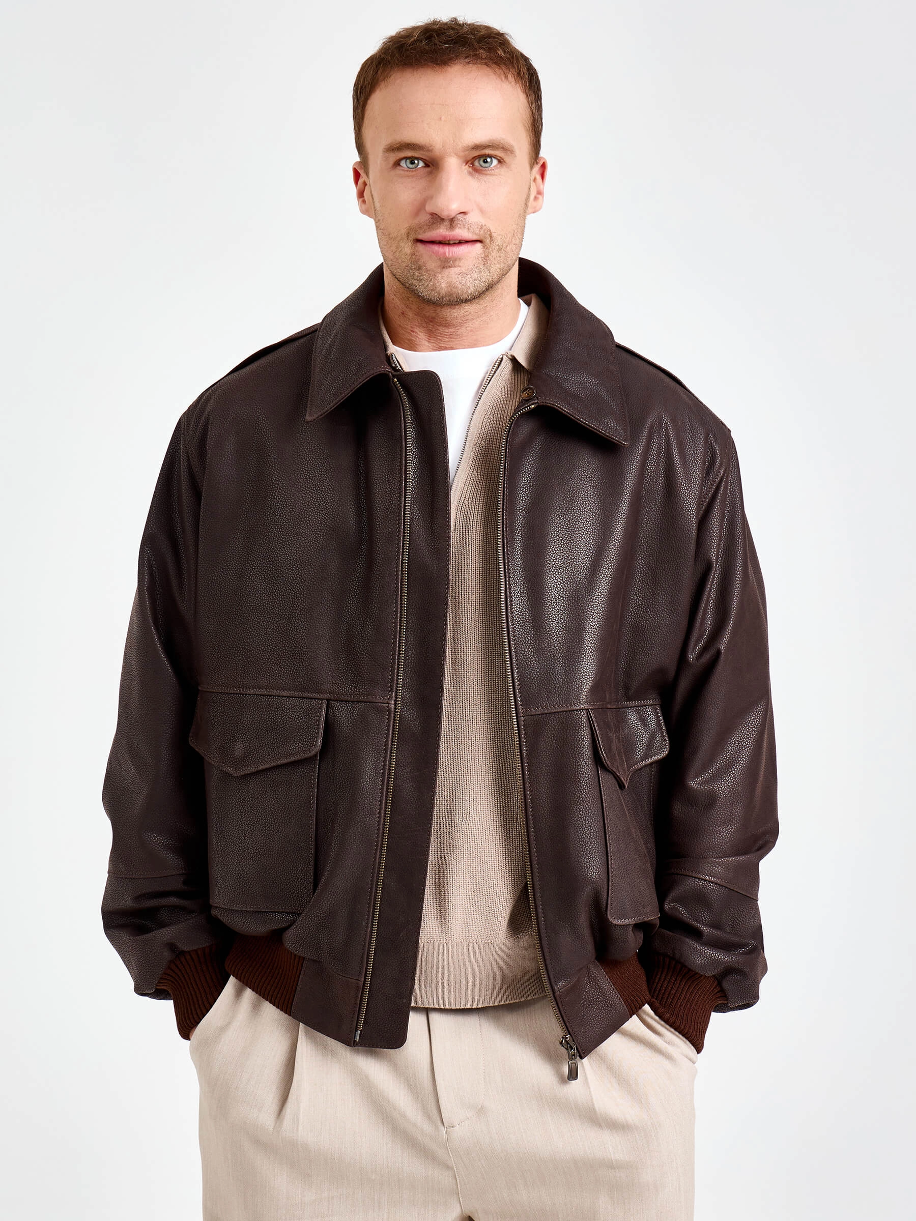 Товар мужская кожаная куртка пилот премиум класса 548, коричневая, размер 50, артикул 29860 выполнен из натуральной кожи с застежкой молния. Рассчитан на сезон: осень-зима. Длина изделия 70 см, силуэт свободный.