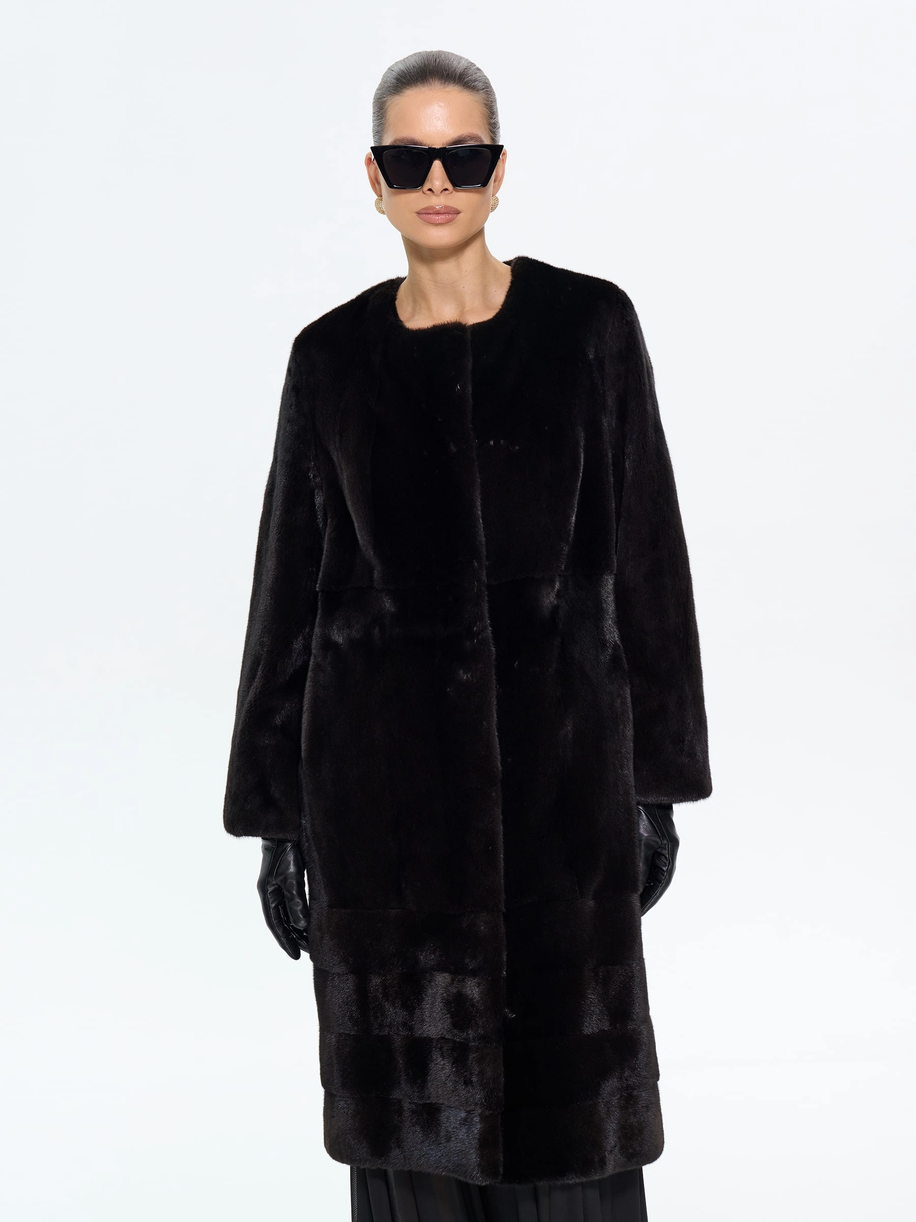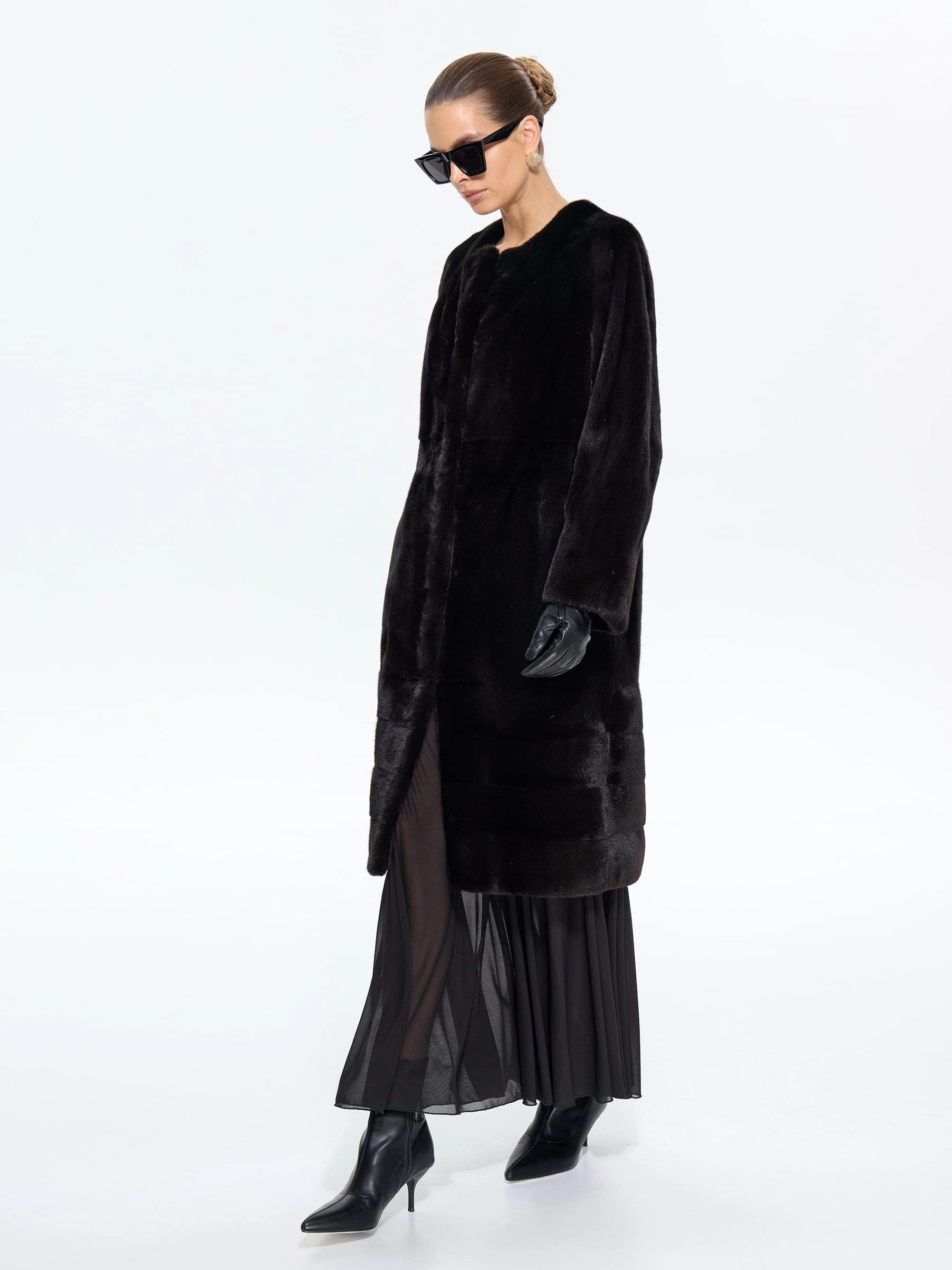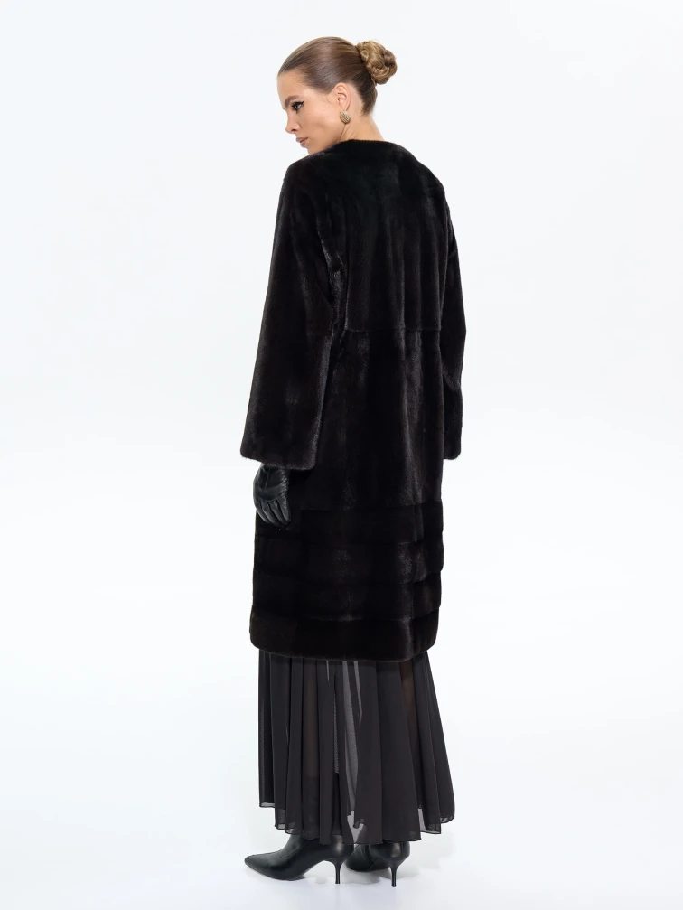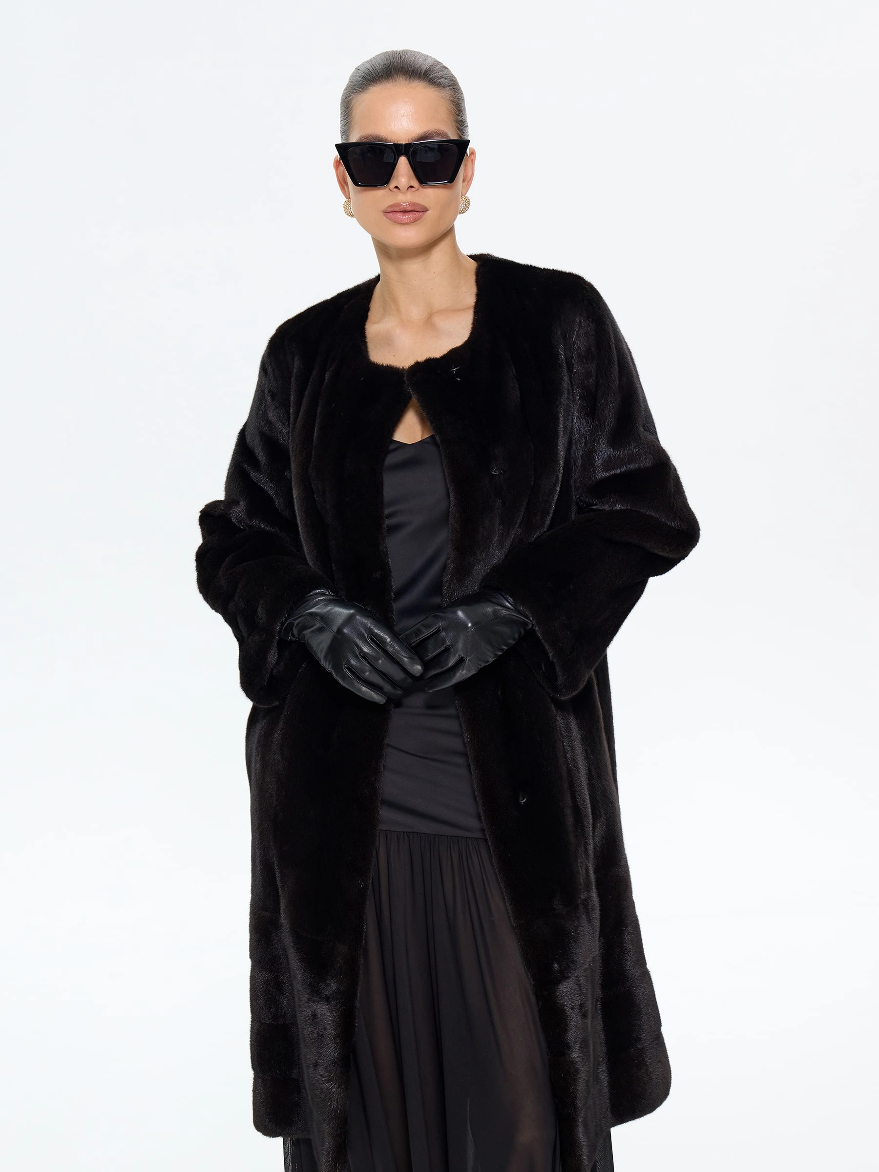Женская классическая шуба BRASCHI из натурального меха норки в роскошной длине "макси". Модель отличается современным минимализмом: у нее полностью отсутствует воротник, создавая элегантную открытую линию горловины, нет капюшона. Покрой рукава - реглан, обеспечивающий комфорт и свободу движений. Шуба не имеет декоративной отделки, позволяя первоклассному меху норки говорить самому за себя. Застегивается на классические металлические клипсы. Подкладка – вискоза. Предназначена для холодной зимы. Изделие выполнено в редком и роскошном оттенке "Violet Fox" (Лисий фиолет) – глубоком холодном цвете с изысканными фиолетово-синеватыми или иссиня-черными переливами. Длинный прямой силуэт в сочетании с отсутствием воротника и эксклюзивным цветом придает модели особую элегантность и статусность.