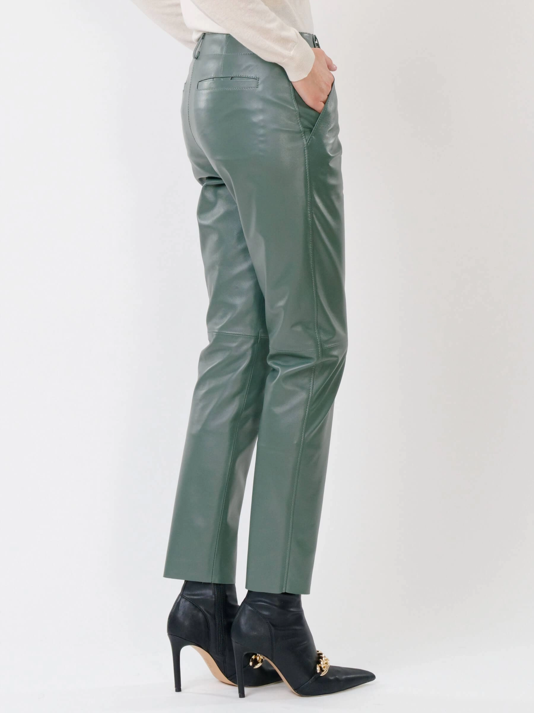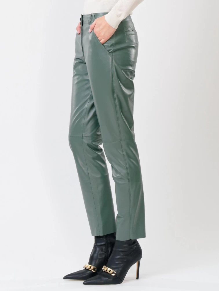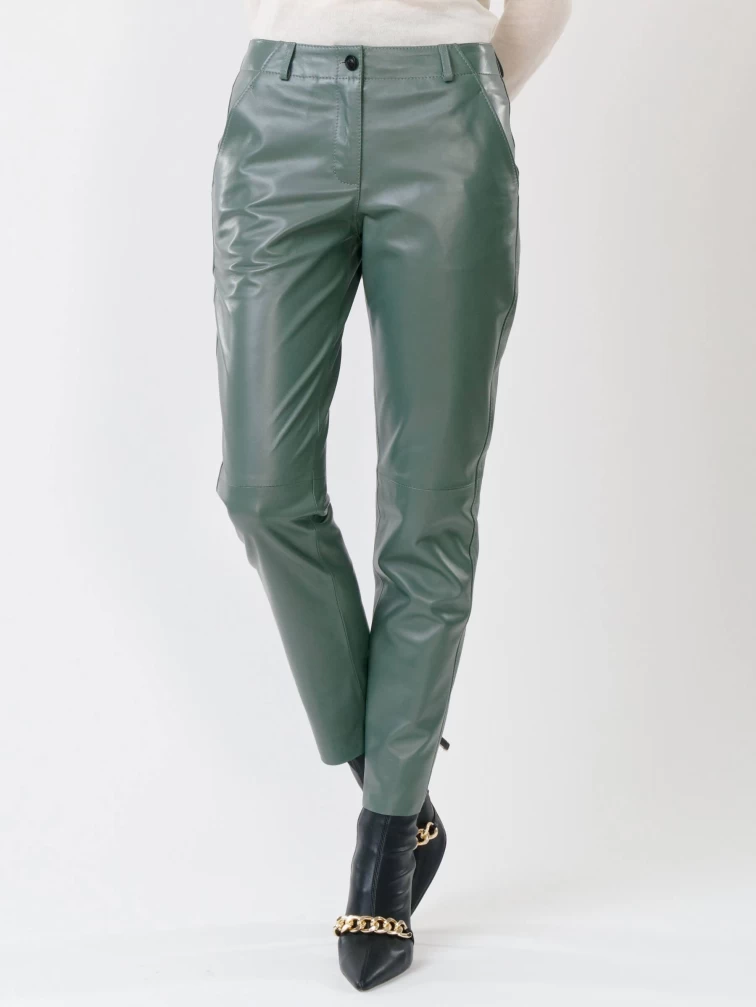Оливковые зауженные женские кожаные брюки 03, размер 44, артикул 85382
