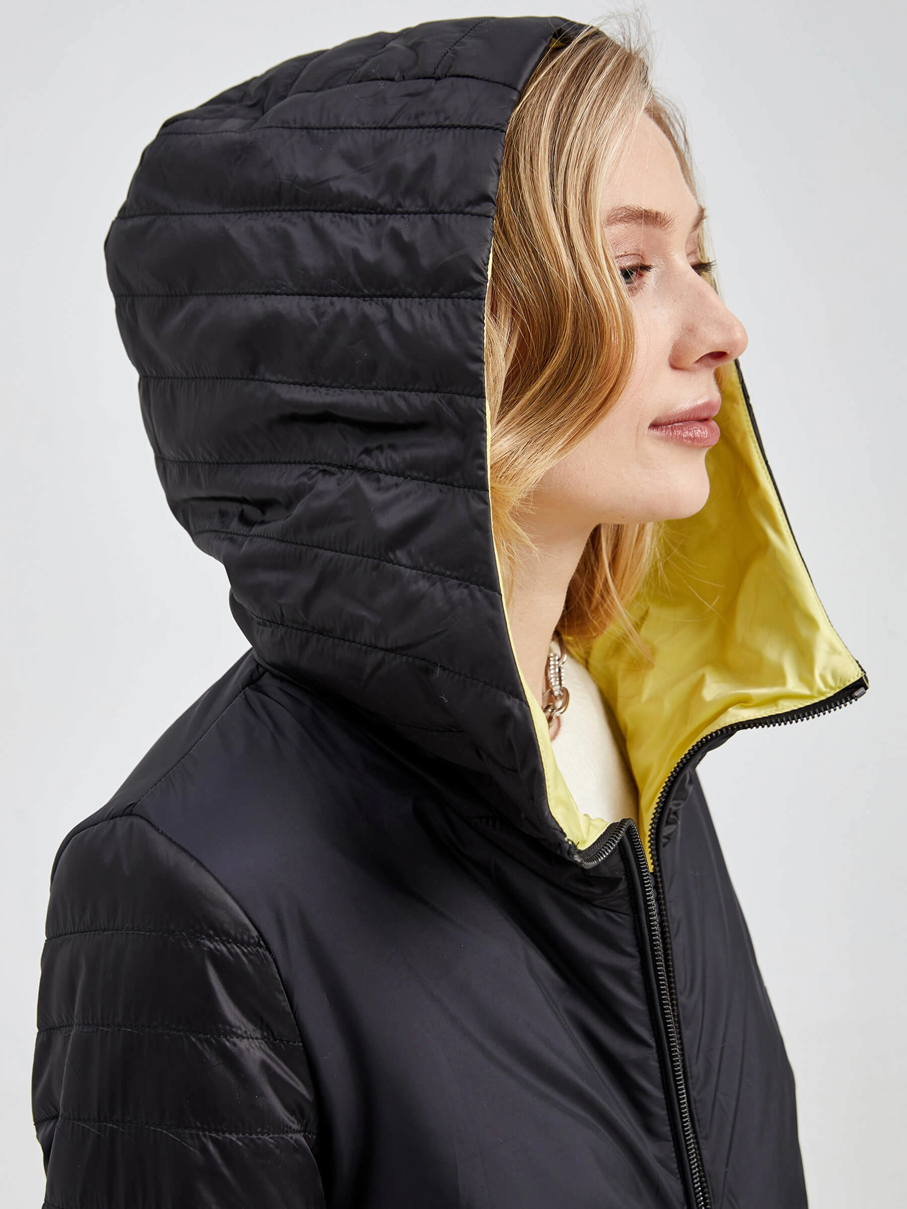 Товар текстильный двусторонний женский пуховик с капюшоном 21380 , черный, размер 42, артикул 25140 выполнен из текстиль с застежкой молния. Рассчитан на сезон: демисезон. Длина изделия свыше 90 см, силуэт прямой.