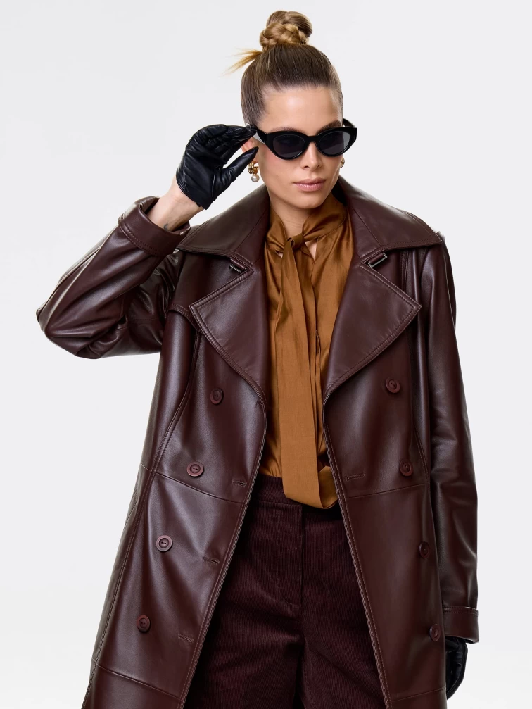 Элегантный кожаный плащ на пуговицах! Изготовленный из роскошной натуральной кожи нежнейшей выделки, двубортный тренч полуприлегающего силуэта обеспечивает идеальную посадку. Его отличает классический английский воротник на стойке и кожаный пояс, который подчеркнёт талию. Функциональность дополняют врезные карманы, втачные рукава с регулируемыми манжетами-отворотами и аккуратная шлица сзади. Этот универсальный повседневный плащ станет непререкаемым фаворитом вашего гардероба, великолепно сочетаясь с платьями, брючными костюмами или джинсами и дополняясь кожаными аксессуарами.