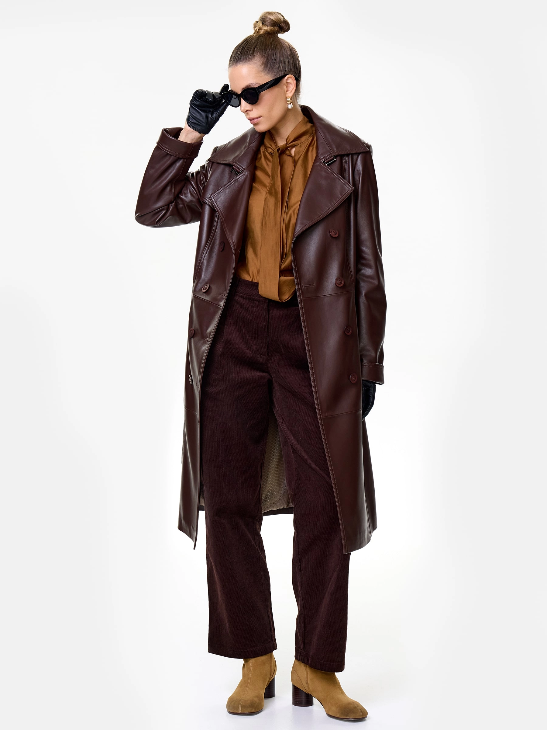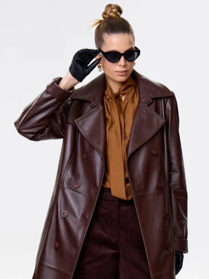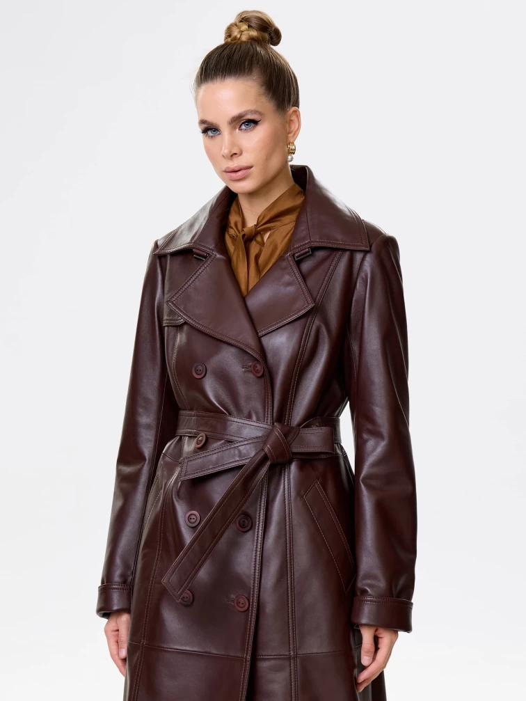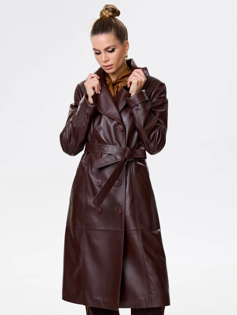 Кожаный двубортный женский плащ с поясом 3003, ореховый, размер 48, артикул 15650