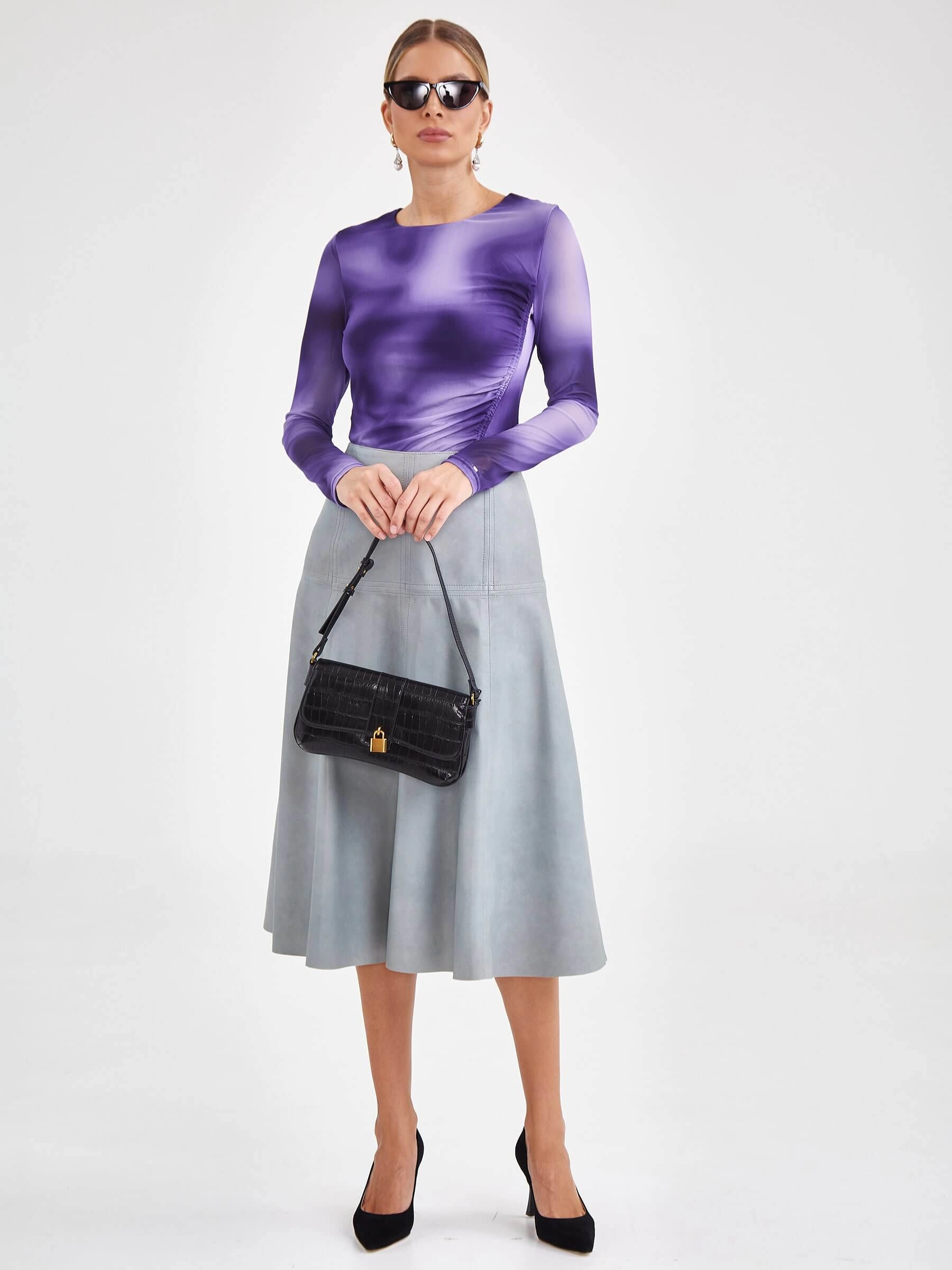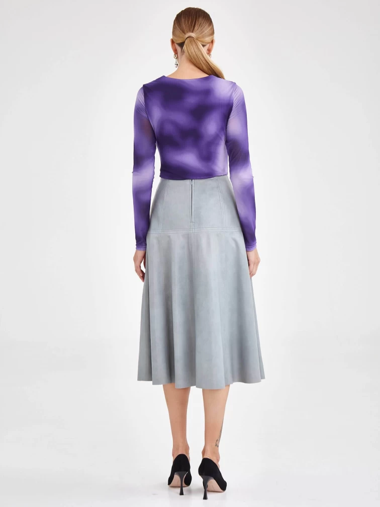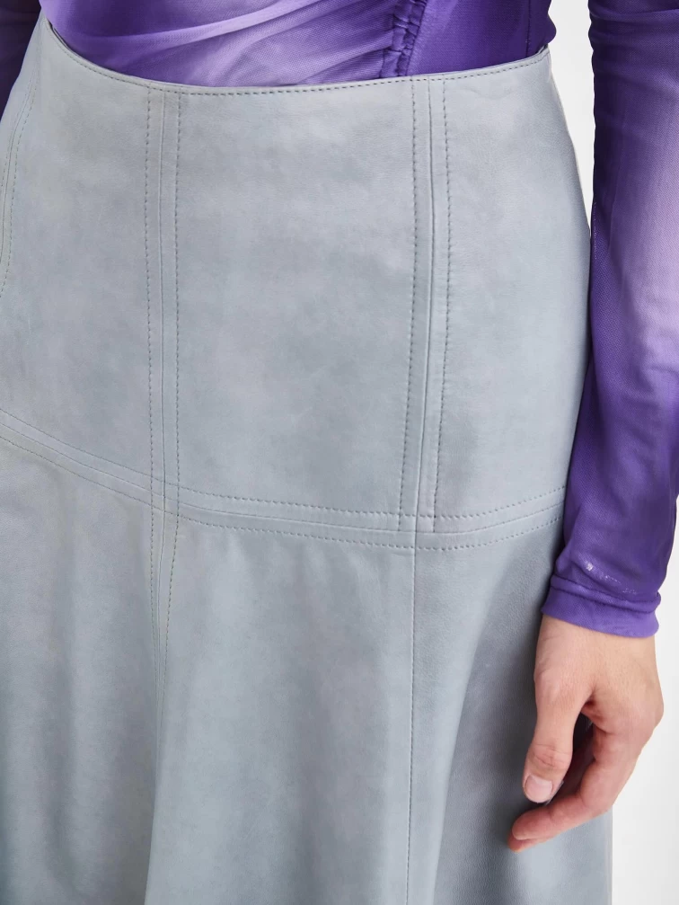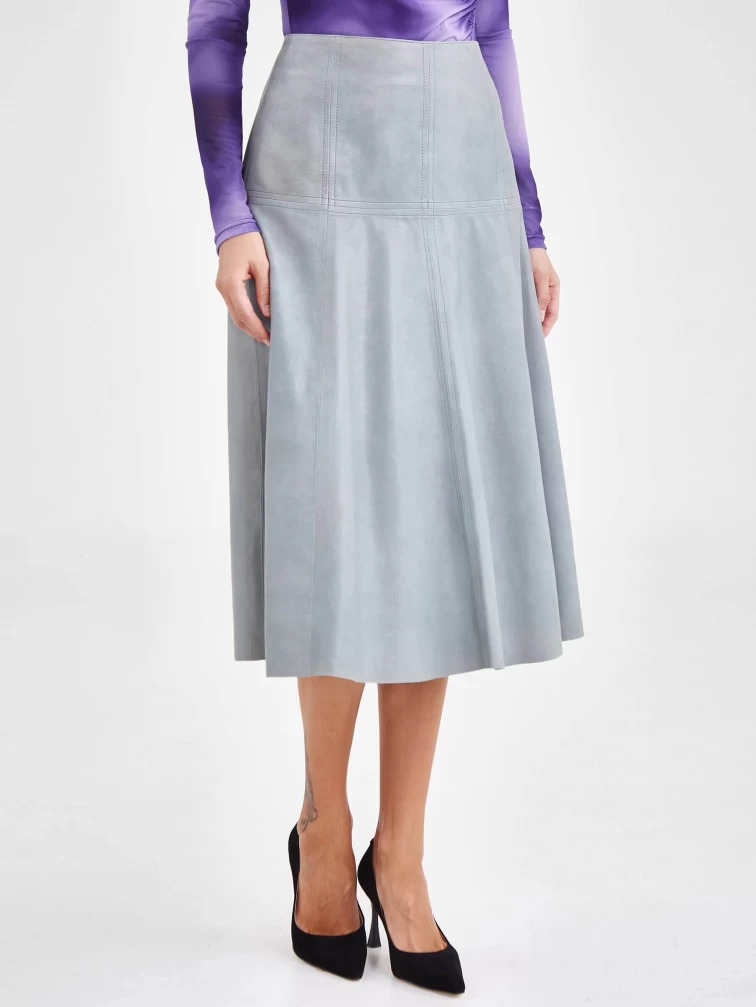 Женственная юбка-годе из натуральной кожи премиум-класса серо-голубого цвета сочетает облегающий верх с эффектным воздушным расширением к низу, создавая элегантный контраст силуэта. Потайная молния сзади обеспечивает чистые линии без пояса, а нежный дымчато-небесный оттенок тонкой кожи придает образу утонченность и лёгкость. Этот универсальный фасон легко трансформирует ваш стиль от романтичного ретро с водолазками и жакетами до современного дерзкого лука с объемными свитерами и грубыми ботинками, идеально дополняя как шелковые топы для вечернего выхода, так и повседневные образы с лаконичными блузами.