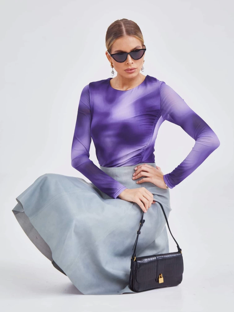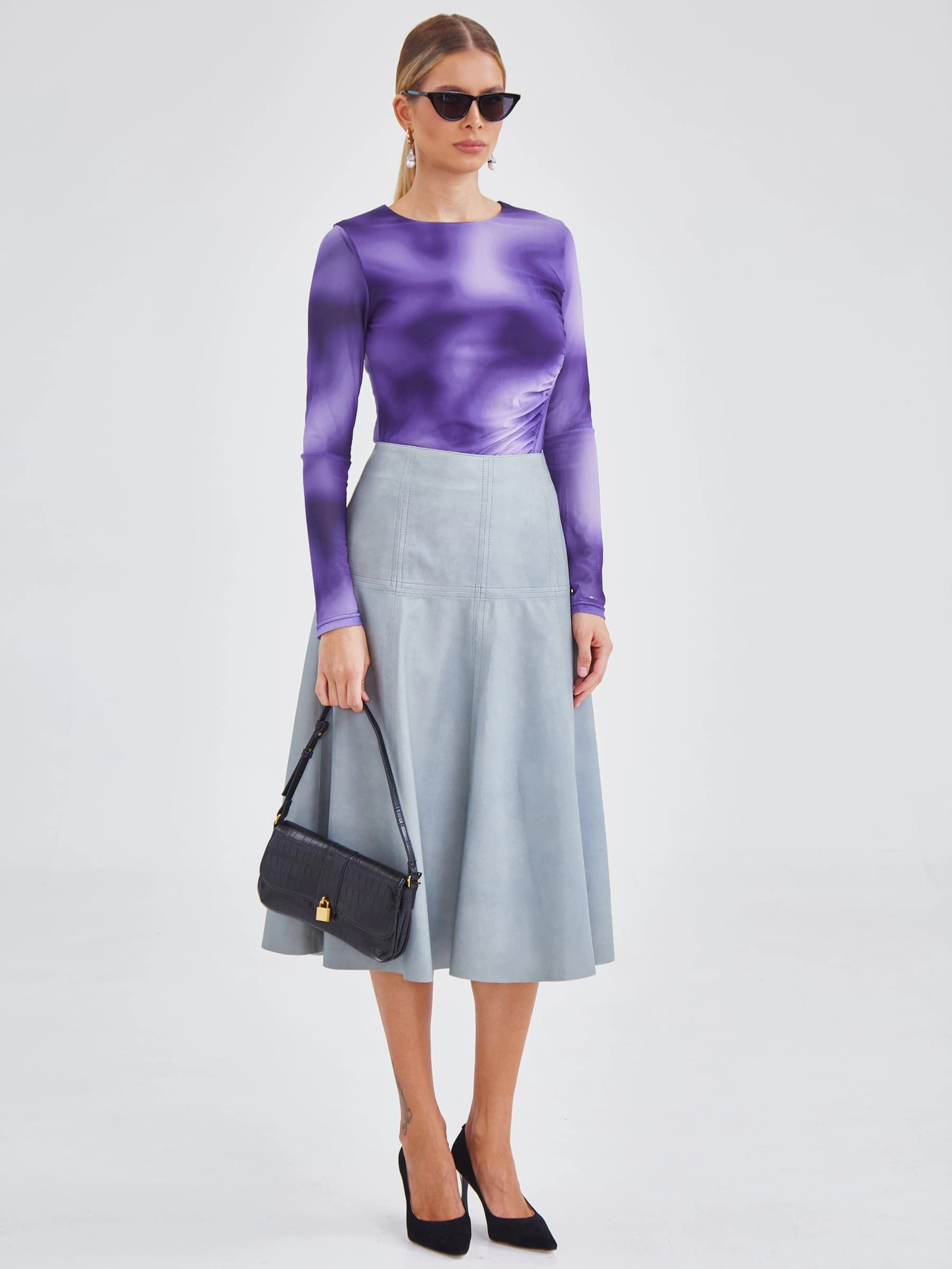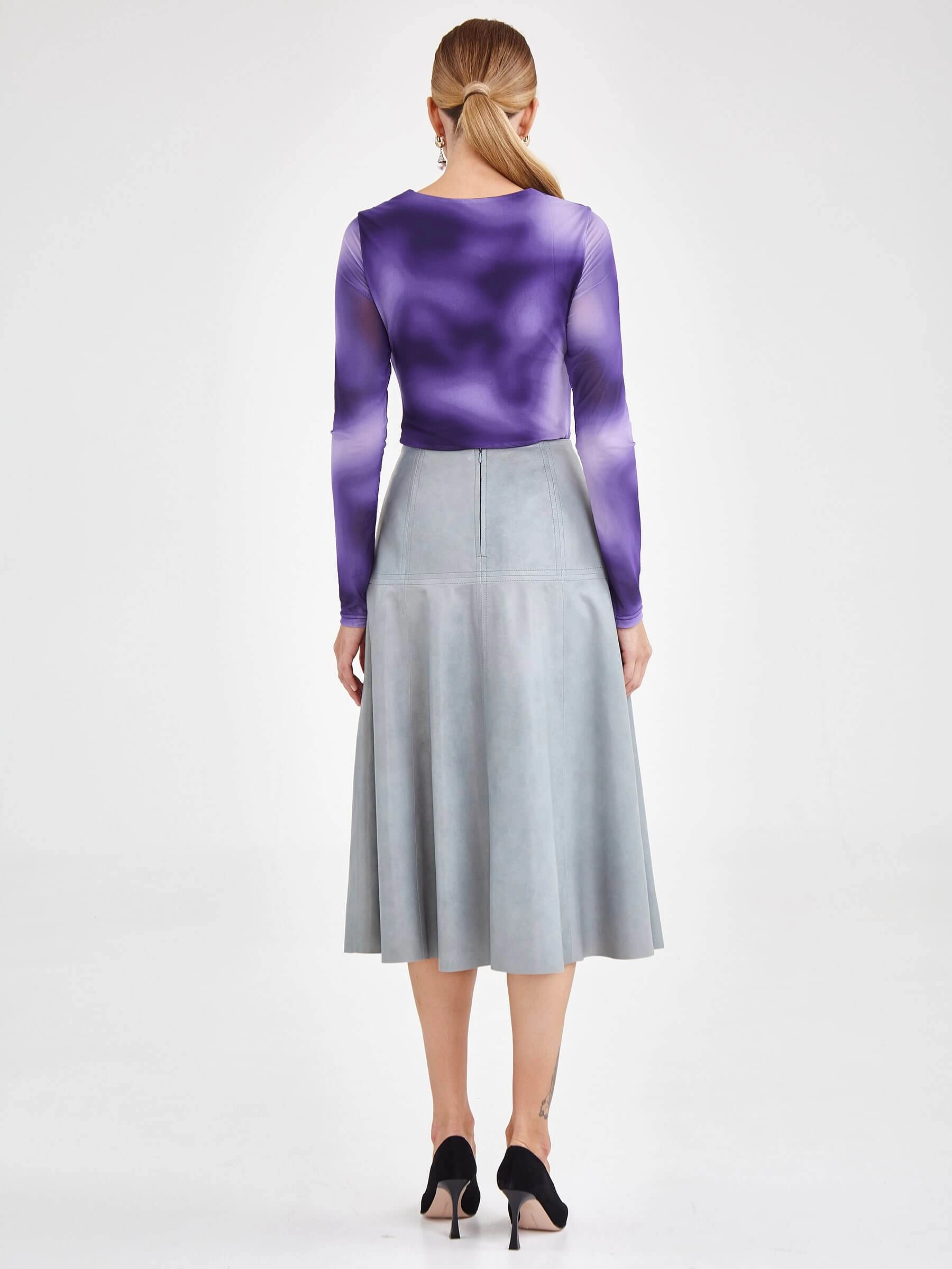 Женственная юбка-годе из натуральной кожи премиум-класса серо-голубого цвета сочетает облегающий верх с эффектным воздушным расширением к низу, создавая элегантный контраст силуэта. Потайная молния сзади обеспечивает чистые линии без пояса, а нежный дымчато-небесный оттенок тонкой кожи придает образу утонченность и лёгкость. Этот универсальный фасон легко трансформирует ваш стиль от романтичного ретро с водолазками и жакетами до современного дерзкого лука с объемными свитерами и грубыми ботинками, идеально дополняя как шелковые топы для вечернего выхода, так и повседневные образы с лаконичными блузами.