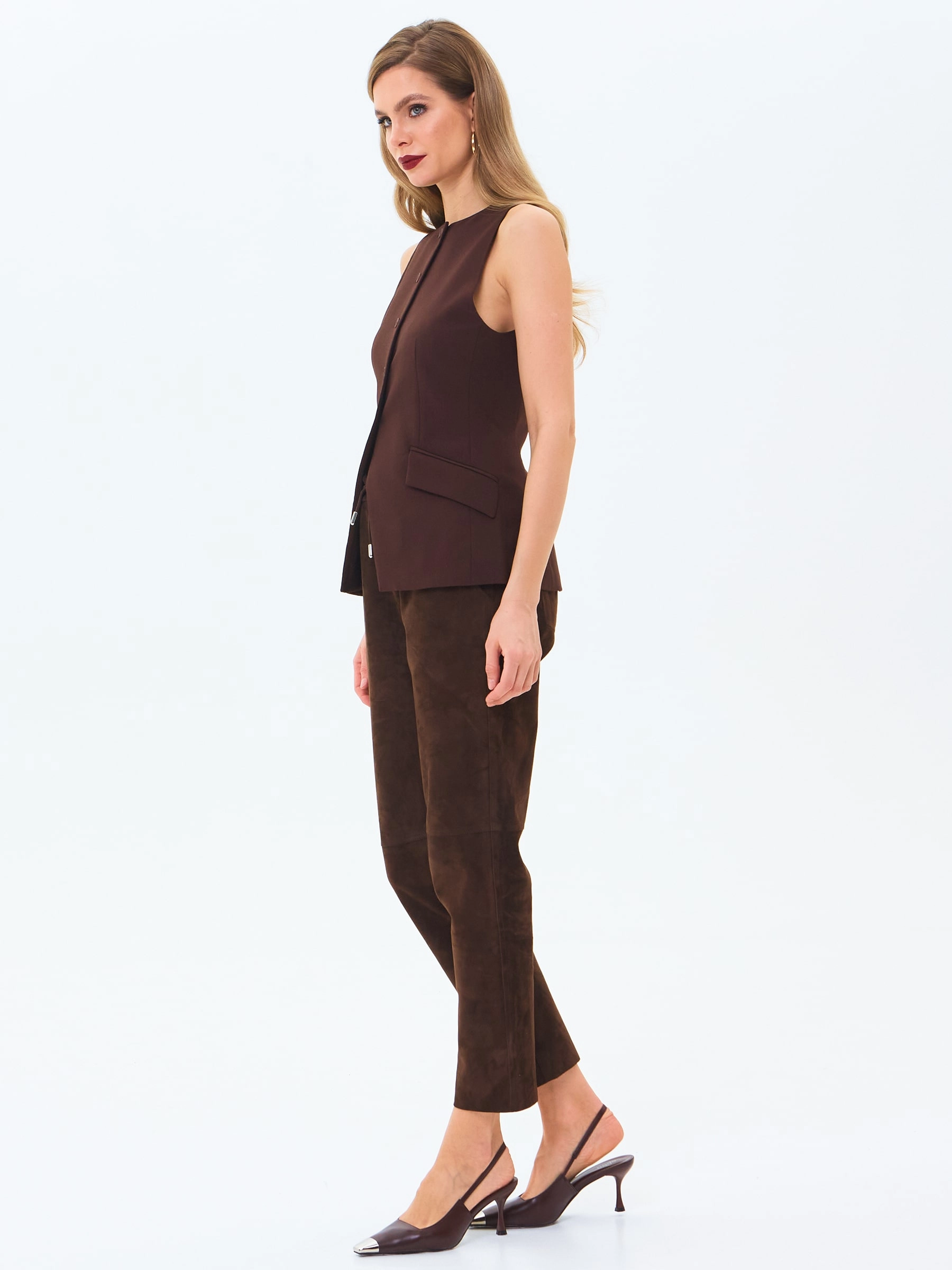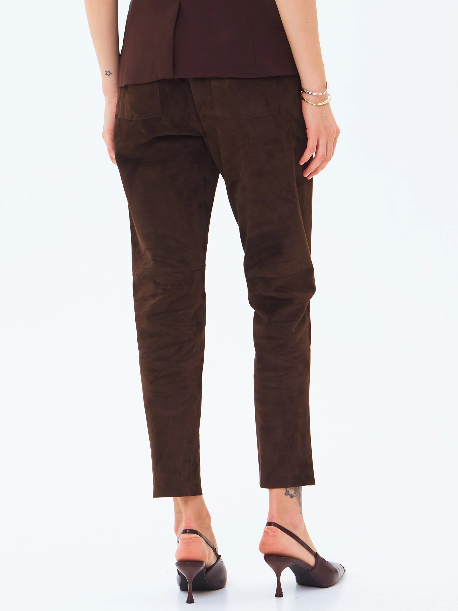 Прямые брюки из мягкой натуральной замши в теплом коричневом цвете – идеальный выбор для ценителей комфорта и стиля. Удобная посадка на кулиске, практичные карманы и благородный оттенок делают эту модель must-have в осенне-зимнем гардеробе. Сочетайте с разными верхами – от объемных джемперов до строгих рубашек – и создавайте неповторимые образы на каждый день.