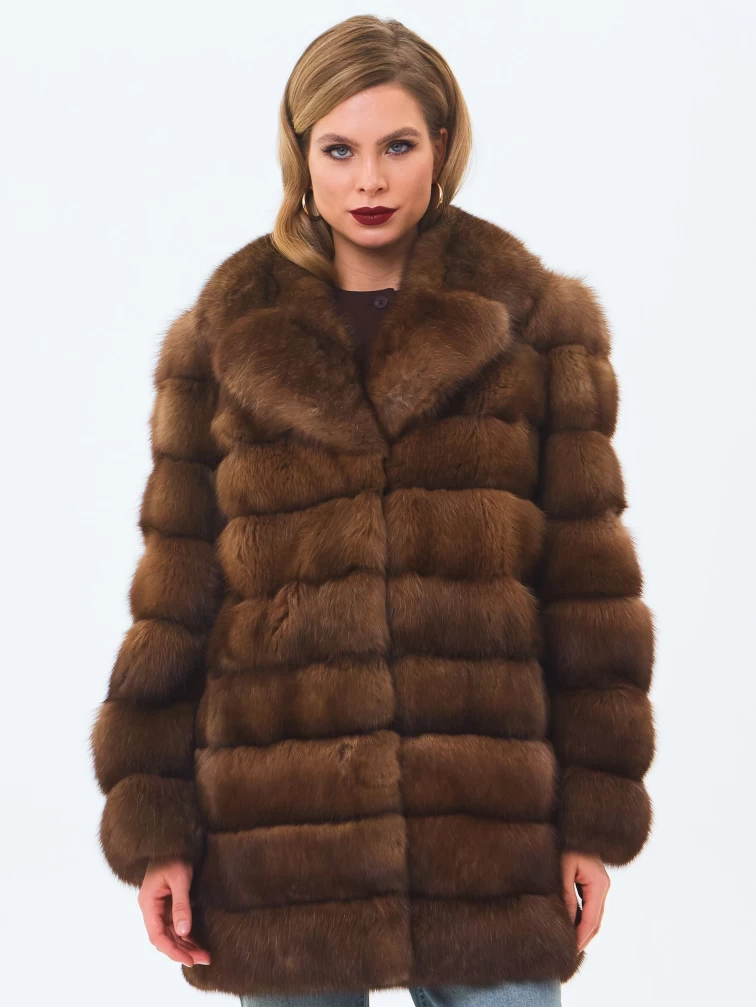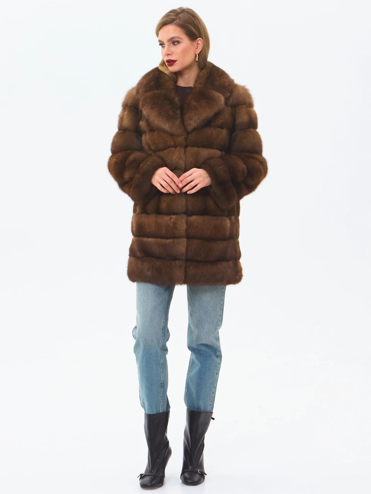 Эффектная шубка из меха соболя. Английский воротник с широкими лацканами. Диагональная раскладка меха. Способность сохранять тепло за счет очень плотного густого подшерстка, мягкого и шелковистого на ощупь. Невероятно легкая и комфортная шубка застегивается клипсами! Безупречный подбор меха. Премиальное качество.