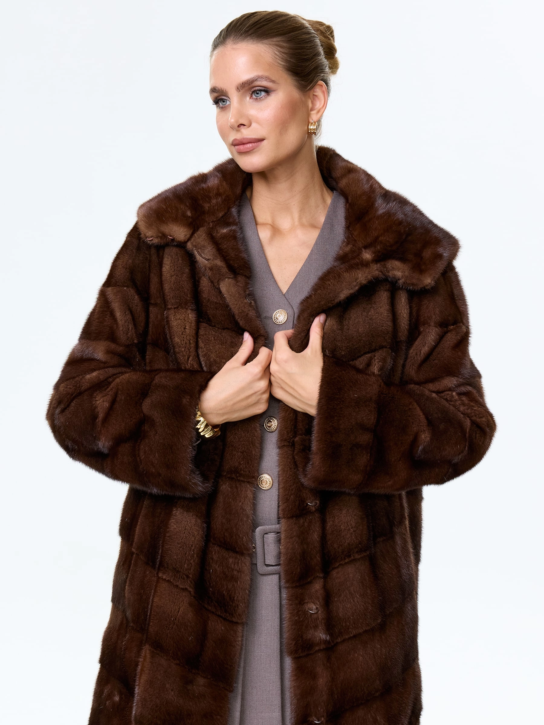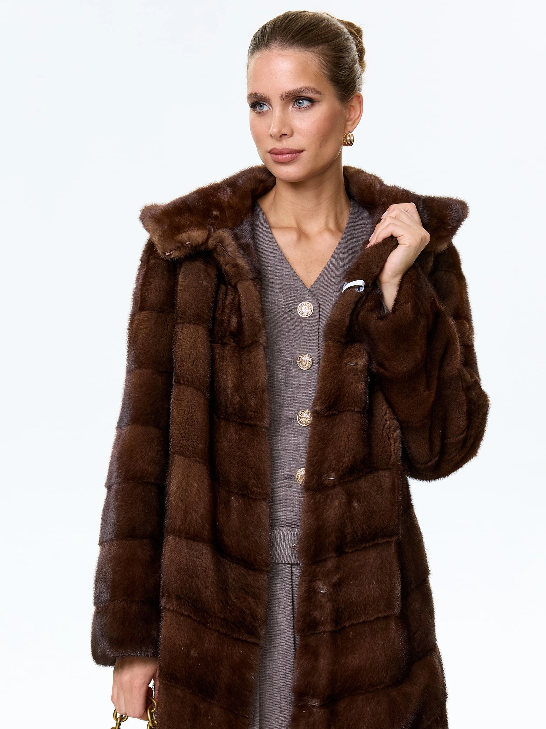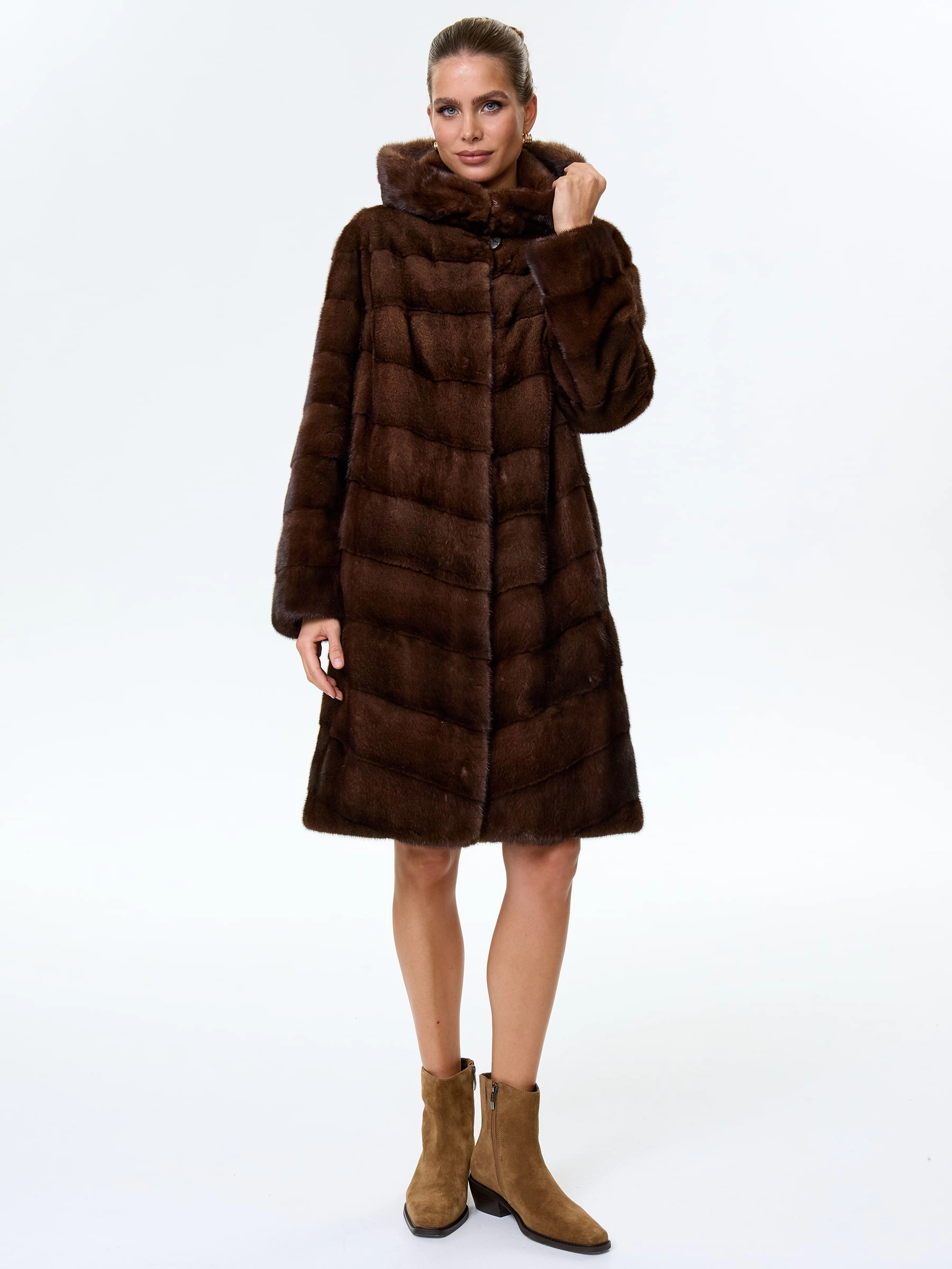 Для пошива шубы прямого кроя использовали шелковистый мех норки. Модель дополнили двумя боковыми карманами и объемным капюшоном. Изделие застегивается клипсами.