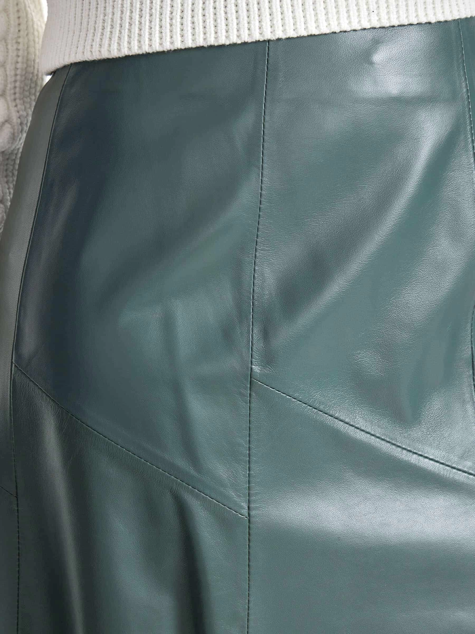 Стильная юбка из натуральной кожи с заниженной талией без пояса сочетает изысканность с современной дерзостью, демонстрируя идеально гладкую пластичную кожу премиального качества, которая облегает бёдра и мягко расклешёвывается книзу благодаря элегантным вставкам-годе, создавая при каждом шаге эффектный струящийся объём. Потайная молния на спинке обеспечивает удобство и сохраняет чистоту линий, а универсальный дизайн делает модель идеальной для создания разнообразных образов — от офисных до вечерних. Эта юбка легко сочетается с базовыми топами, классическими лодочками, модными кроссовками или изысканными аксессуарами, сохраняя все преимущества натуральной кожи: пластичность, комфорт и благородный блеск, что делает её прекрасным выбором для города, работы и особых случаев.