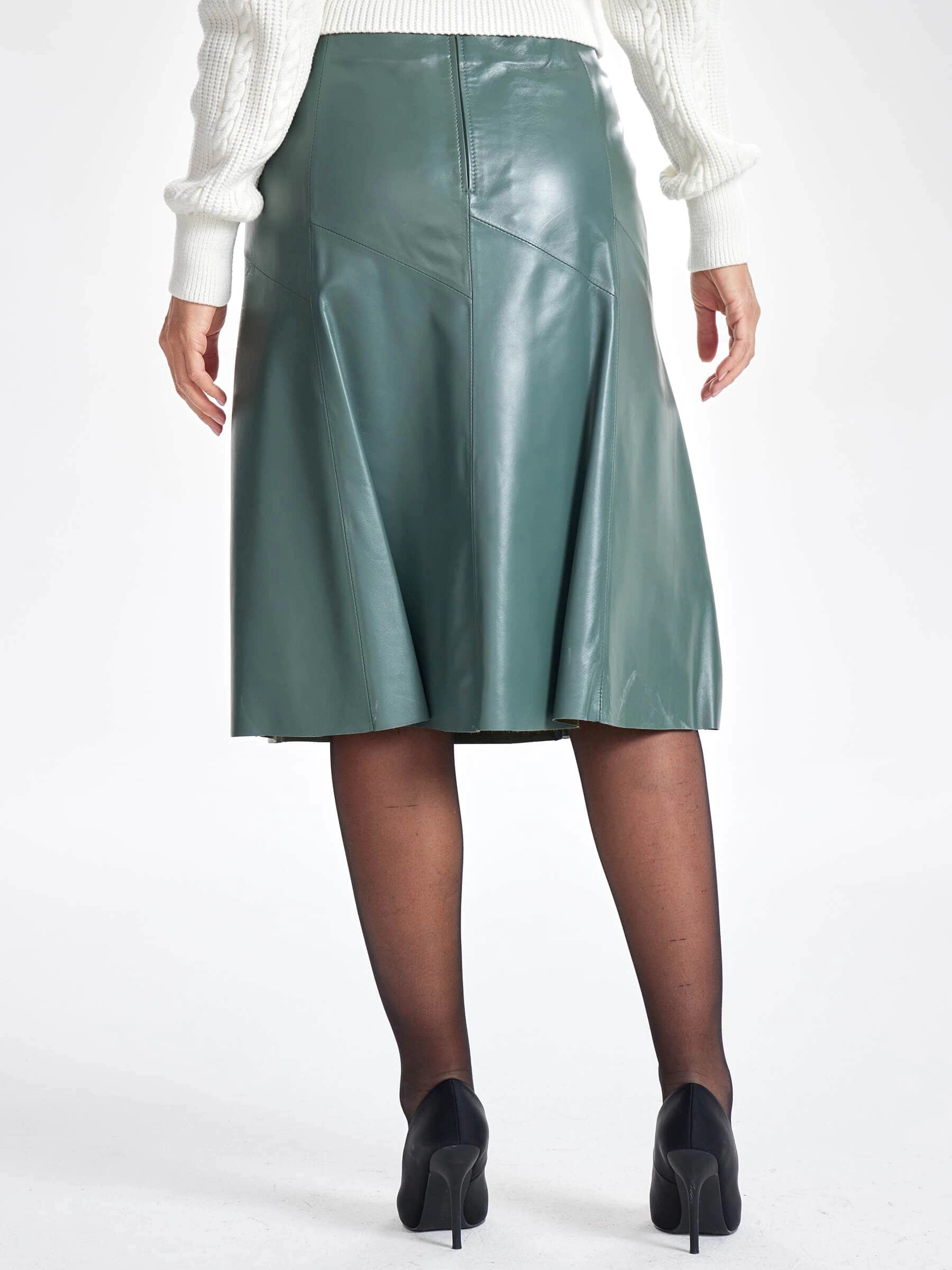Расклешенная кожаная юбка 04, оливковая, размер 46, артикул 85400