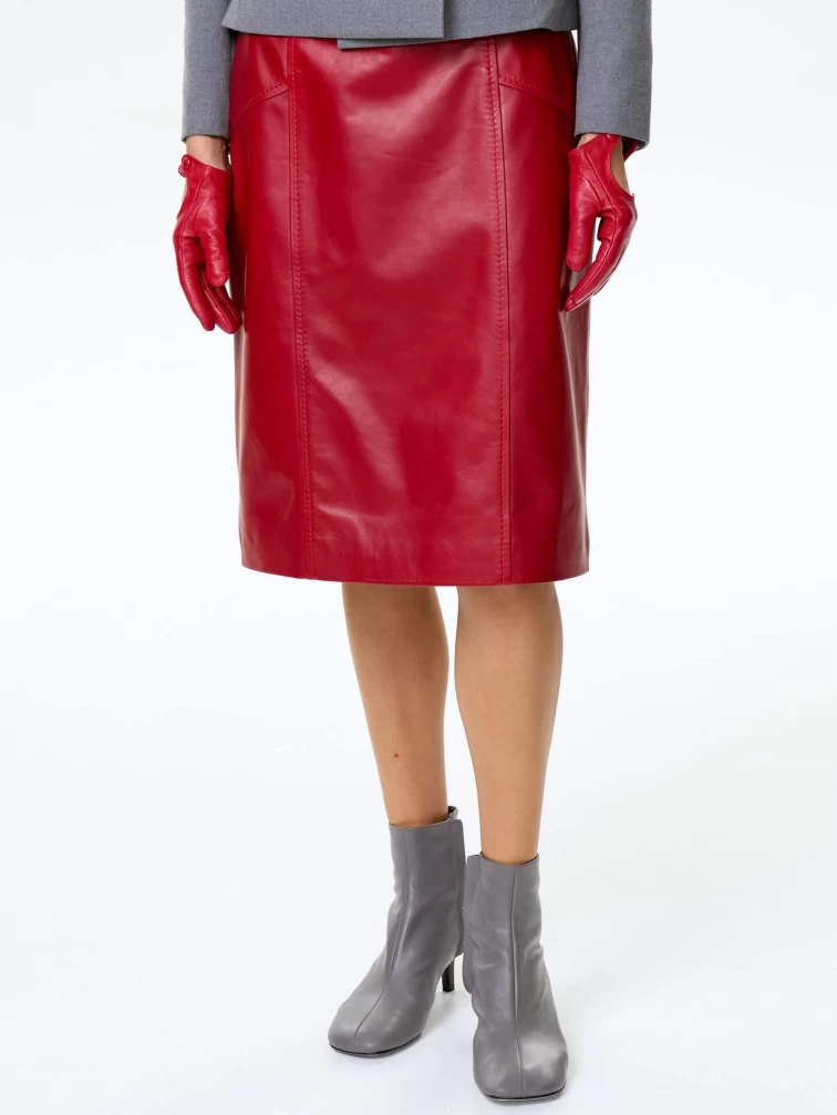 Юбка-карандаш из мягкой натуральной кожи насыщенного красного оттенка сочетает строгий прямой силуэт с элегантными деталями. Боковые кокетки с деликатной строчкой подчеркивают качество исполнения, а практичная шлица сохраняет удобство носки. Идеально комбинируется с монохромными блузами для делового стиля или с контрастными жакетами для создания акцентного образа.