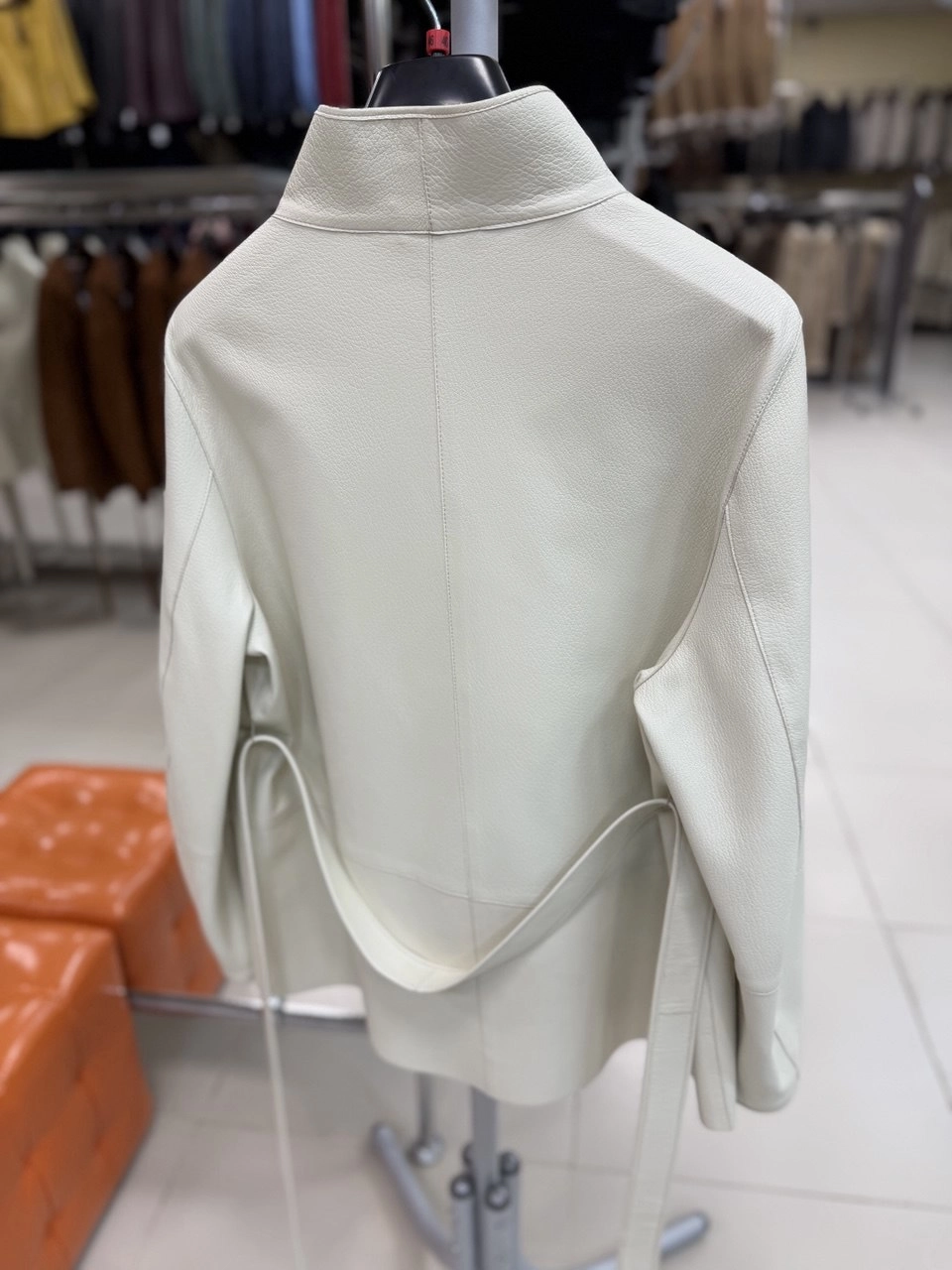 Роскошная модель длиной 70 см из мягкой белой кожи прямого кроя: благородный шалевидный воротник и боковые накладные карманы создают элегантный силуэт, а длинный пояс-лента позволяет менять посадку по фигуре. Застёжка на кнопках добавляет практичности и лаконичности. Совет стилиста: носите с кожаными брюками и сапогами-ботфортами для вечернего образа или с джинсами-скинни и объёмным свитером крупной вязки для повседневного уюта — эта куртка станет вашим фаворитом благодаря универсальности и безупречному качеству кожи