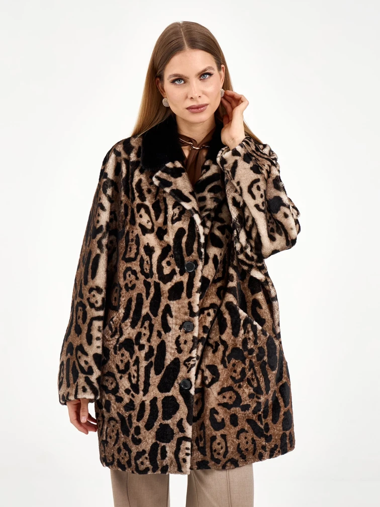 Эта удлиненная дубленка свободного кроя из натуральной овчины с леопардовым принтом сочетает в себе дерзость и элегантность. Английский воротник с отделкой из меха норки и лацканы из овчины под леопарда создают игру фактур. Рекомендация: наденьте ее с однотонной основой — темными джинсами, водолазкой и сапогами на каблуке, чтобы образ получился стильным и сбалансированным. Идеальная модель для создания модного образа с акцентом.