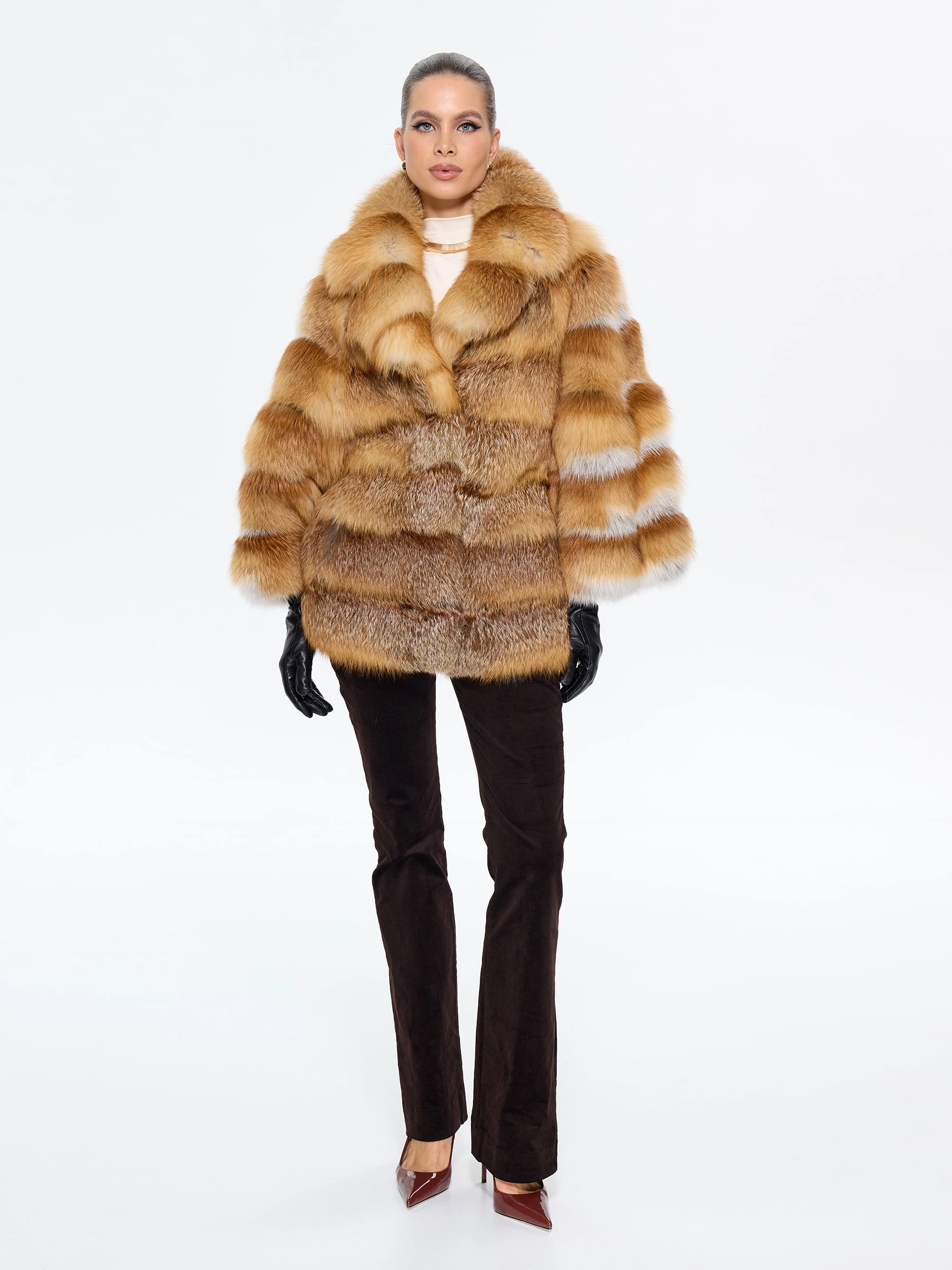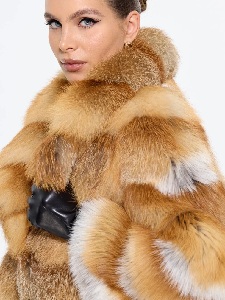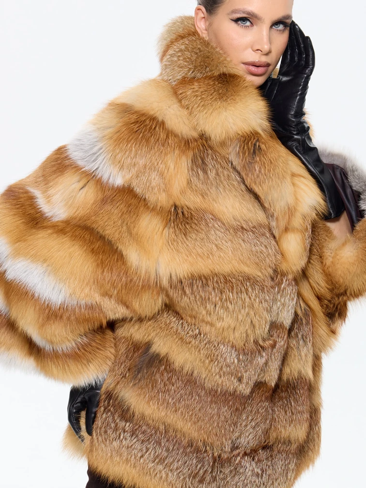 Эффектная короткая шуба из меха лисы с элегантным английским воротником — для тех, кто не боится заявить о своем стиле! Модель длиной 70 см с прямым силуэтом и смечными рукавами кимано подчеркивает индивидуальность, а роскошный мех создает объем и драматизм. Стилисты рекомендуют носить эту дерзкую модель с кожаными брюками и грубыми ботинками для создания уличного образа или с облегающим платьем и сапогами-ботфортами для вечернего выхода — она станет главным акцентом вашего гардероба, подчеркивающим смелый и современный вкус.