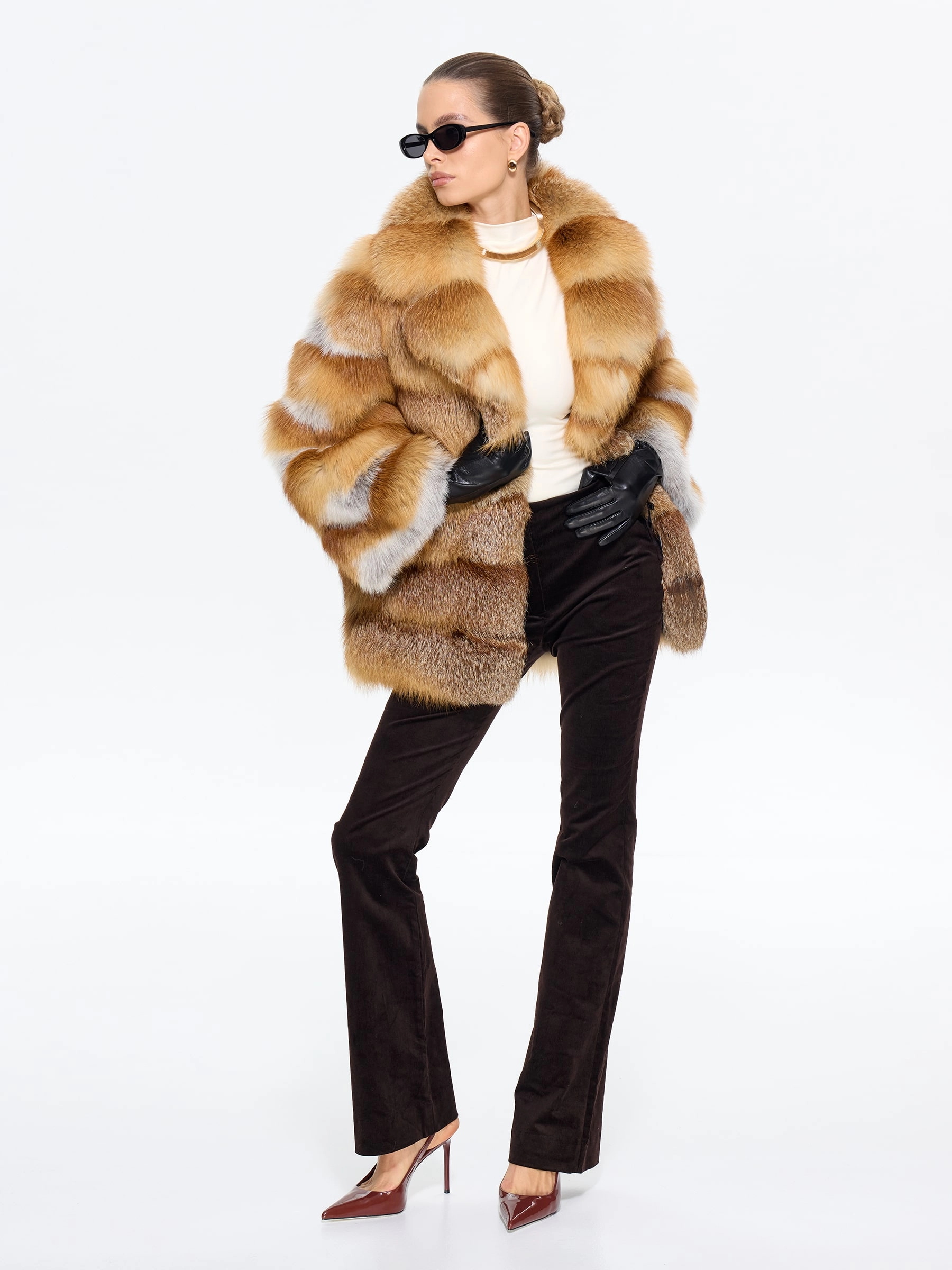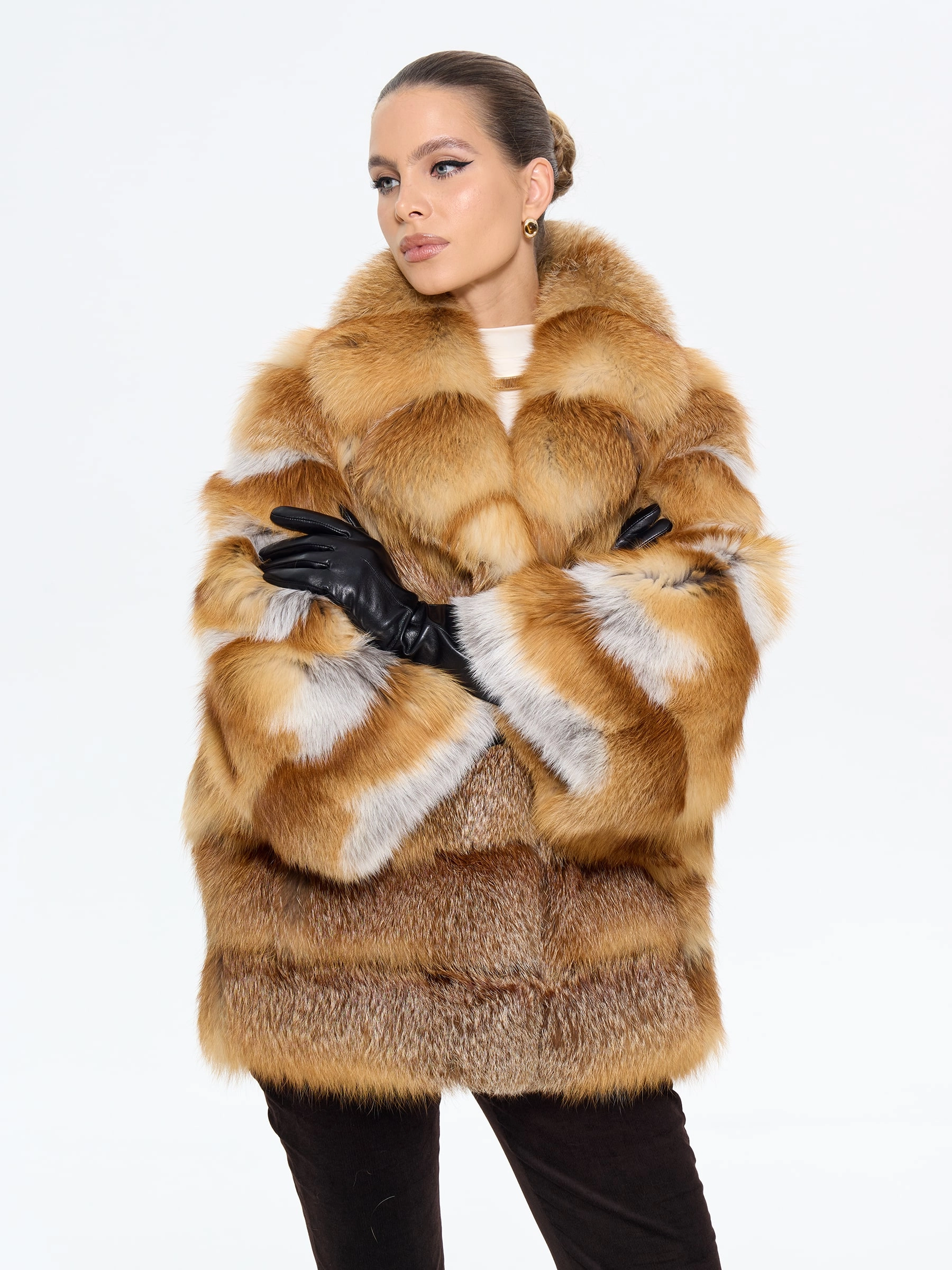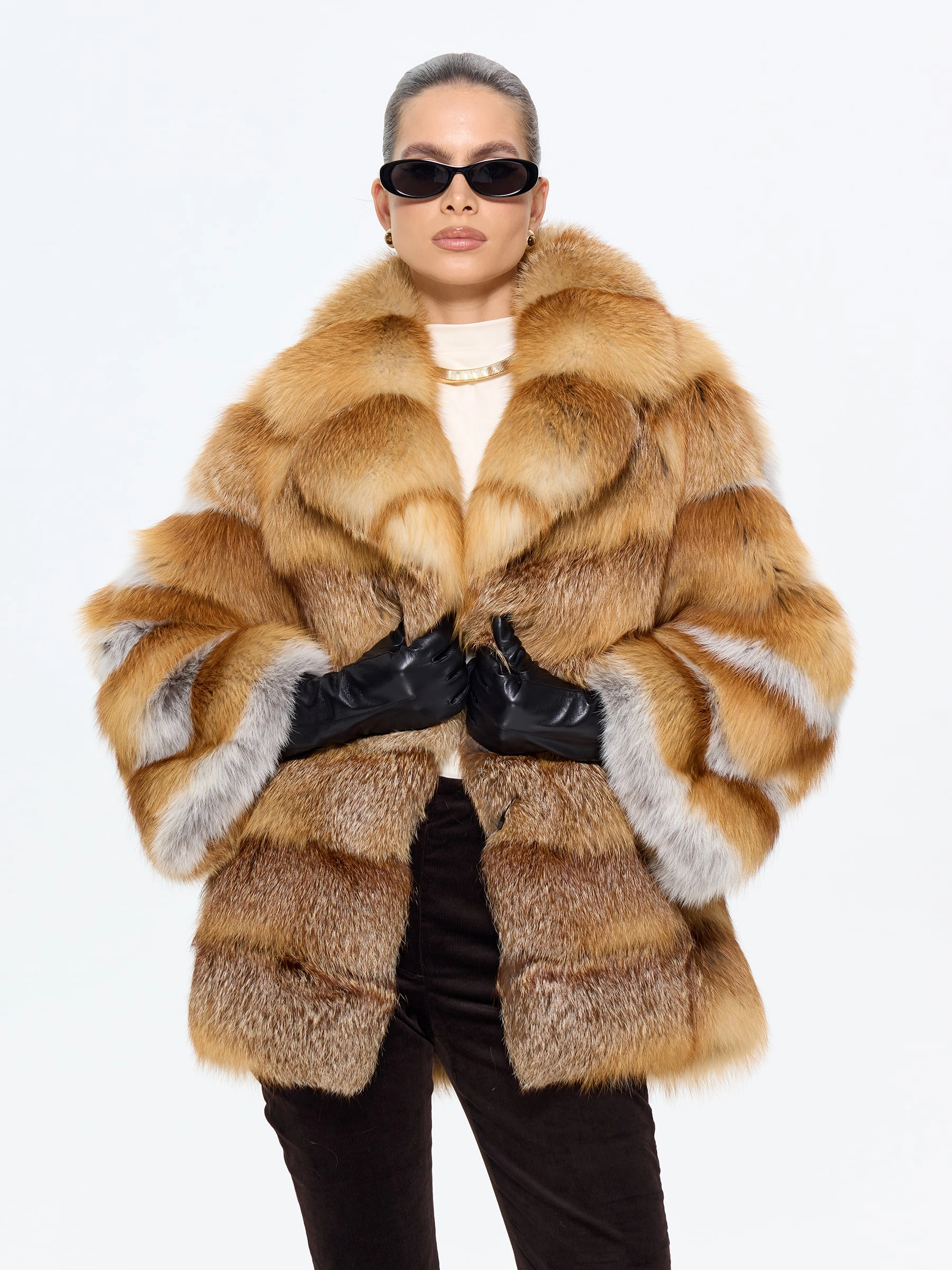 Эффектная короткая шуба из меха лисы с элегантным английским воротником — для тех, кто не боится заявить о своем стиле! Модель длиной 70 см с прямым силуэтом и смечными рукавами кимано подчеркивает индивидуальность, а роскошный мех создает объем и драматизм. Стилисты рекомендуют носить эту дерзкую модель с кожаными брюками и грубыми ботинками для создания уличного образа или с облегающим платьем и сапогами-ботфортами для вечернего выхода — она станет главным акцентом вашего гардероба, подчеркивающим смелый и современный вкус.