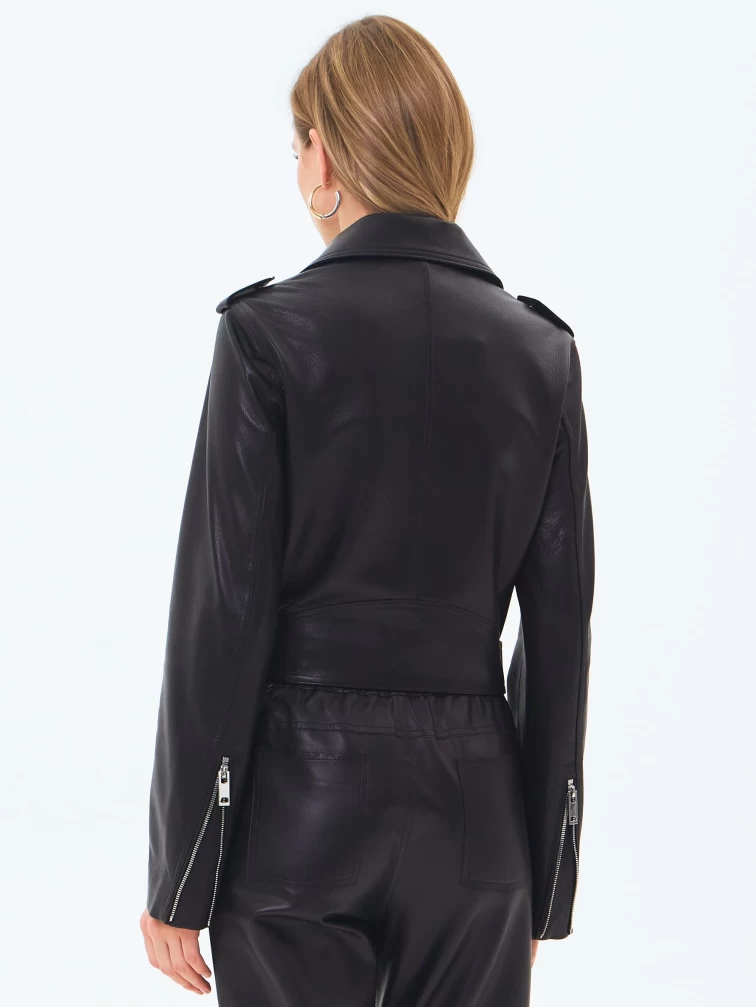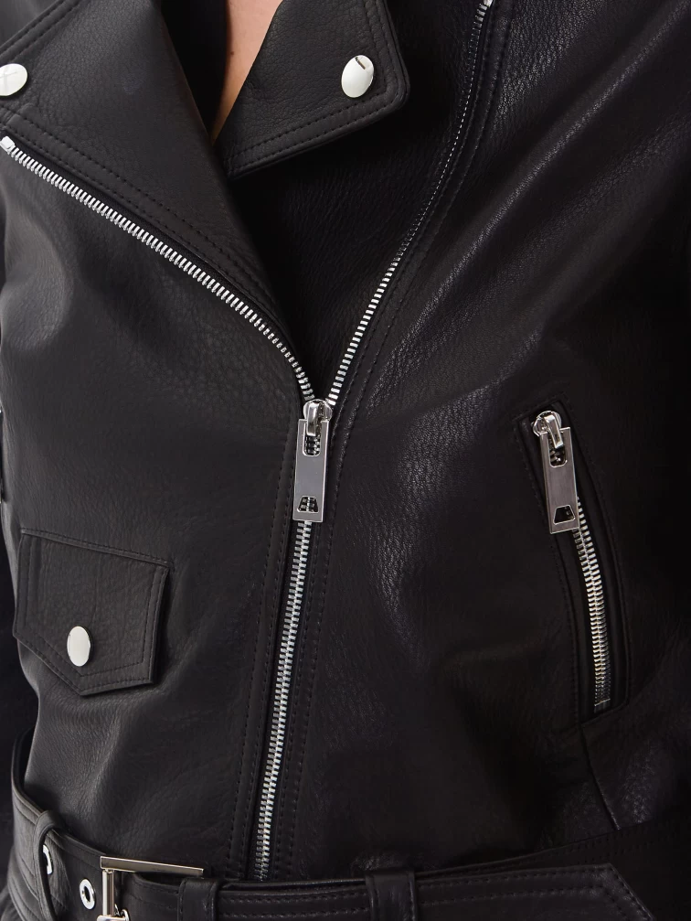 Укороченную косуху с широкими лацканами выполнили из тонкой тесненой кожи премиум класса. Куртку прямого силуэта с погонами дополнили съемным ремнем с пряжкой.Сама модель, манжеты и два кармана застегиваются крупными молниями.