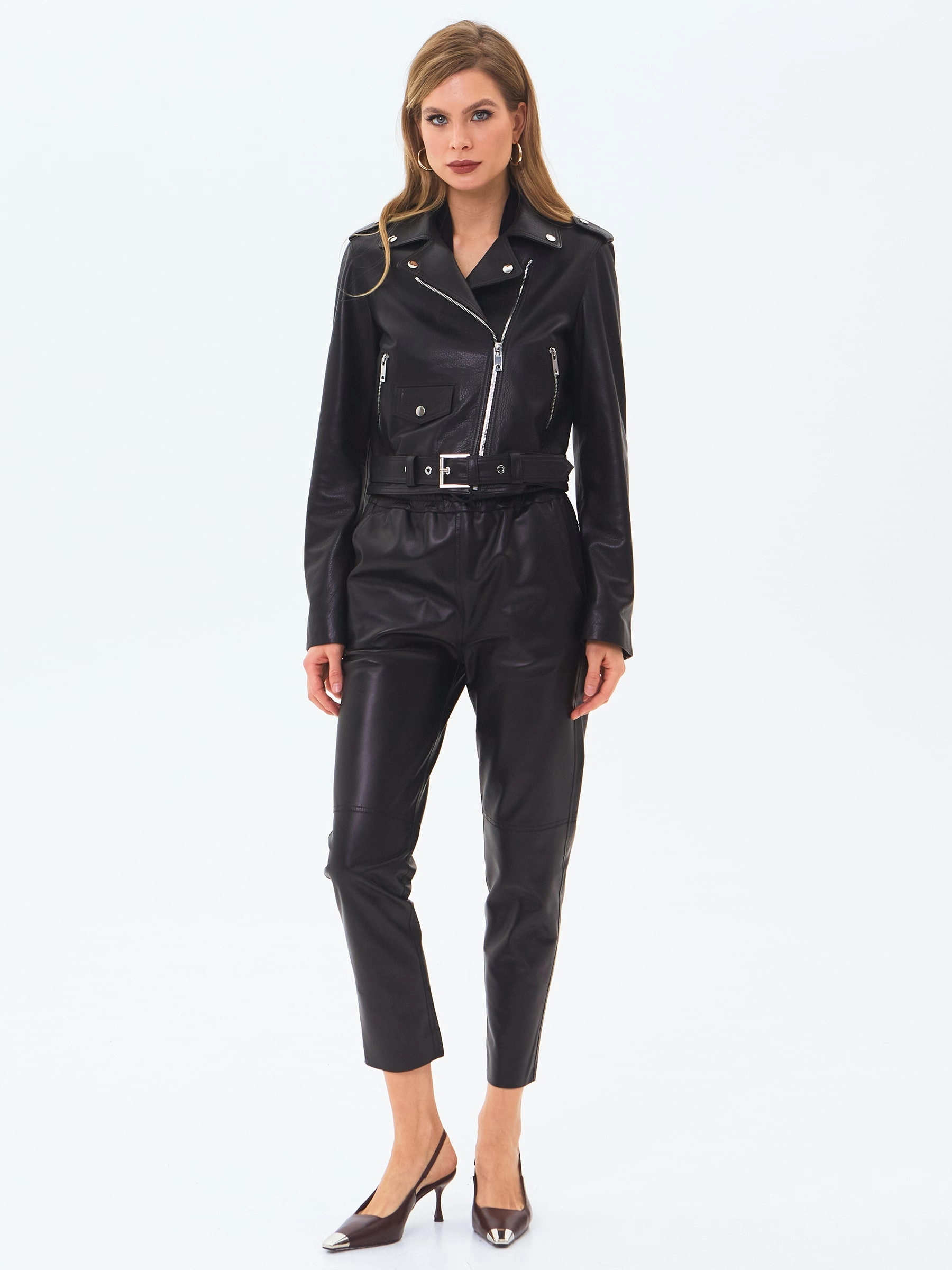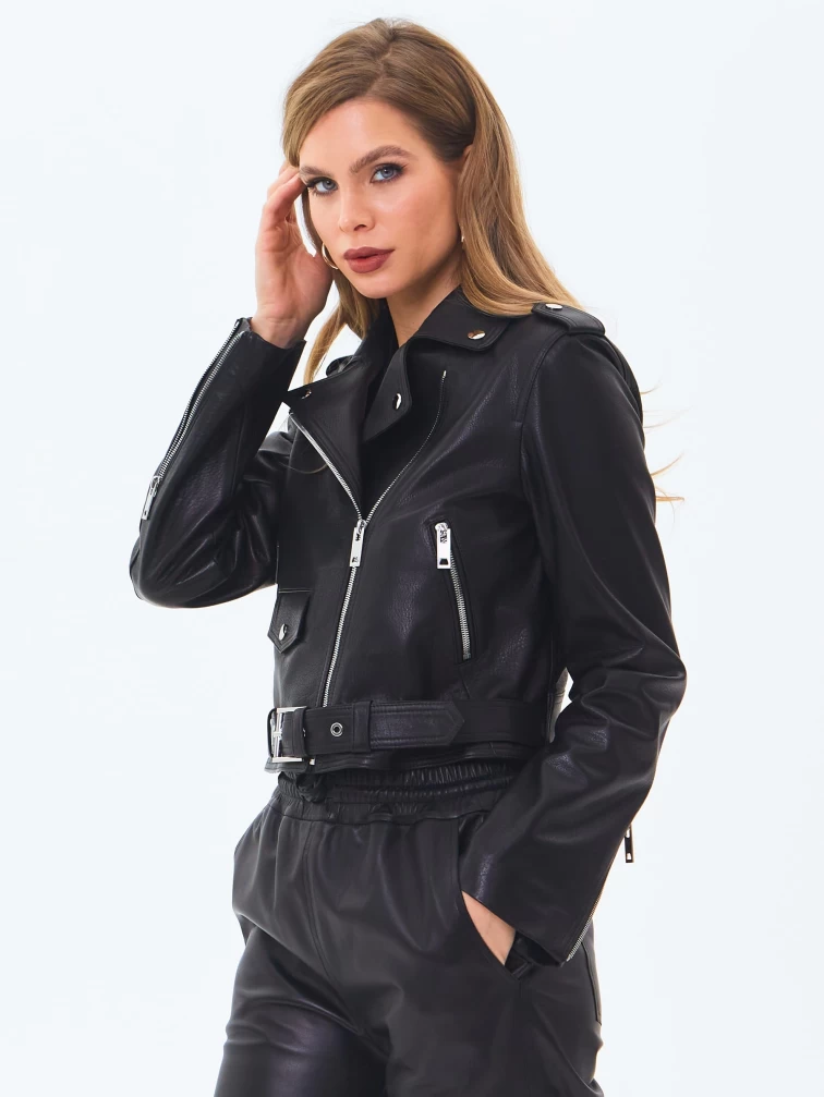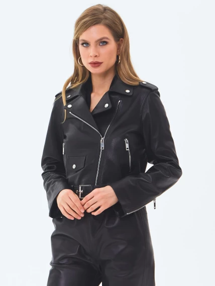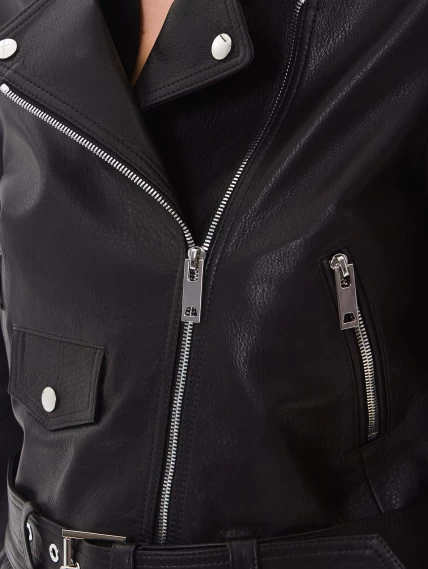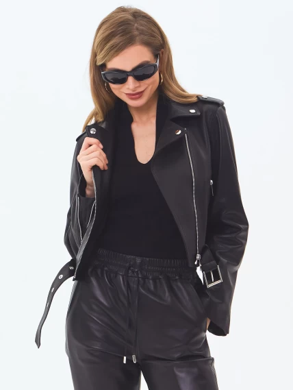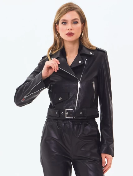 Женская кожаная куртка косуха с поясом премиум класса 3080, черная, размер 42, артикул 24540