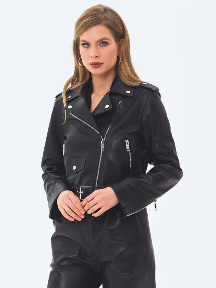 Товар женская кожаная куртка косуха с поясом премиум класса 3080, черная, размер 42, артикул 24540 выполнен из натуральной кожи с застежкой молния. Рассчитан на сезон: весна-лето. Длина изделия 46 см, силуэт прямой.